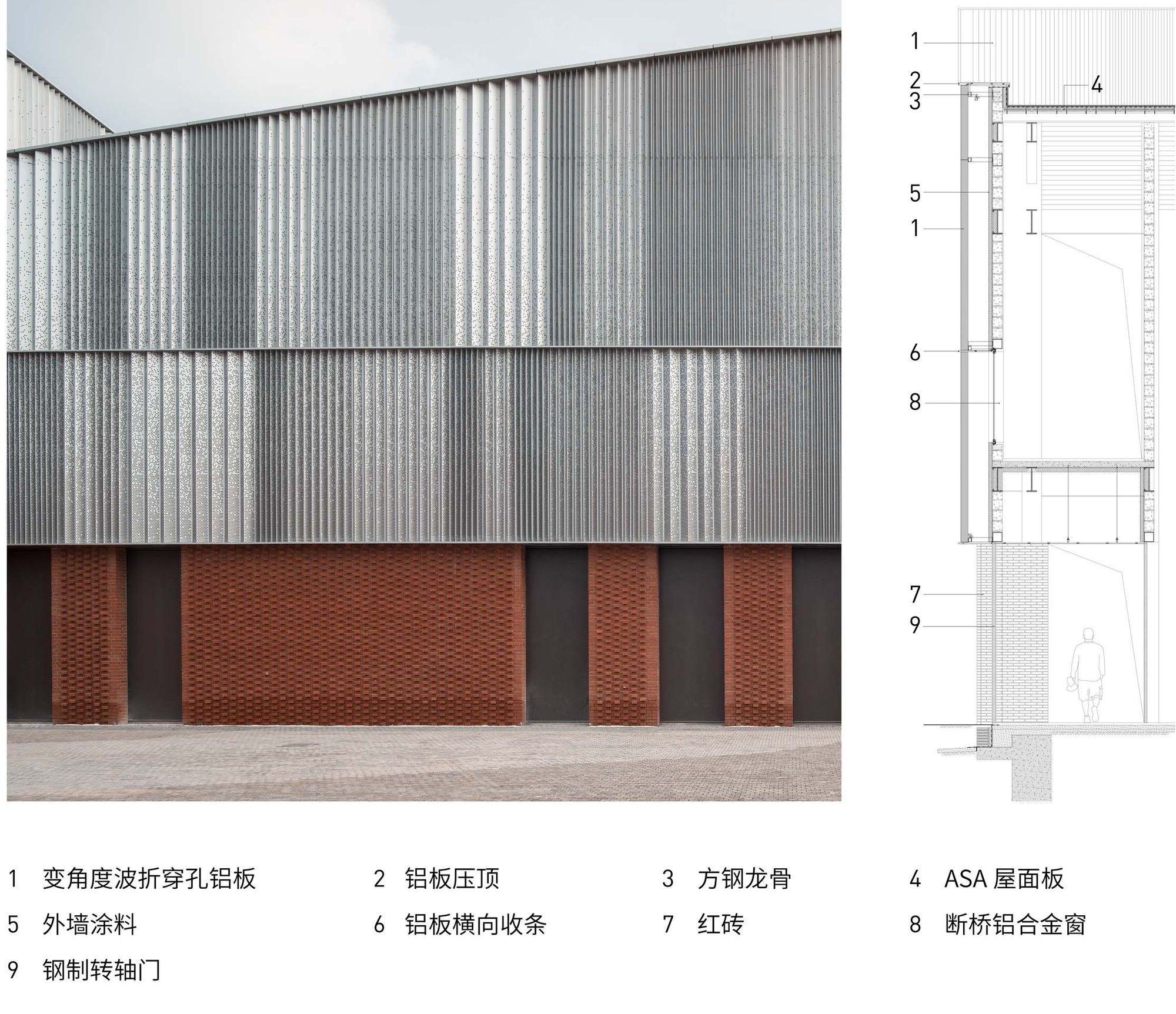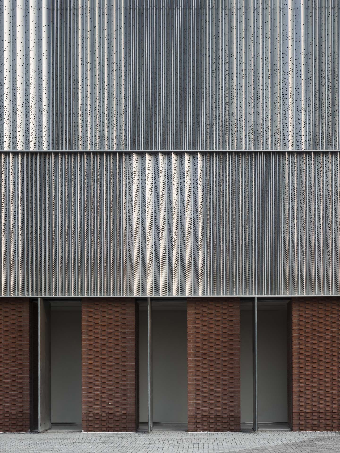 To re-conceptualize the industrial past in a contemporary context, it is translated into the combination of 3 threads of materiality: the metal cladding that shifts between reflectivity and translucency interpreting the contemporary cultural sensitivity; the shadowing surface of red brick wall responding the historic character of the site; the large transparent glass openings and large pivot doors revealing the “inside” of the vessel to the public.