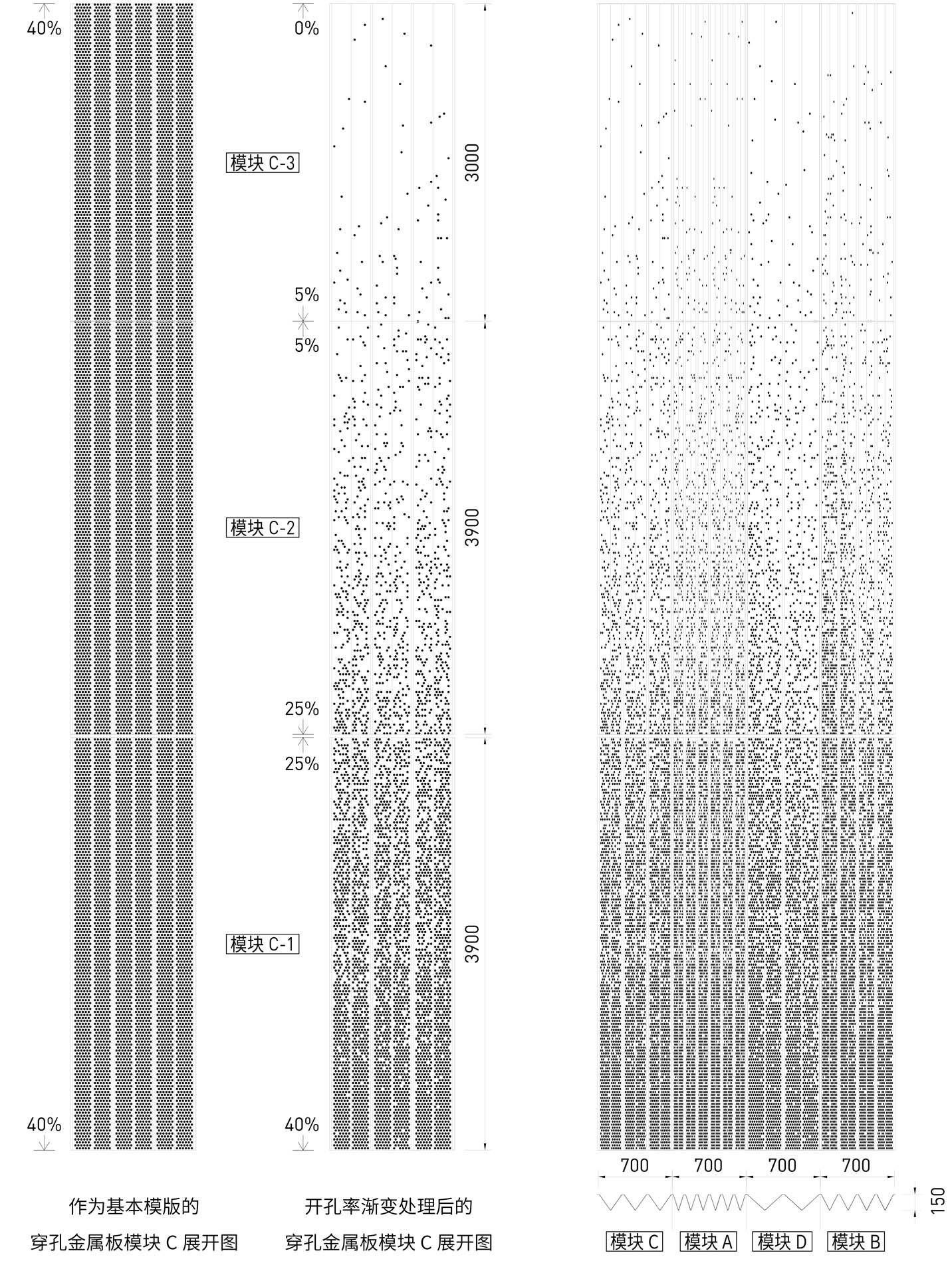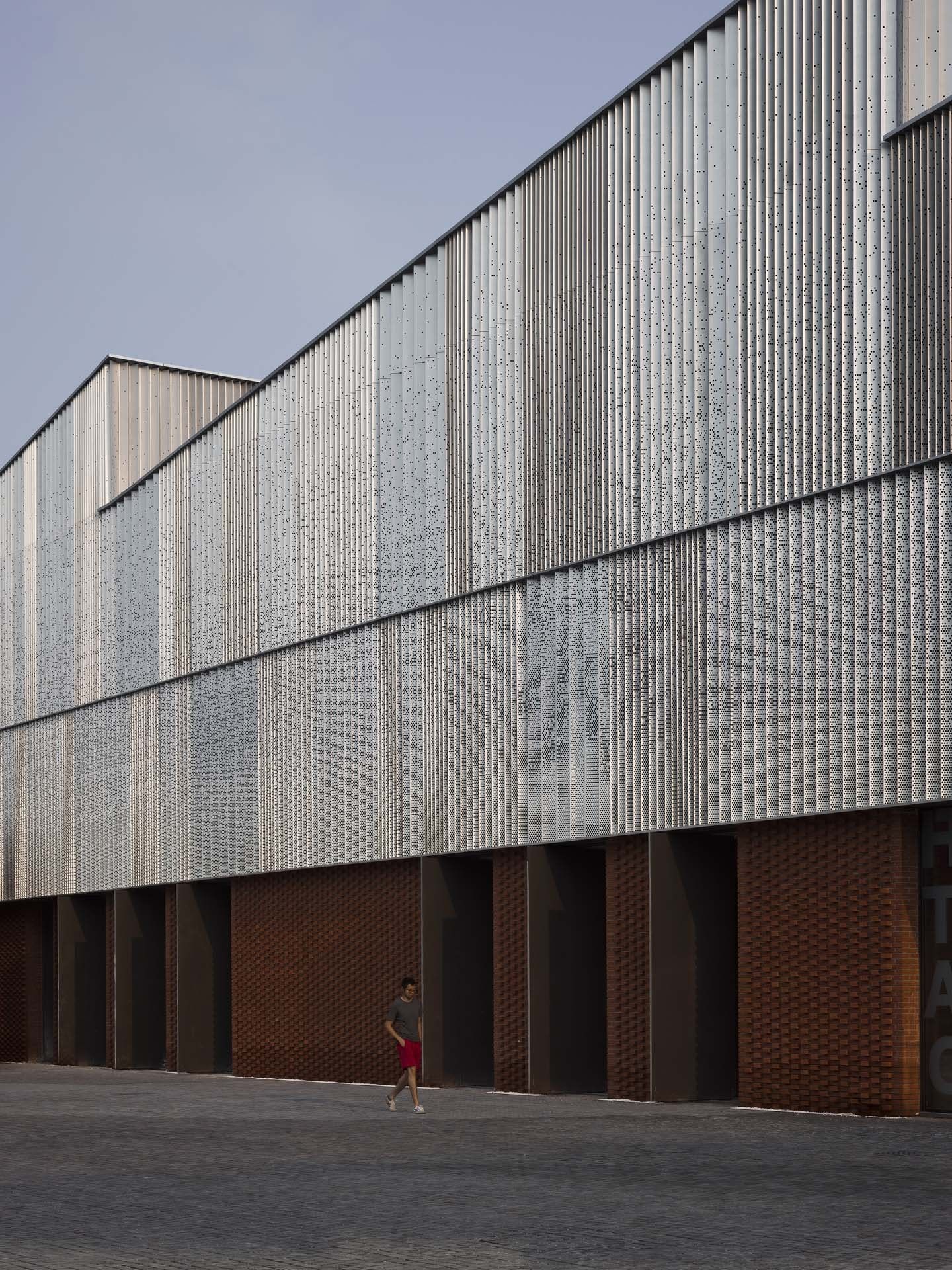 HeyTown Art Center features an aluminum façade wrapping around the entire suspended saw-tooth volume. Instead of perusing a smooth and sleek image of a definite “newness” that the usage of metal usually bring to such context, it was taken as an experiment on potential ‘natures’ of the aluminum: minimum angle of folding, jumping rhythm of corrugations, different ratio of perforation, extreme strength of the metal for vertical span, enhanced reflectivity…all together to achieve a tangible and frictional experience of the architecture that is in constant “dialogue” with its surroundings, and to create a tension from the site’s past towards its future.