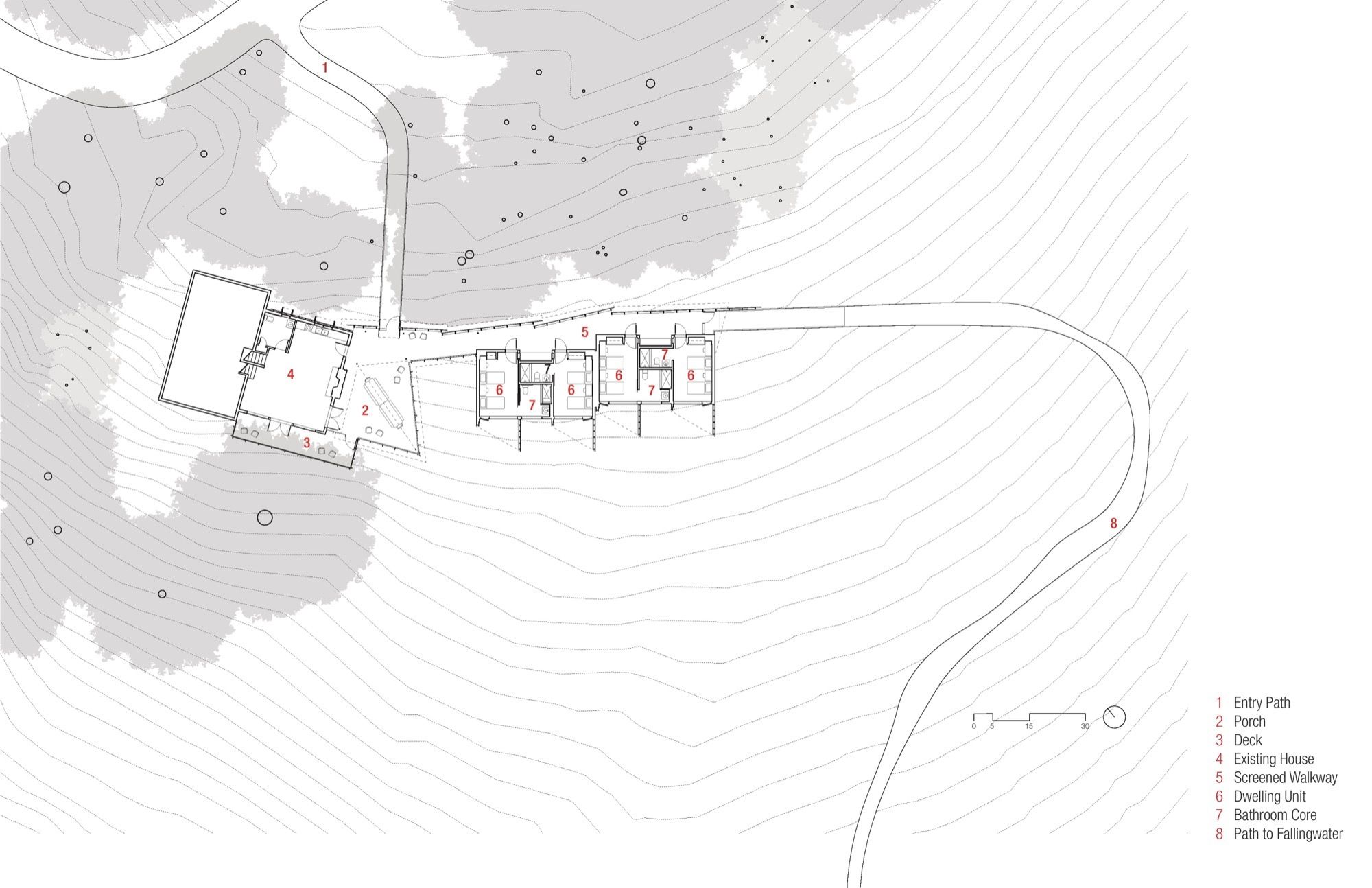 For more than 20 years, Falling water has sponsored onsite residency programs for students in high school, college, and graduate school as well as teachers, lifelong learners, and artists-in-residence. The original split-level cabin, High Meadow, which served as the main residence for participants, was not large enough to meet the program demands. Several years ago a decision was made to expand lodging to accommodate the vision for expanded educational programming.