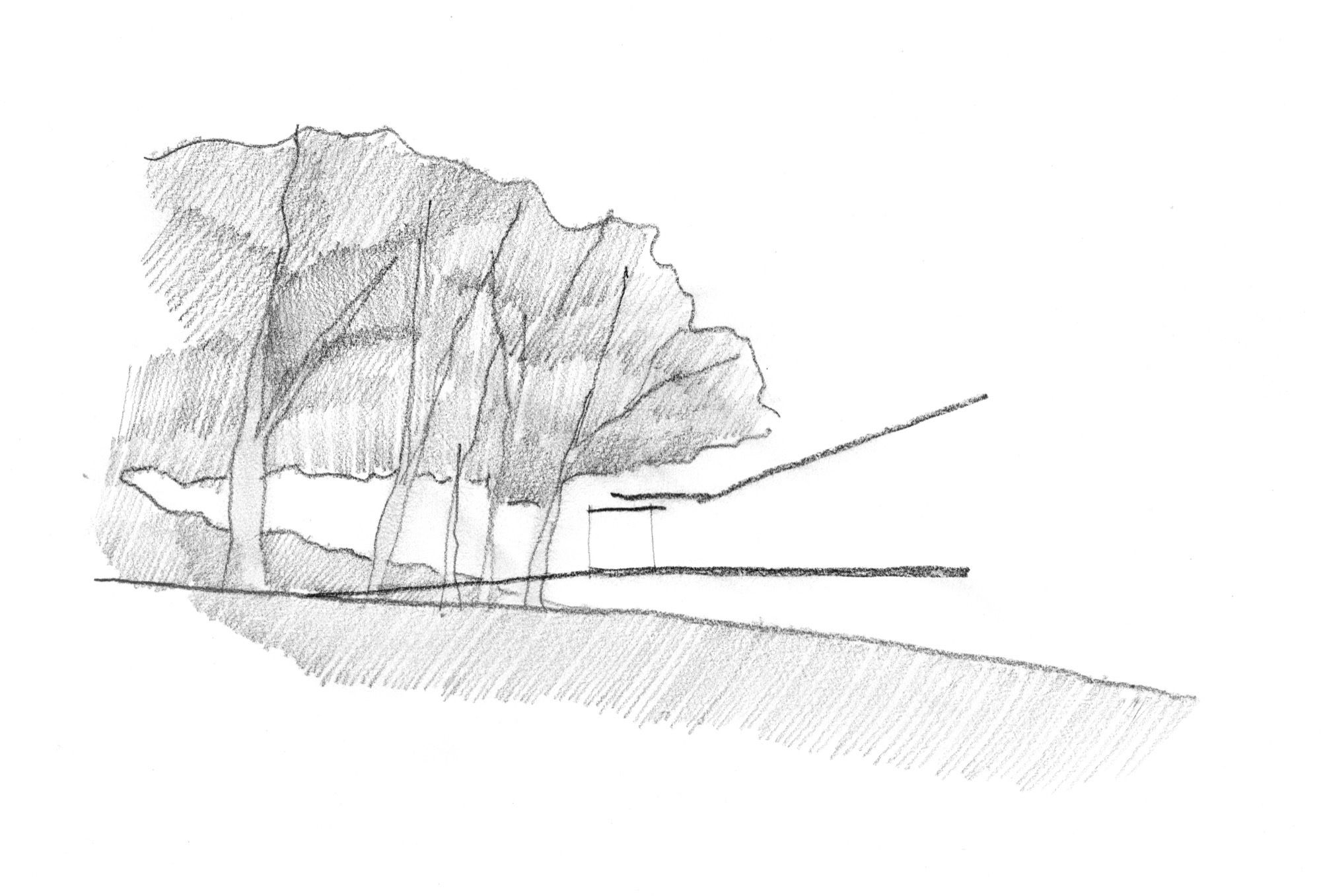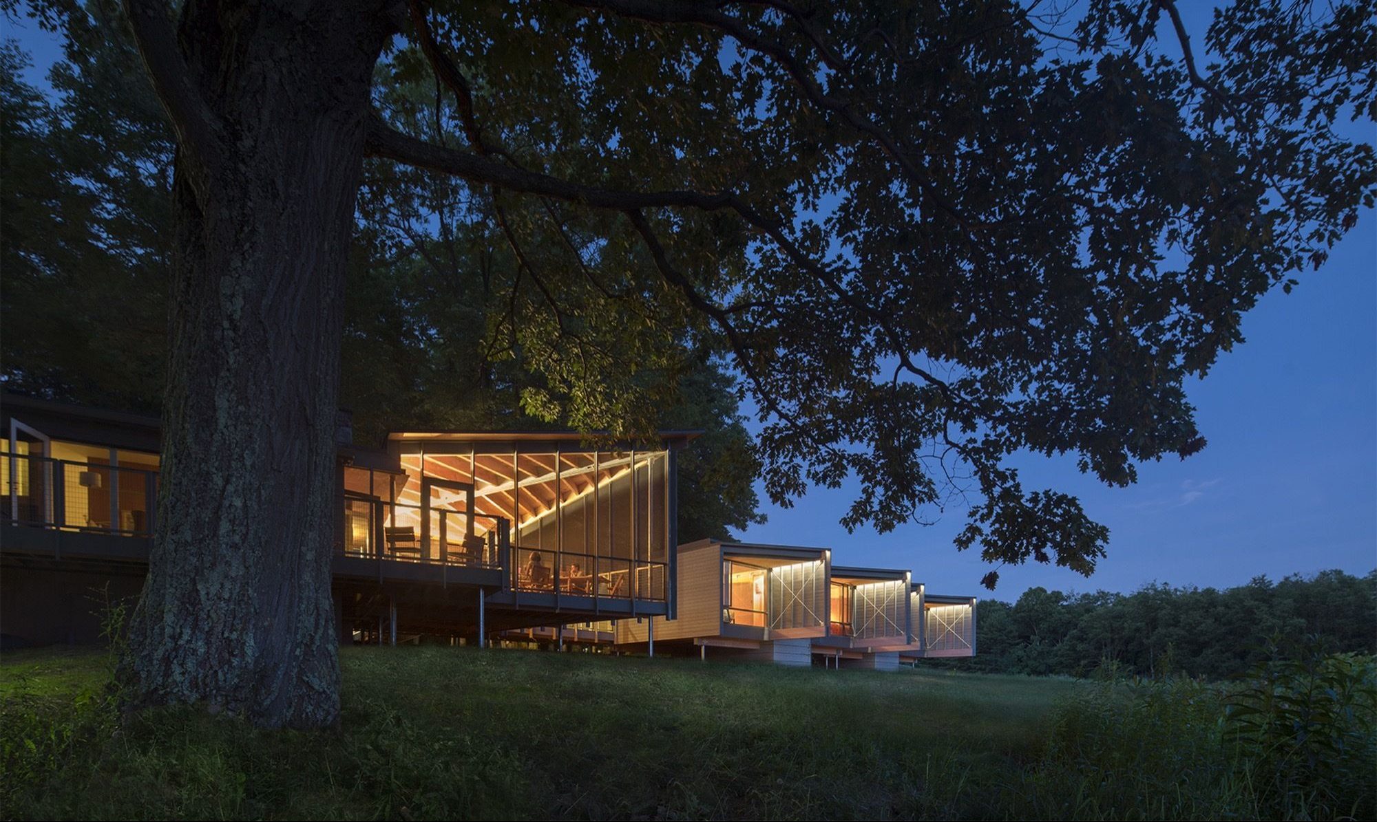 Positioned between forest and field, four modest dwellings with simple wood interiors and framed vistas of the surrounding hilltops rest lightly above ground on a network of nimble steel columns and delicate tectonics, imparting minimal disturbance to the site. An angled shroud at the end of each unit catches cool breezes rising up from the valley floor below and shields the naturally ventilated rooms from the summer sun. Screened entry doors allow for additional airflow and connect the units to a covered walkway.