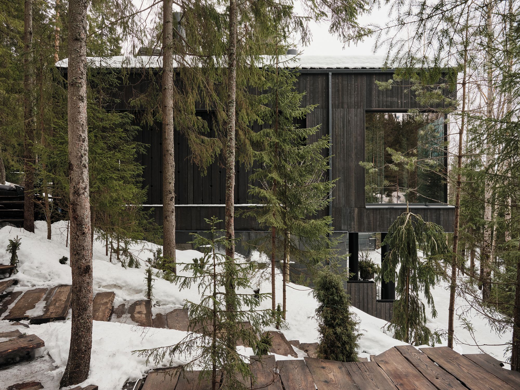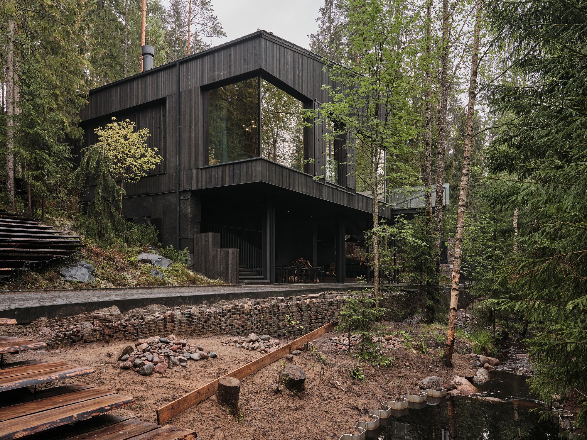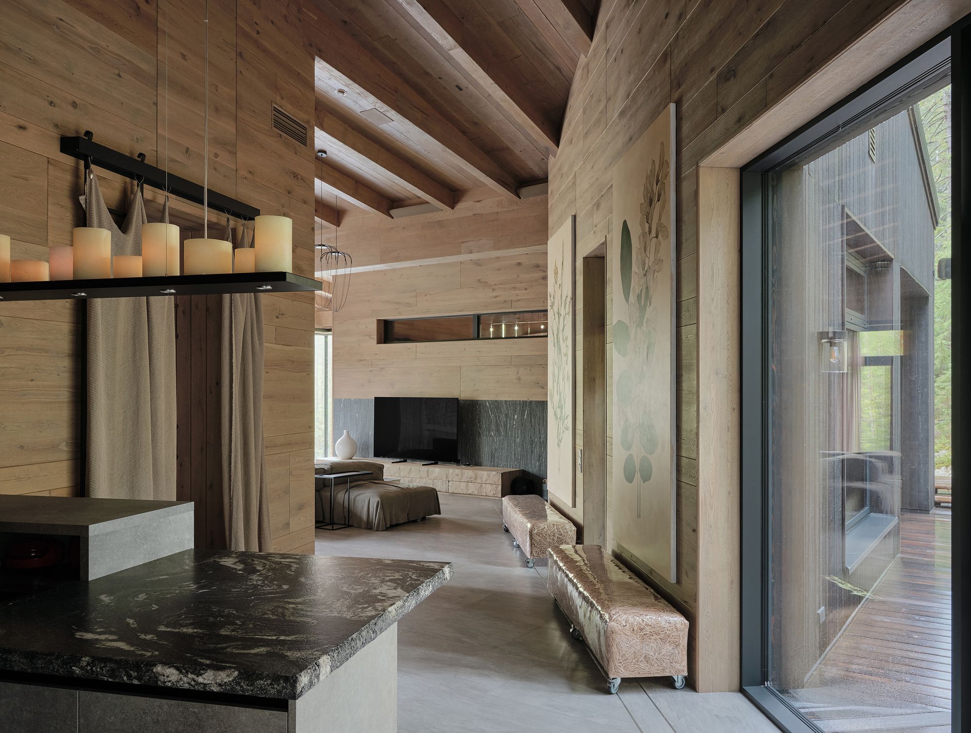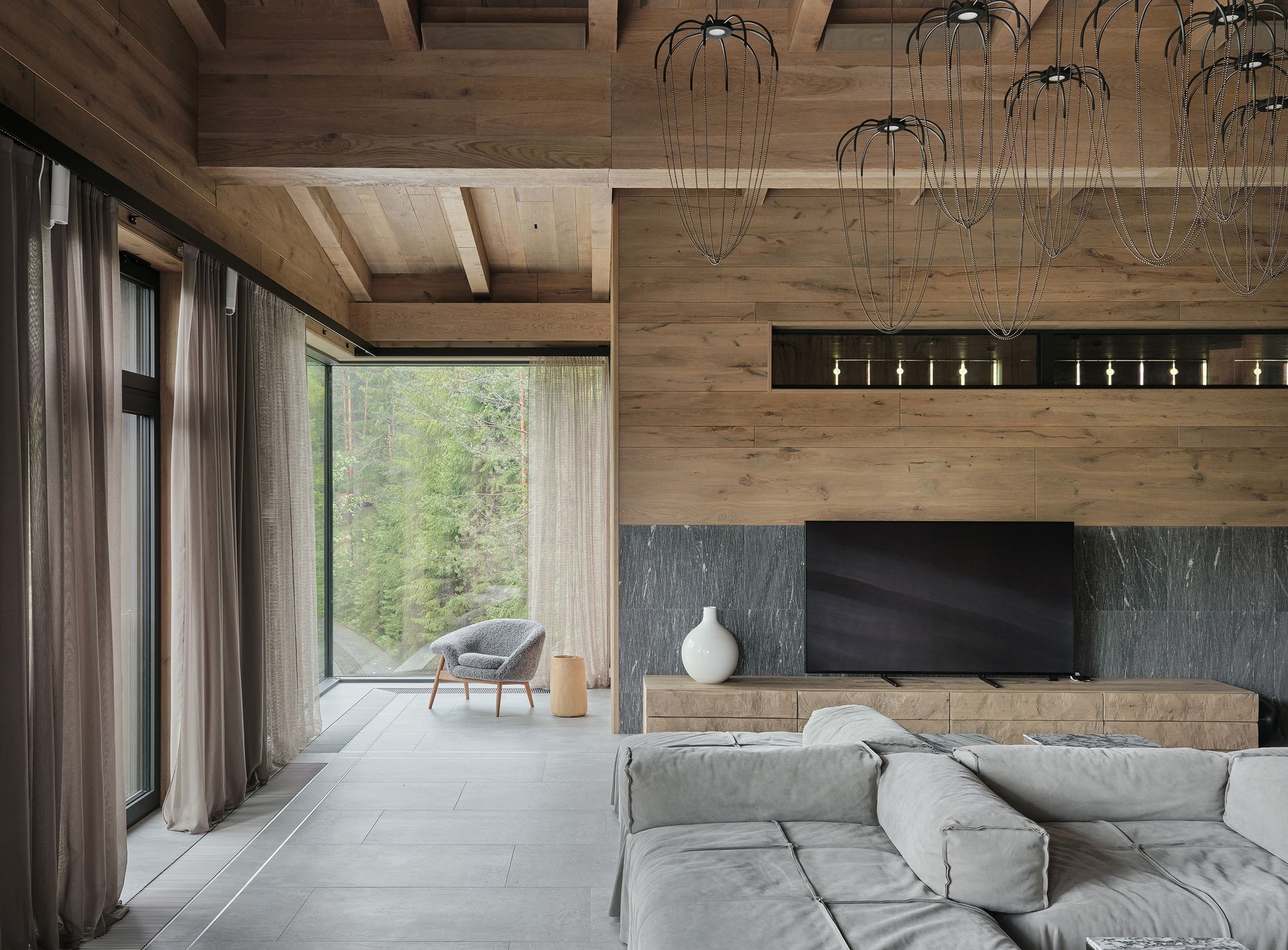 The exterior of House features a distinctive coating of gabbro-diabase, a unique black stone sourced from the Karelia region. Natural oak was selected for the interior finish of House. Additionally, to accentuate its rustic style, delicate sliding shutters with traditional Russian saw-cut carving were incorporated into the house windows of Hill House.