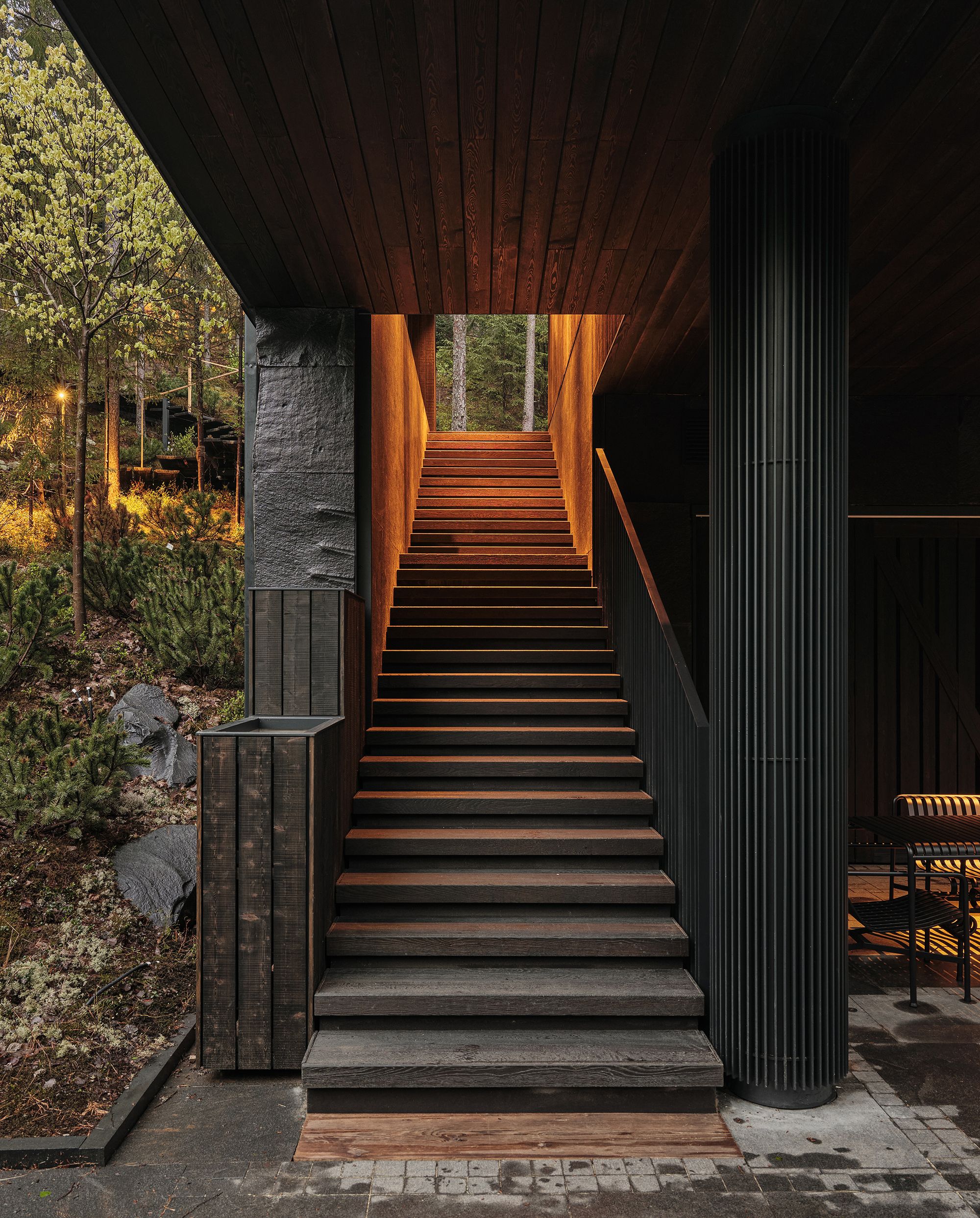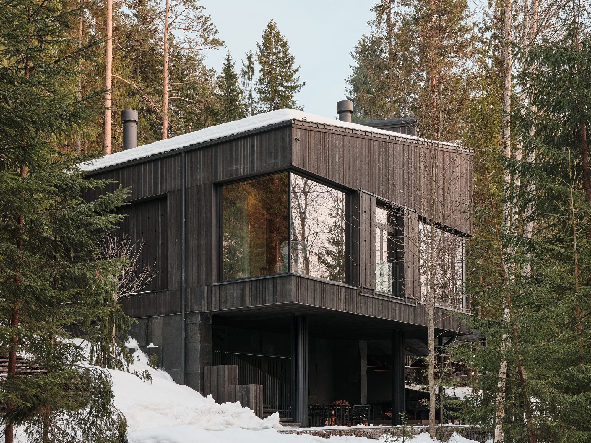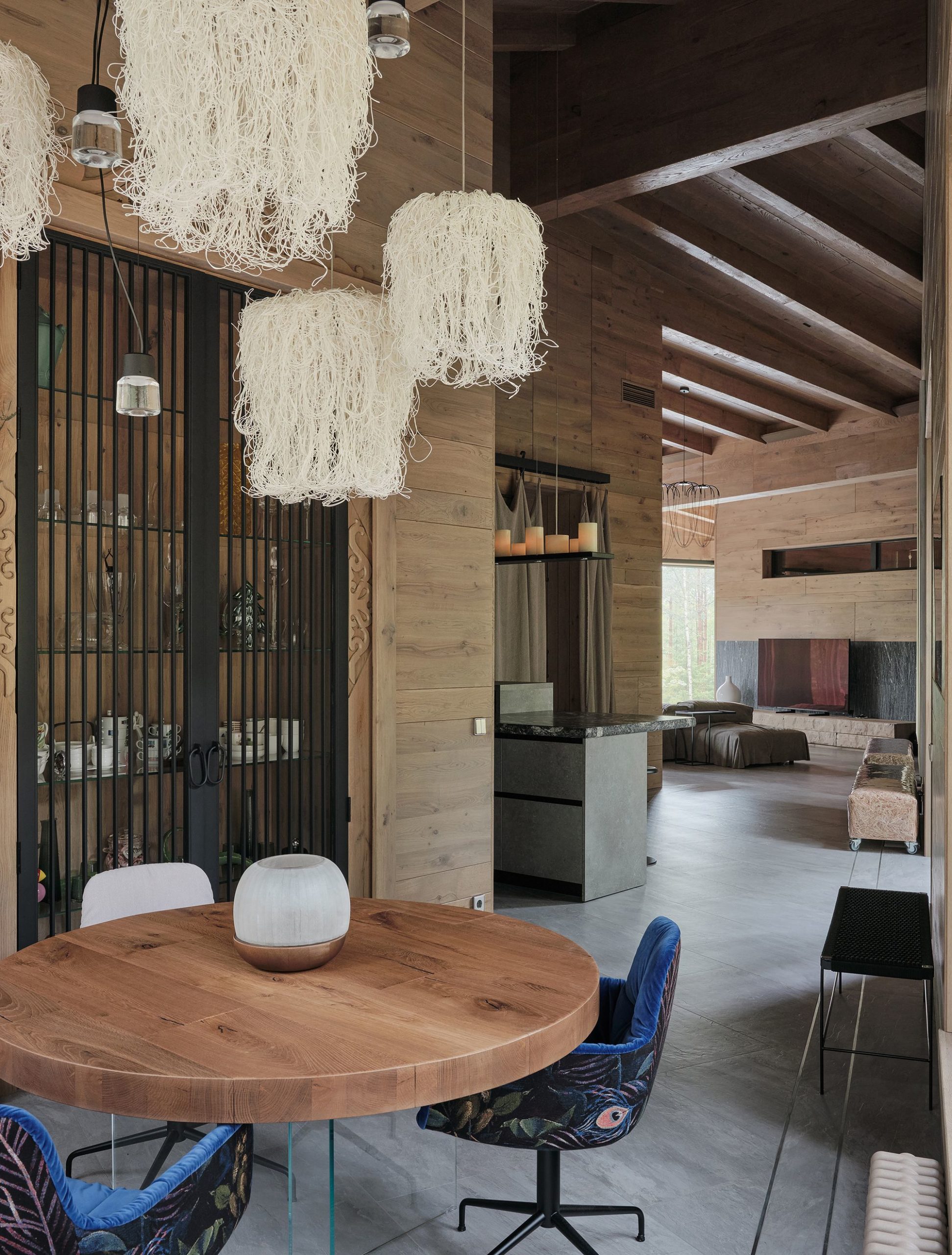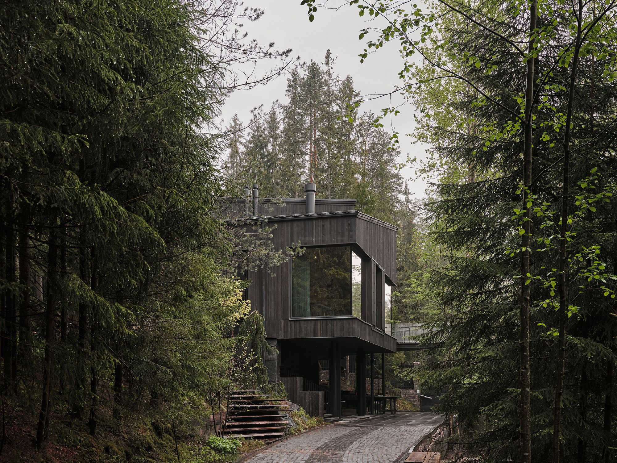 The exterior of House features a distinctive coating of gabbro-diabase, a unique black stone sourced from the Karelia region. Natural oak was selected for the interior finish of House. Additionally, to accentuate its rustic style, delicate sliding shutters with traditional Russian saw-cut carving were incorporated into the house windows of Hill House.