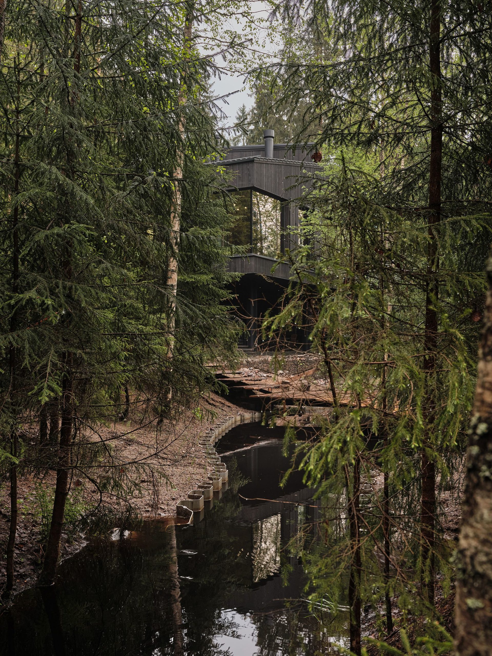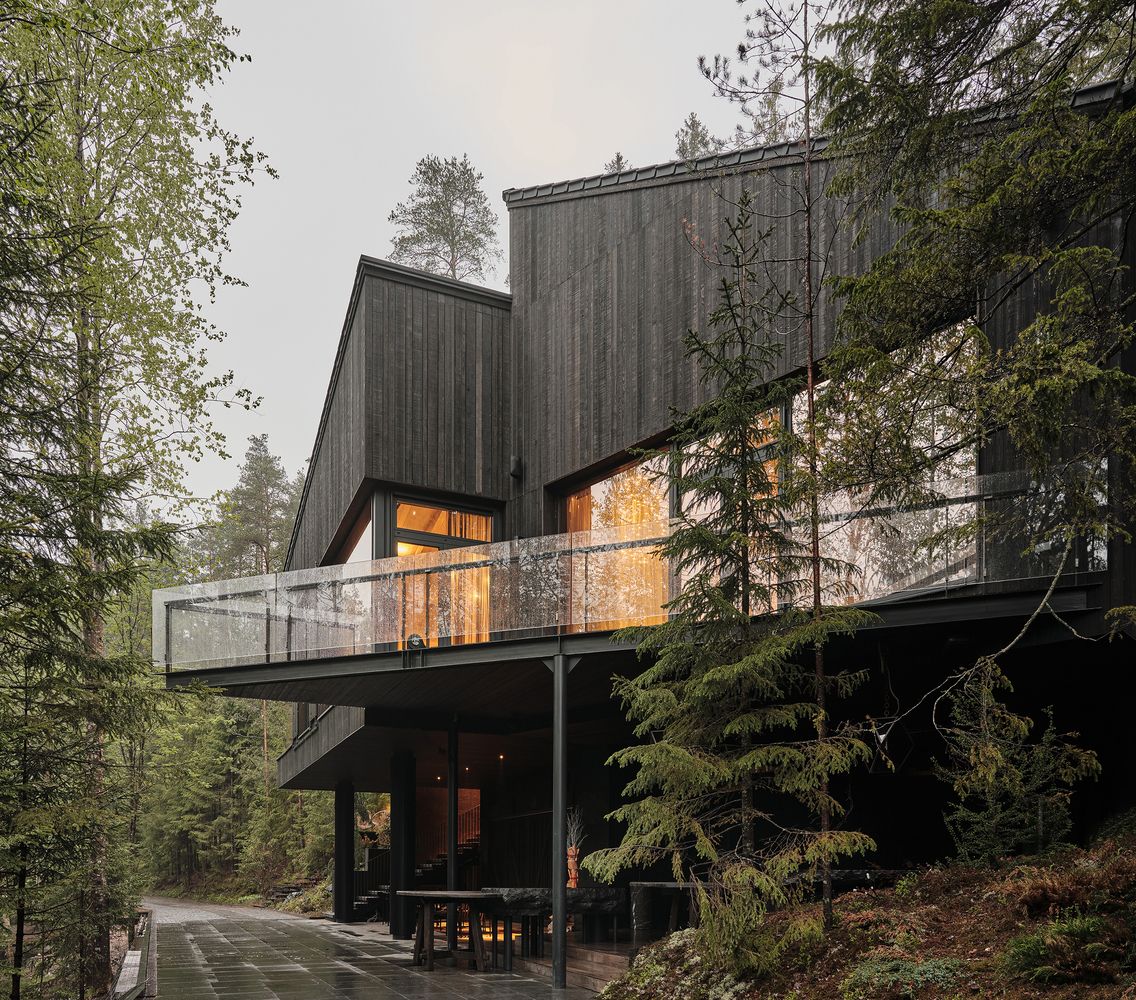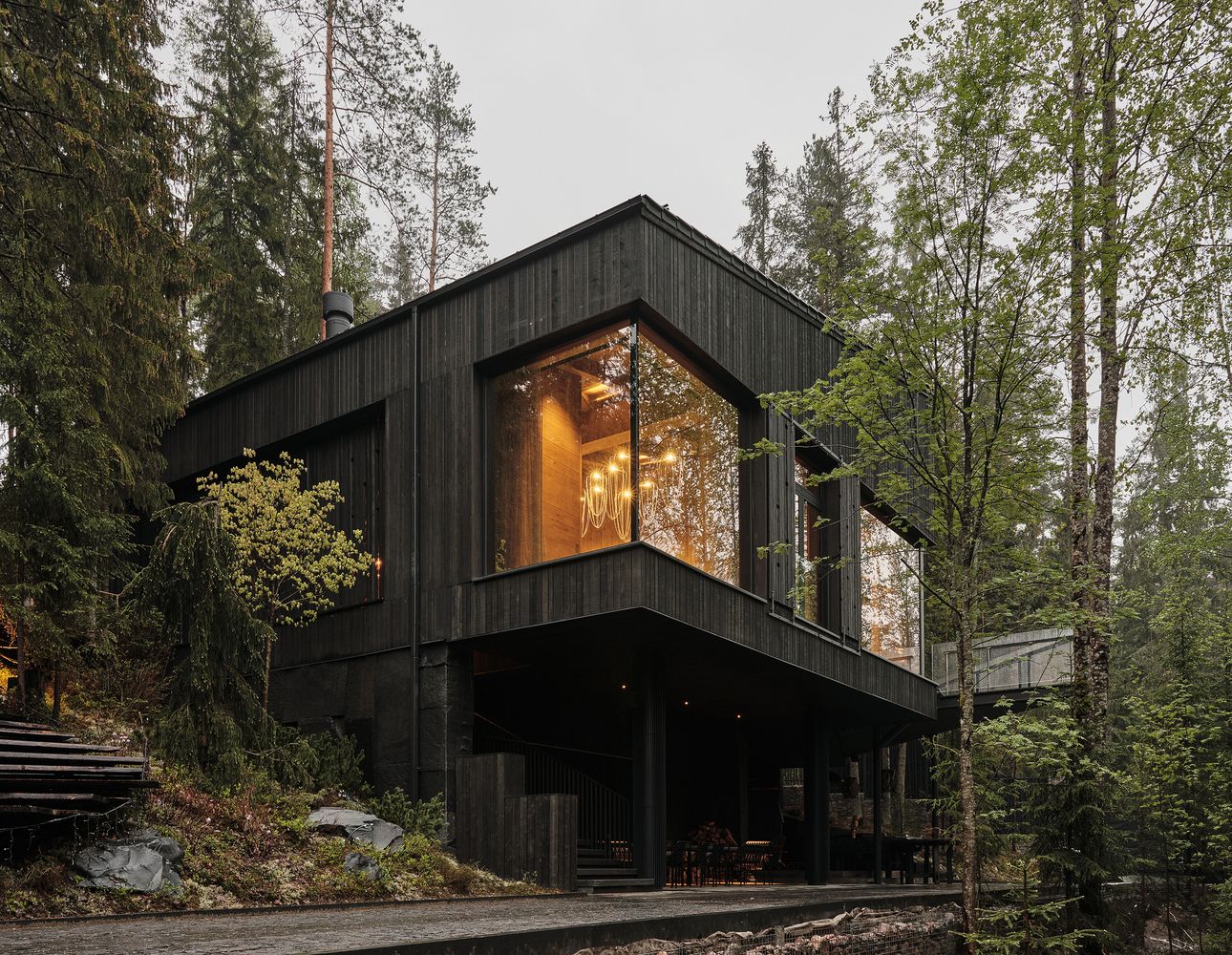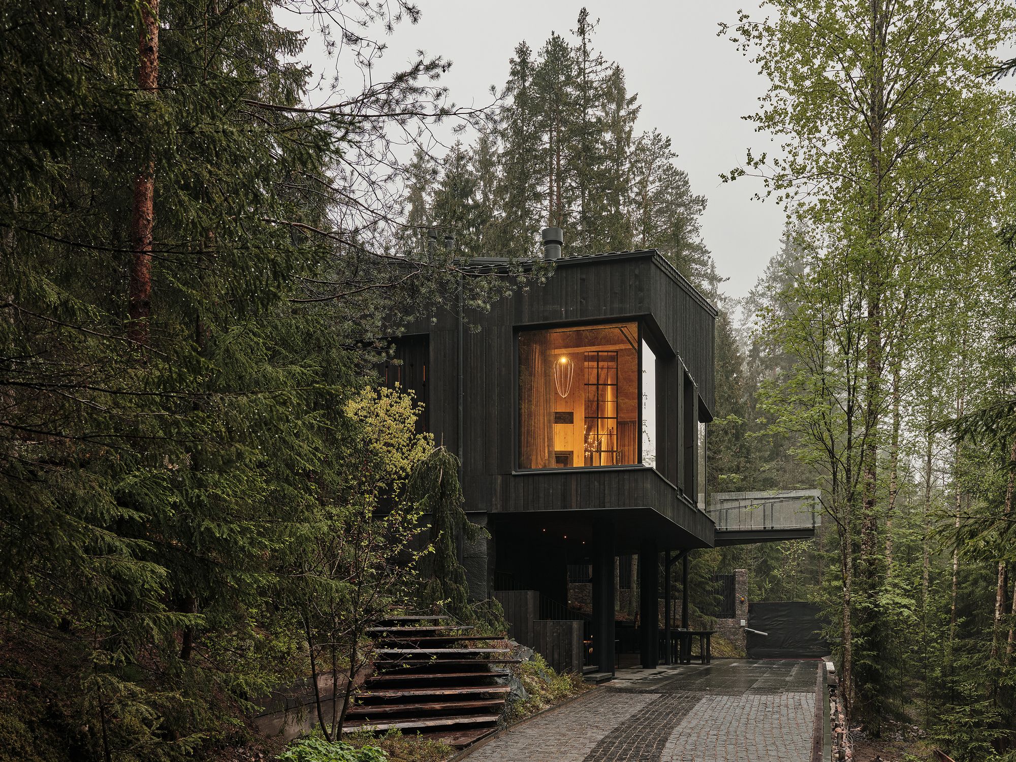 The exterior of House features a distinctive coating of gabbro-diabase, a unique black stone sourced from the Karelia region. Natural oak was selected for the interior finish of House. Additionally, to accentuate its rustic style, delicate sliding shutters with traditional Russian saw-cut carving were incorporated into the house windows of Hill House.