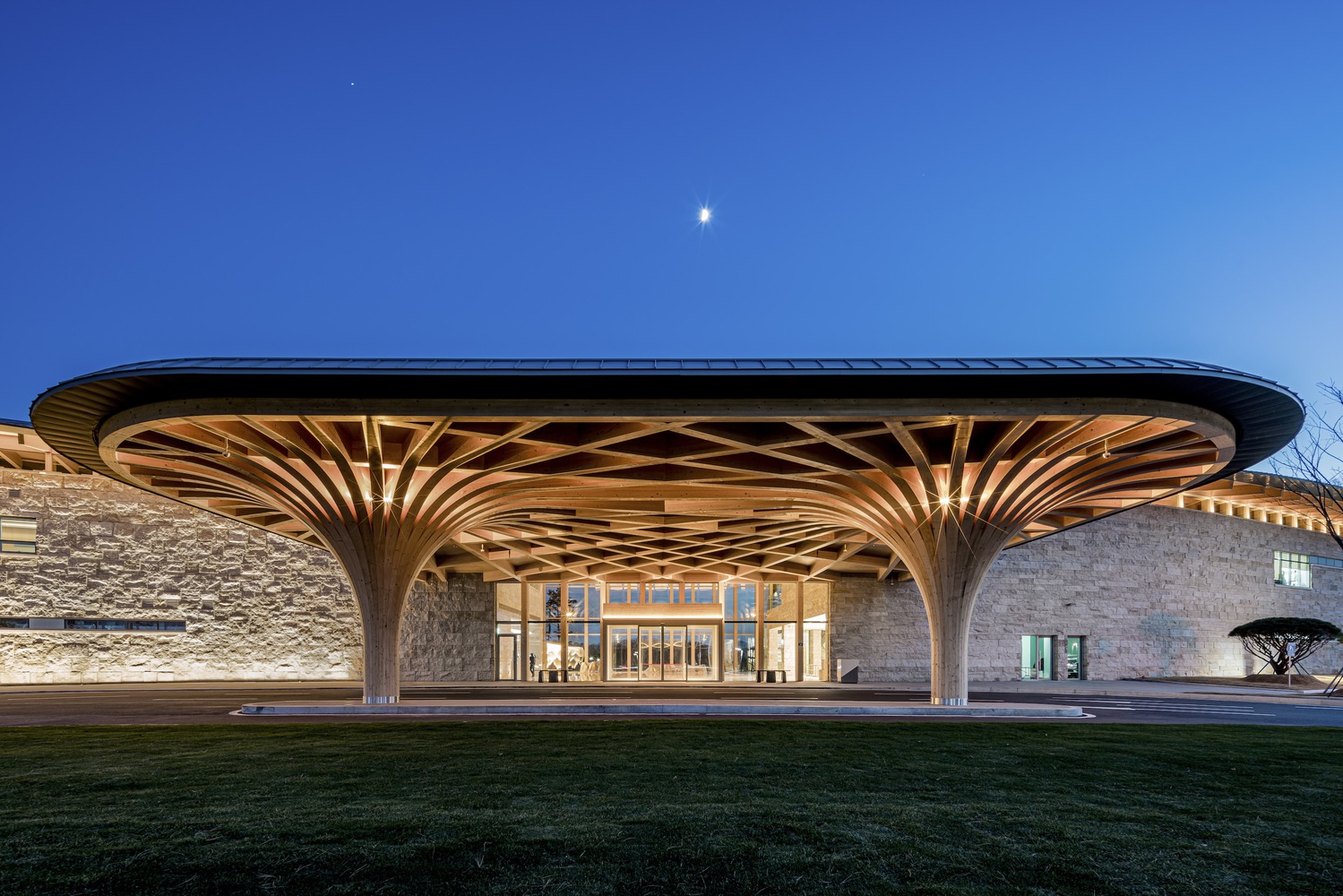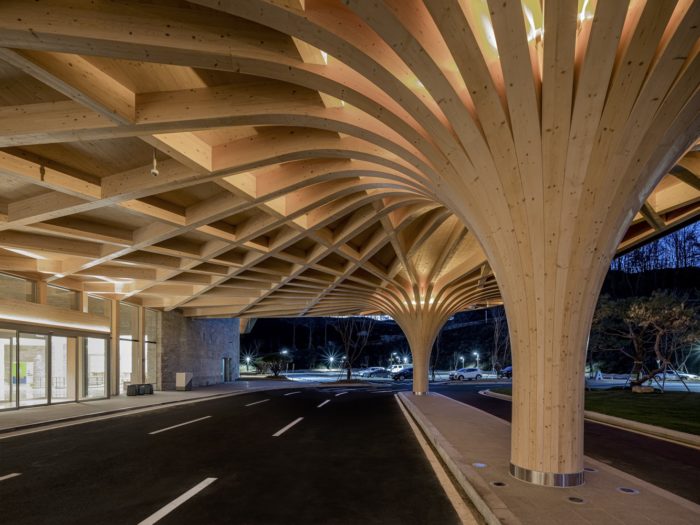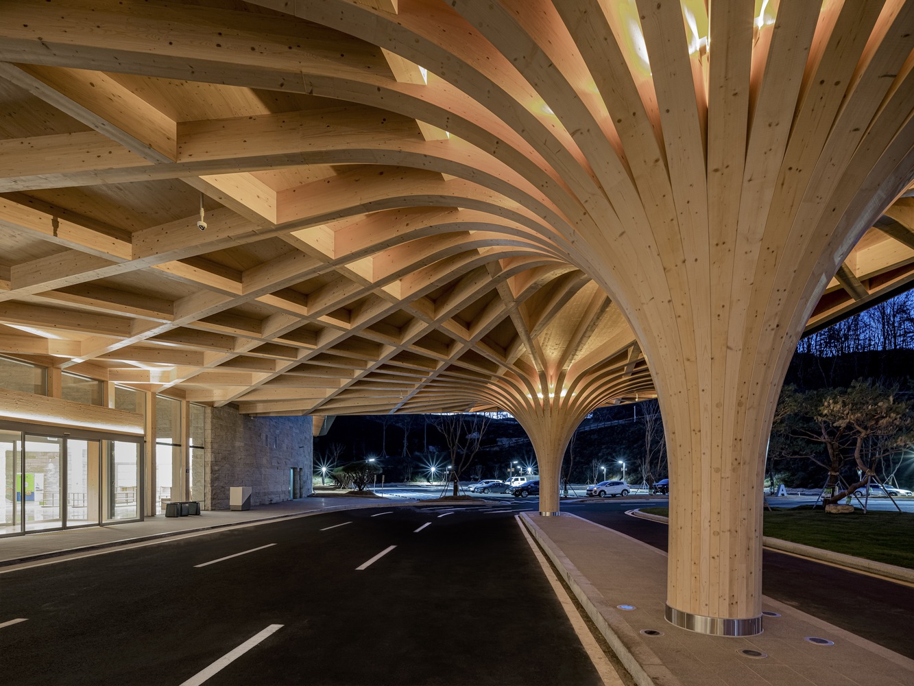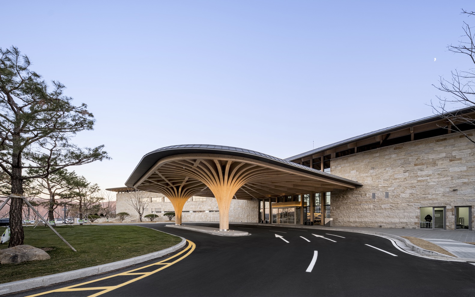 Inspired by the traditional ‘Seokkalae’ of Hanok, the distinctive pillars and beams were meticulously fashioned with Blumer-Lehmann’s glulam wooden structure, fusing concrete, steel, and wood. This not only ensured robustness and stability but also significantly expedited the construction process. The whimsical roof design, reminiscent of a soaring whale, added a dynamic twist to the structure. The outer walls were graced with a glass curtain wall, creating an enchanting illusion of the roof floating above, incredibly captivating when illuminated after dusk.