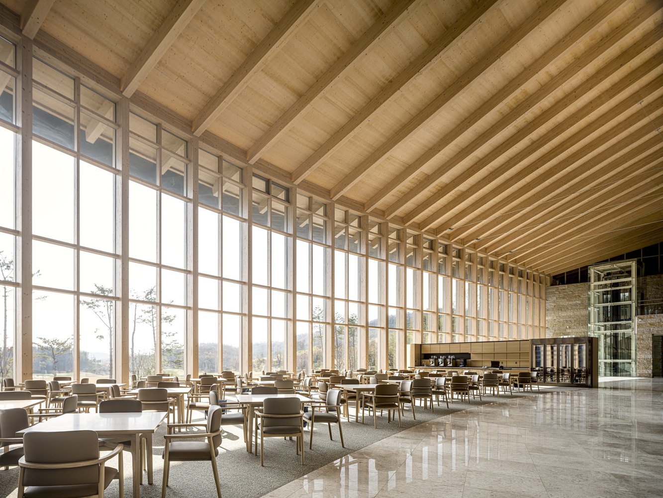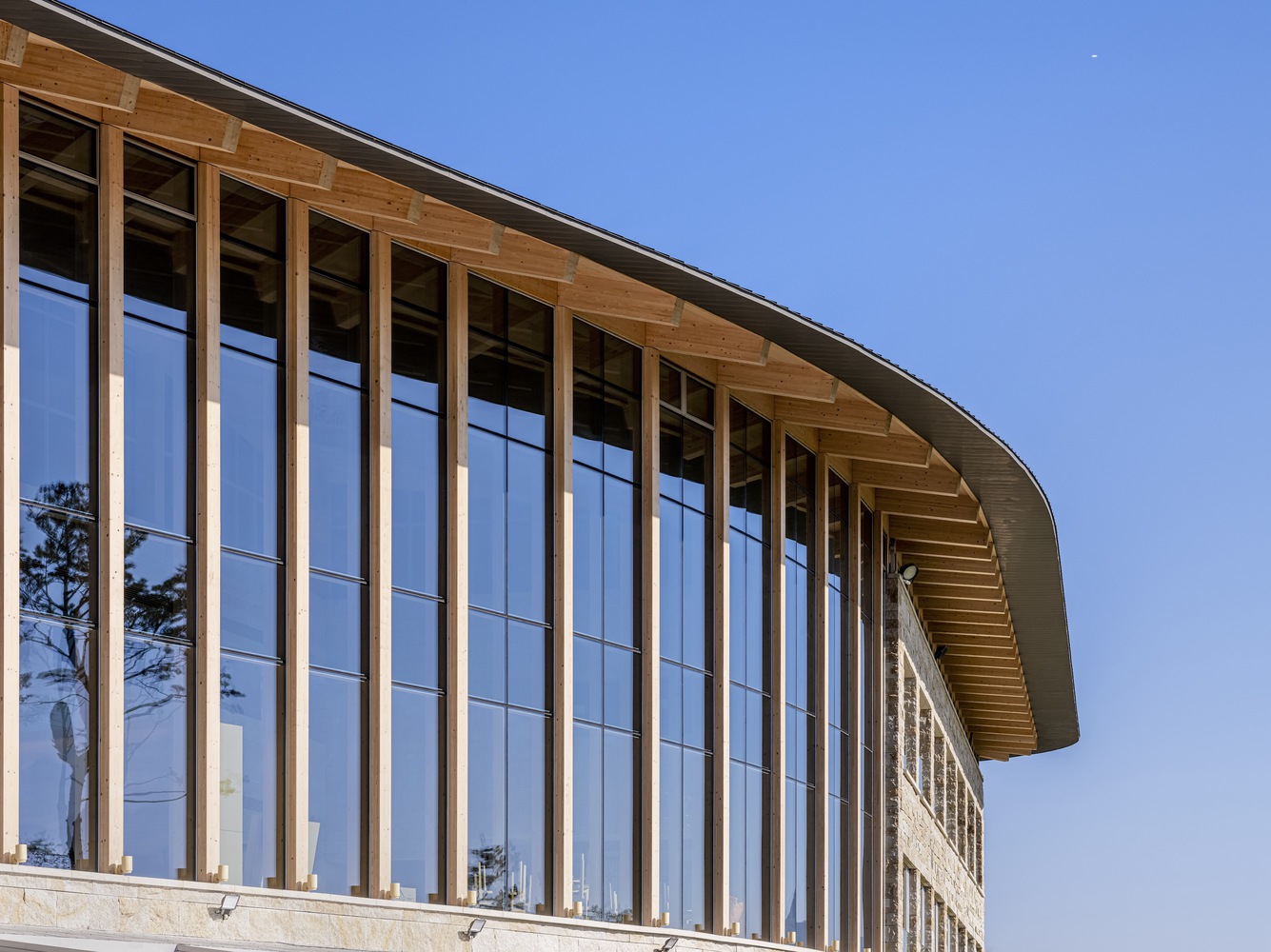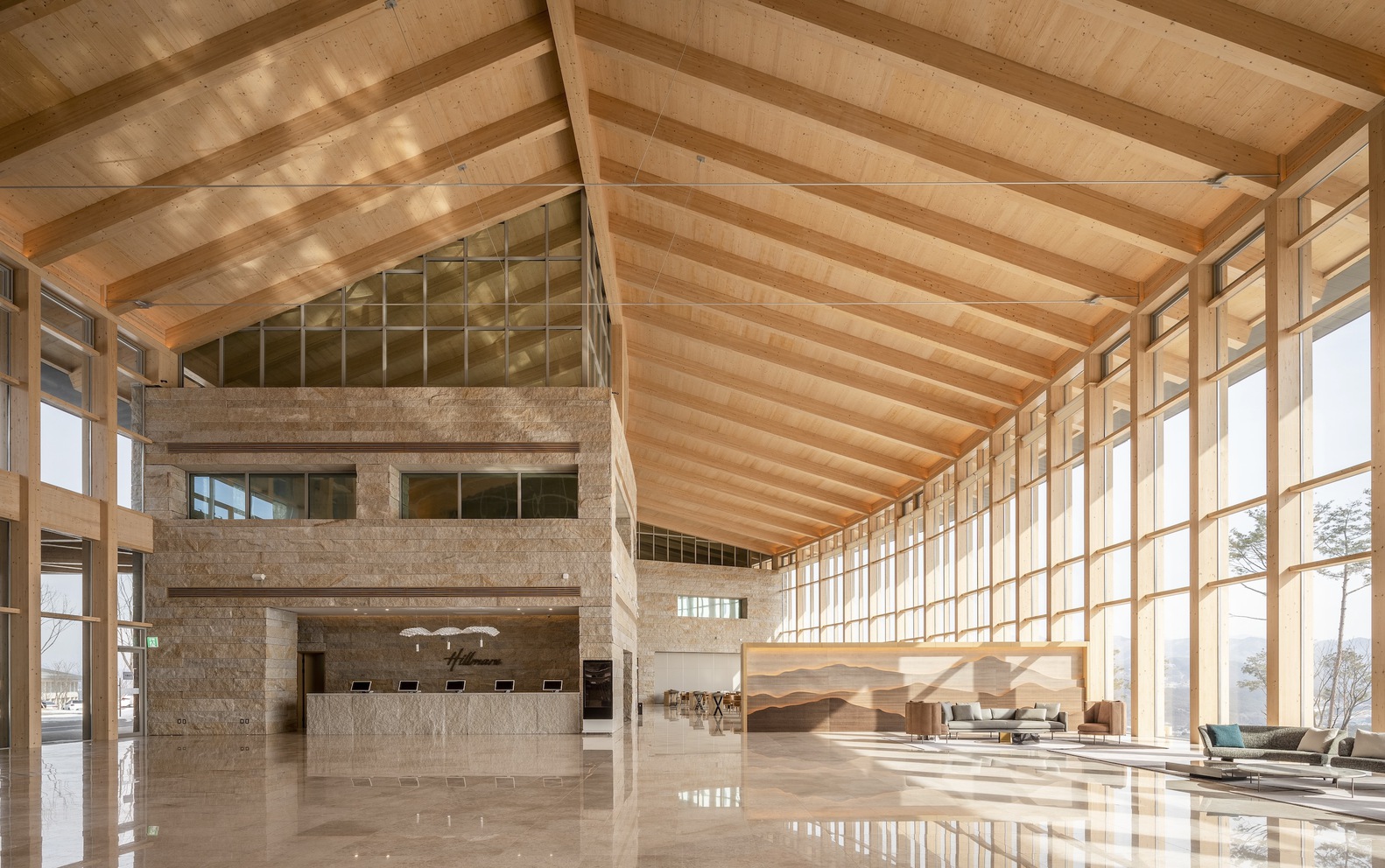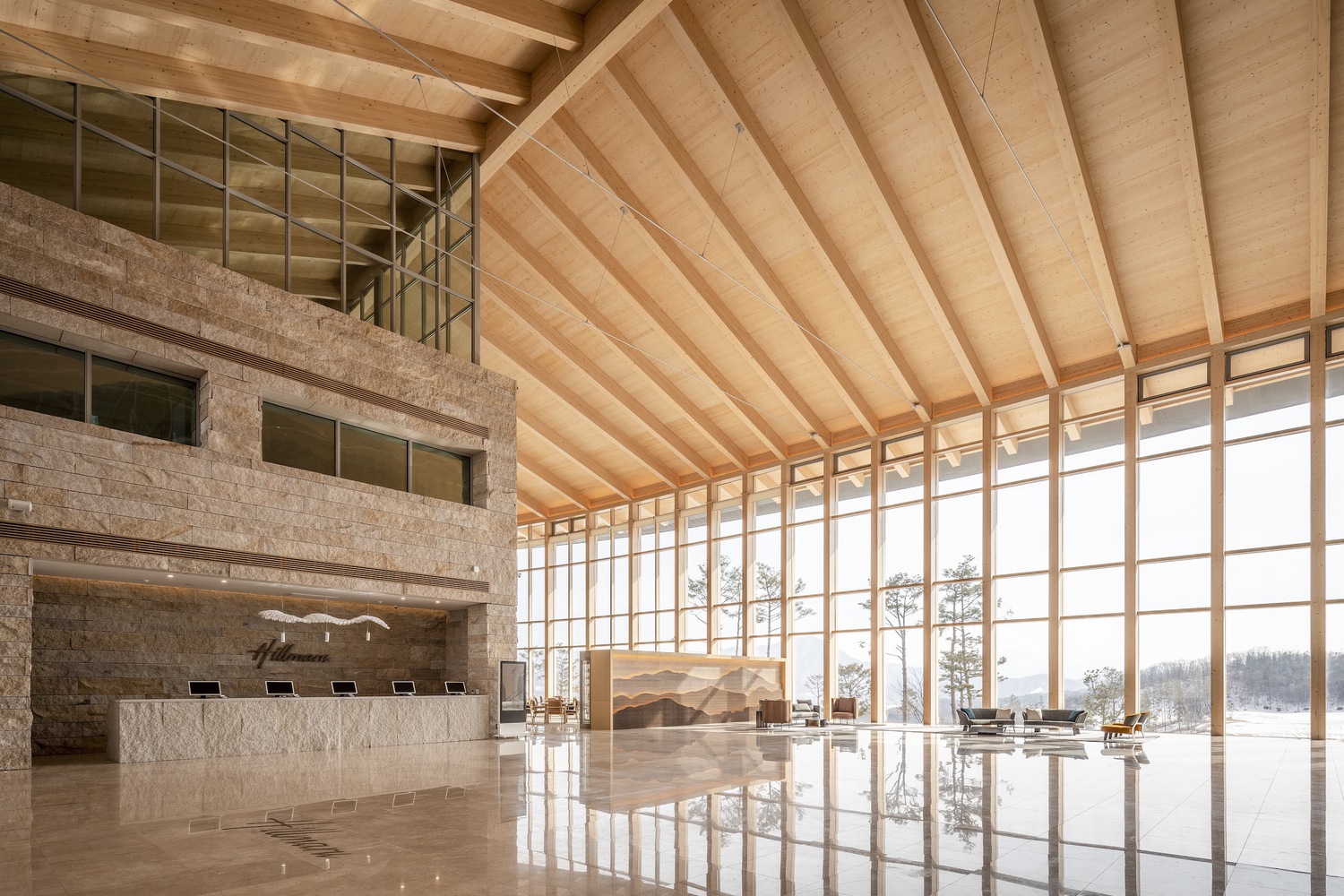 Traditional Korean design elements were thoughtfully woven into the architecture to infuse the Hillmaru Country Club with a distinctive cultural flair. A particularly striking feature was the roof structure, resembling the grandeur of a whale, crafted using Blumer-Lehmann’s glulam wooden structure.
