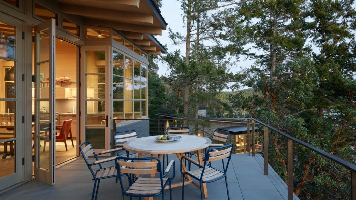 The site for the guest house came with more significant technical challenges. The concept begins with a stone tower set near the center of the small circular parcel. Rising high above steeply-sloping grade, it acts as a three-dimensional datum through which feature program elements are allowed to puncture. The main entry offers ease of access to the project’s public spaces through a simple, full-height opening cut into the stone volume’s north elevation. The stair, comprised of a concrete base below large casement windows, allows natural light to fill the main stairway as it leads guests toward the bedrooms located at the home’s lower level. Opposite the entry, the view deck extends from the great room, cantilevering far above grade. The dining room, finally, was conceived as a three-sided glass object floating in a forest of trees. Two steel beams carry its entire weight and extend deep into the floor system. To enhance the concept, our team preserved trees only a few feet from the dining room by developing custom retaining walls capable of avoiding critical root zones.