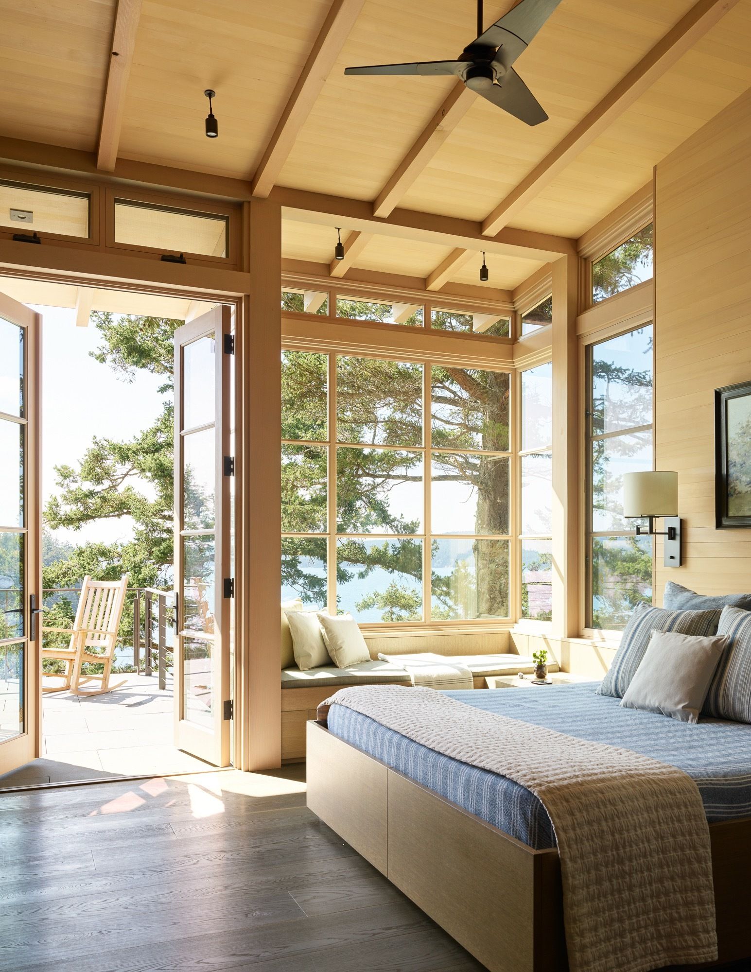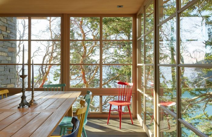 Taking full advantage of sweeping views of Puget Sound, the main home is sited on a small plateau high on top of a steeply-sloping hillside. With a view on one side and a road on the other, the site suggested a stone plinth and stone wall to form the base and rear of the house. A pair of stone fireplace volumes support the concept, rising together to form the boundaries of a central stone staircase that separates the main level into public and private realms. Atop the low stone base then perches a light-filled wood structure. Its simple shed roof tips low in front to protect from the summer sun while offering space for a photovoltaic array above. Winter light, in turn, penetrates deep into the main living spaces through a wall of glass running continuously across building’s south elevation. The relative height difference between this wood pavilion and that of the adjacent stone volume also allows consistent north light to flood into the primary living spaces via a series of clerestory windows, which release warm air high on the leeward side of the structure.