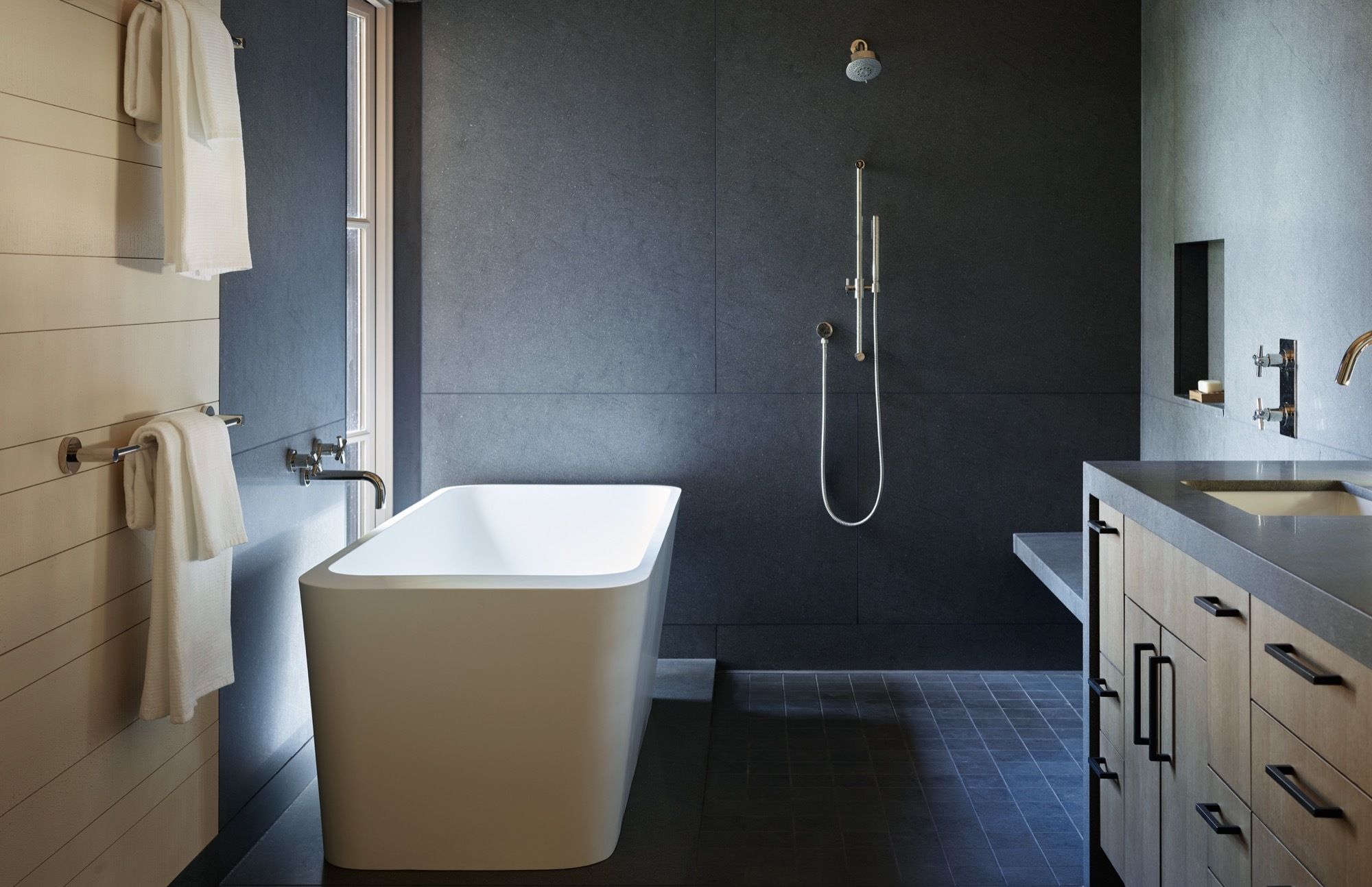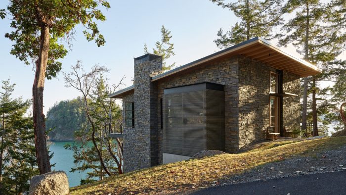 Hillside Sanctuary designed by Hoedemaker Pfeiffer, The owner of this property came to us looking for a personal retreat inspired by a home lost to fire decades earlier in the hills of Appalachia. Our task was not to recreate it but rather to give its spirit new form in the Pacific Northwest. Taking inspiration from its remote site in the San Juan Islands, our team envisioned a series of simple stone volumes. From that concept emerged the main house and a guest house, each responding to its own unique location on the site. Together they provide friends and family with comfortable accommodation while offering a sanctuary for the owner at the main home.