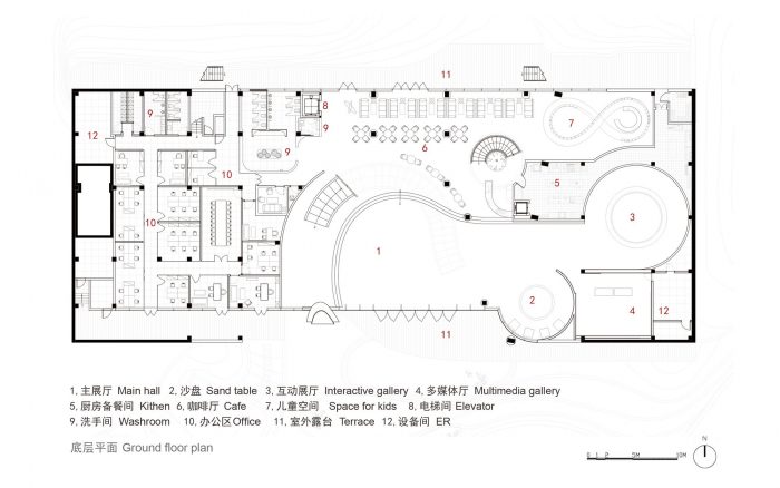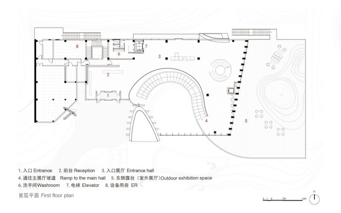 To the East of the bottom floor, where it has physically extended into the mountain is an interactive audio-visual room and a theatre that does not require much lighting. To the North is the café with an outdoor terrace platform looking to nature. Except for the elevators, the giant spiral stairs penetrating the whole building can take the visitors straight up to the top floor, which serves as a reception area for the VIP visitors, as well as tearooms and resting and dining areas. Space is flexible for different functional necessities.