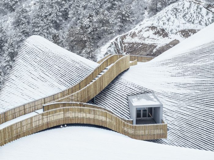 A slightly tilted entrance introduces the visitors to the museum’s main exhibition space on the Ground Floor, where it offers unobstructed views to the breathtaking mountainous landscapes in distance and the elegantly resting pine trees in the front, leaving the entire space constantly submerged in nature. Following the undulation of the roof, you will find the exhibitive high space located at the bottom level of the building. The two main floors hosting general art-pieces are interloped by the sweeping loop stairs, and a hall catering for super-scaled art installations is made from a triple-height space.