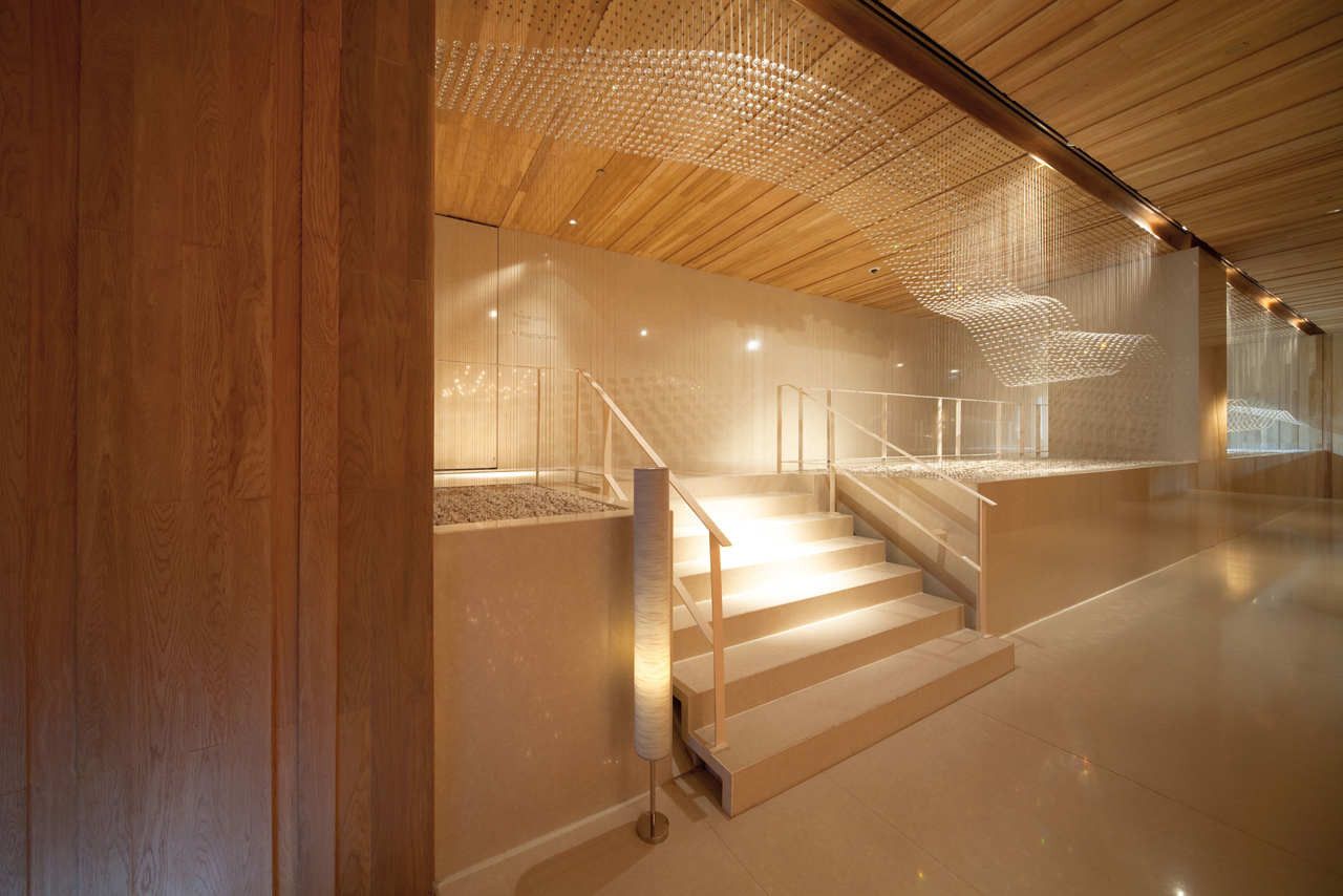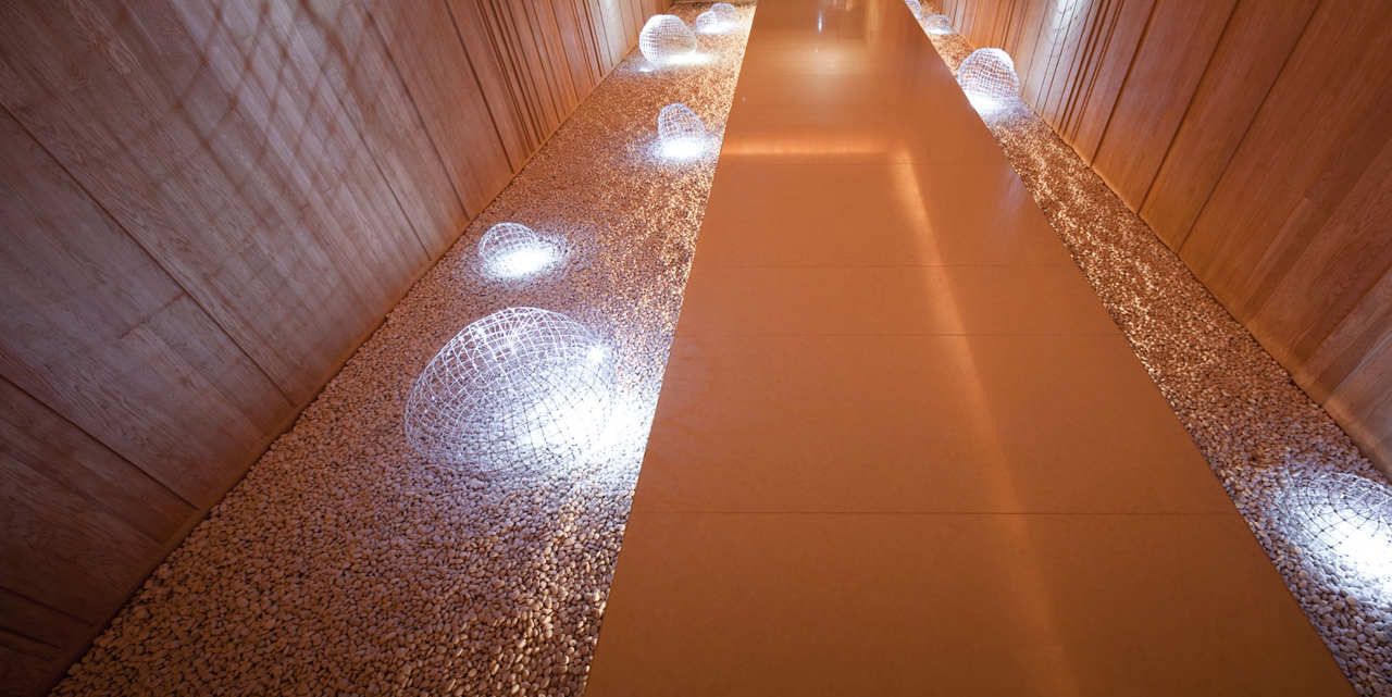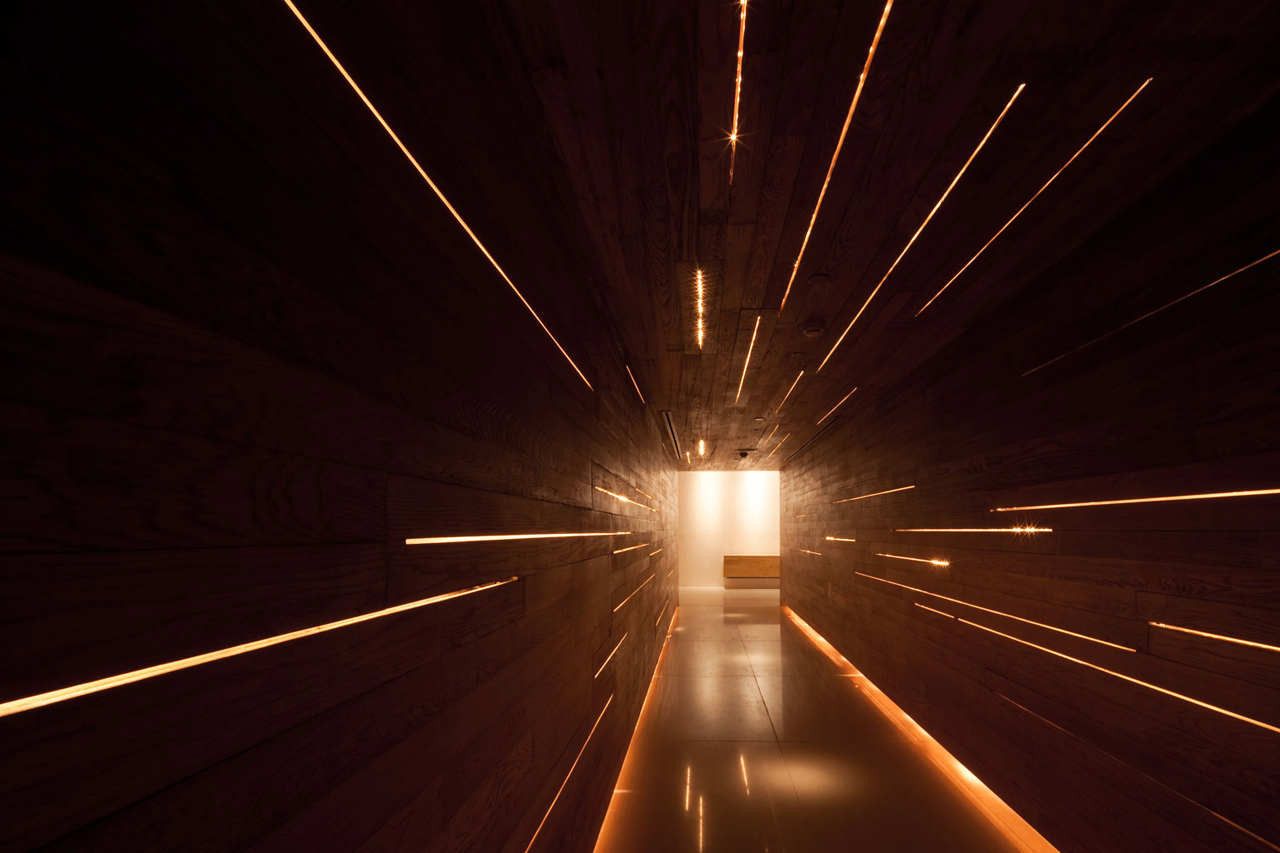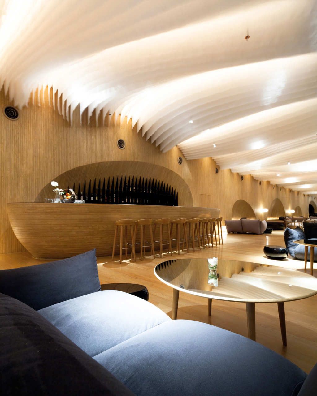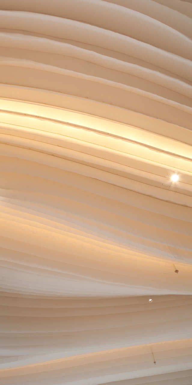 At night, strip lighting accents from above the fabric linear pattern. The whole ceiling volume becomes a gentle luminous source of light giving a fine ambient to the overall space.
