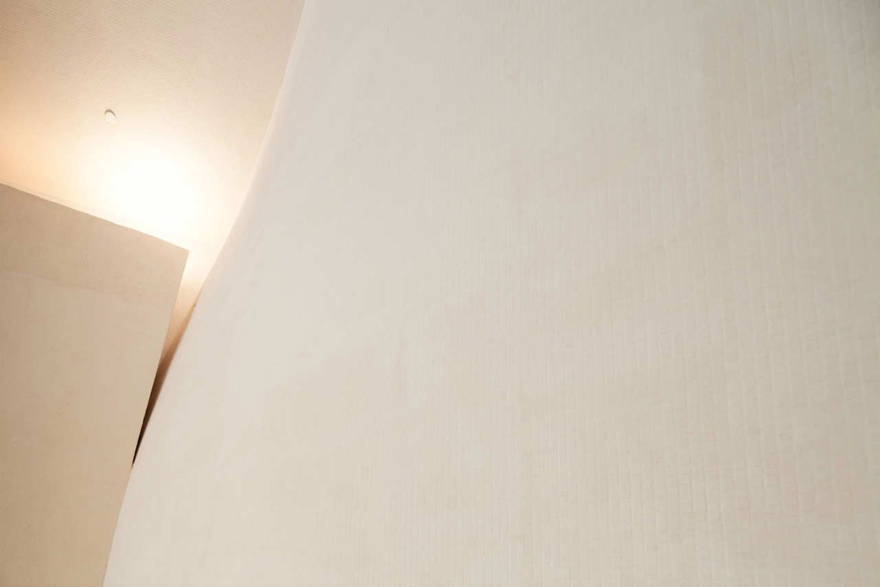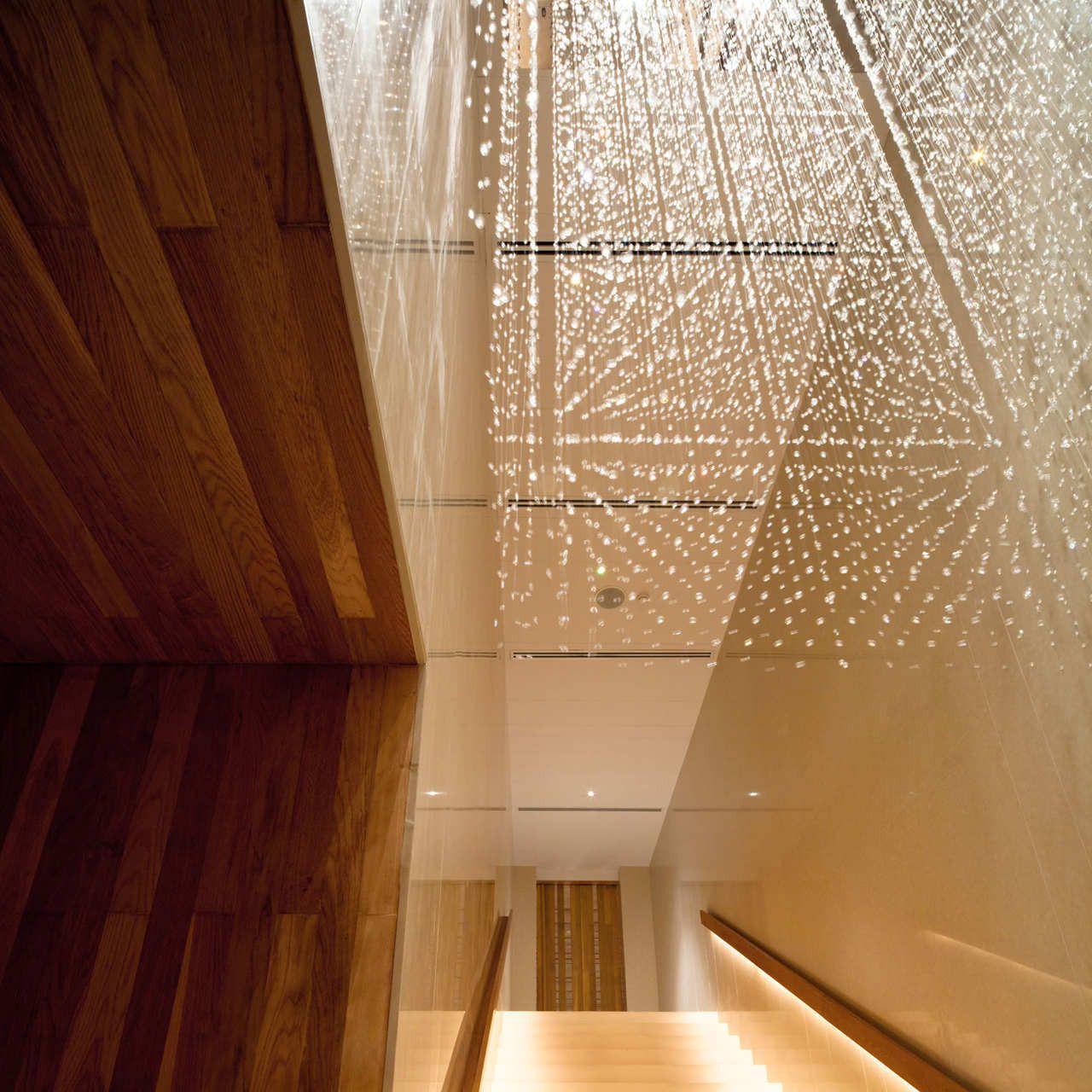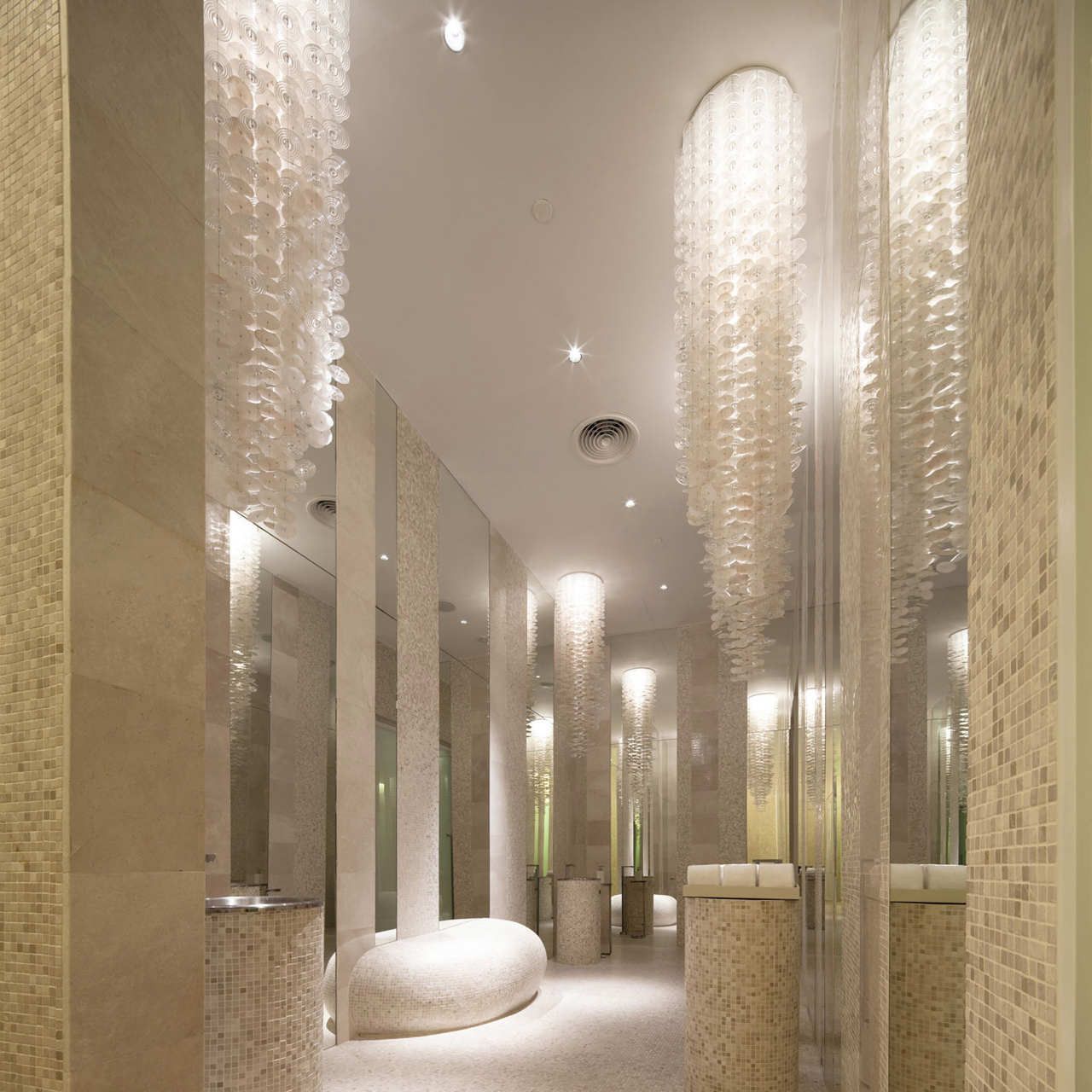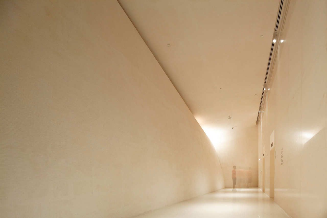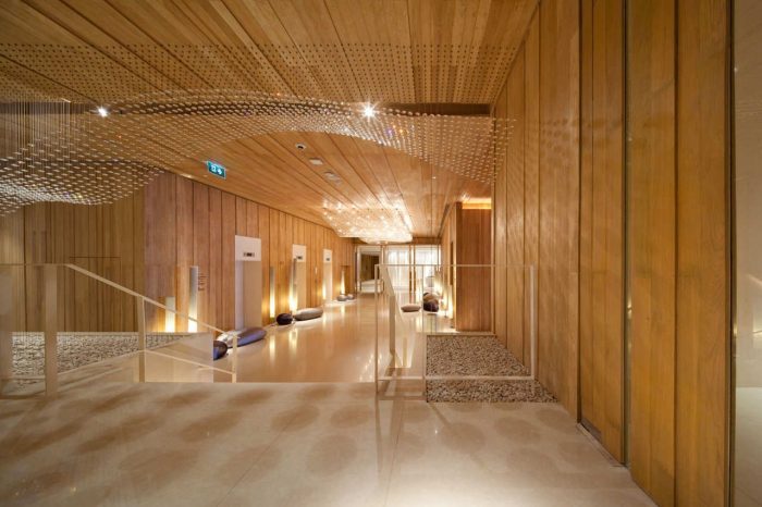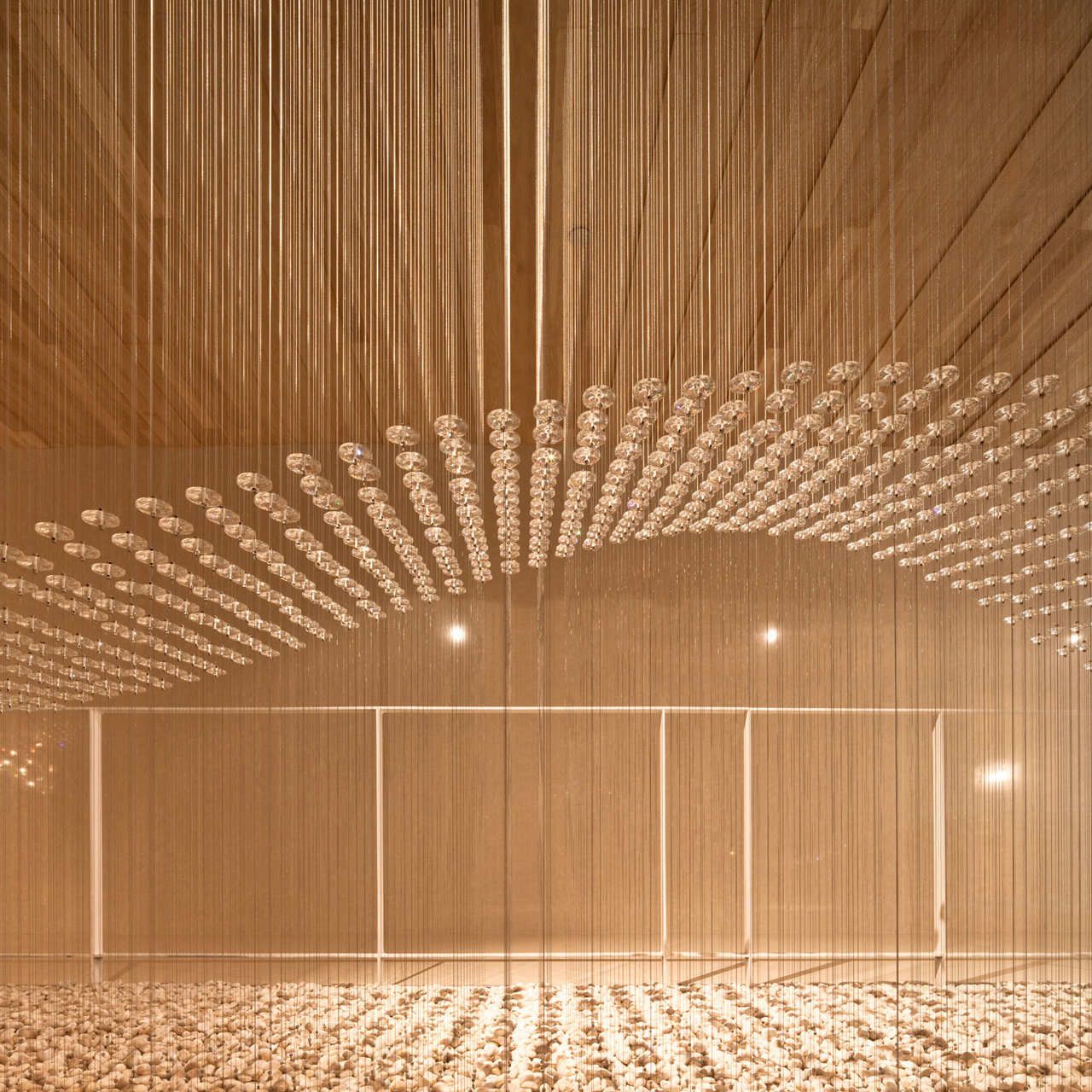 At night, strip lighting accents from above the fabric linear pattern. The whole ceiling volume becomes a gentle luminous source of light giving a fine ambient to the overall space.