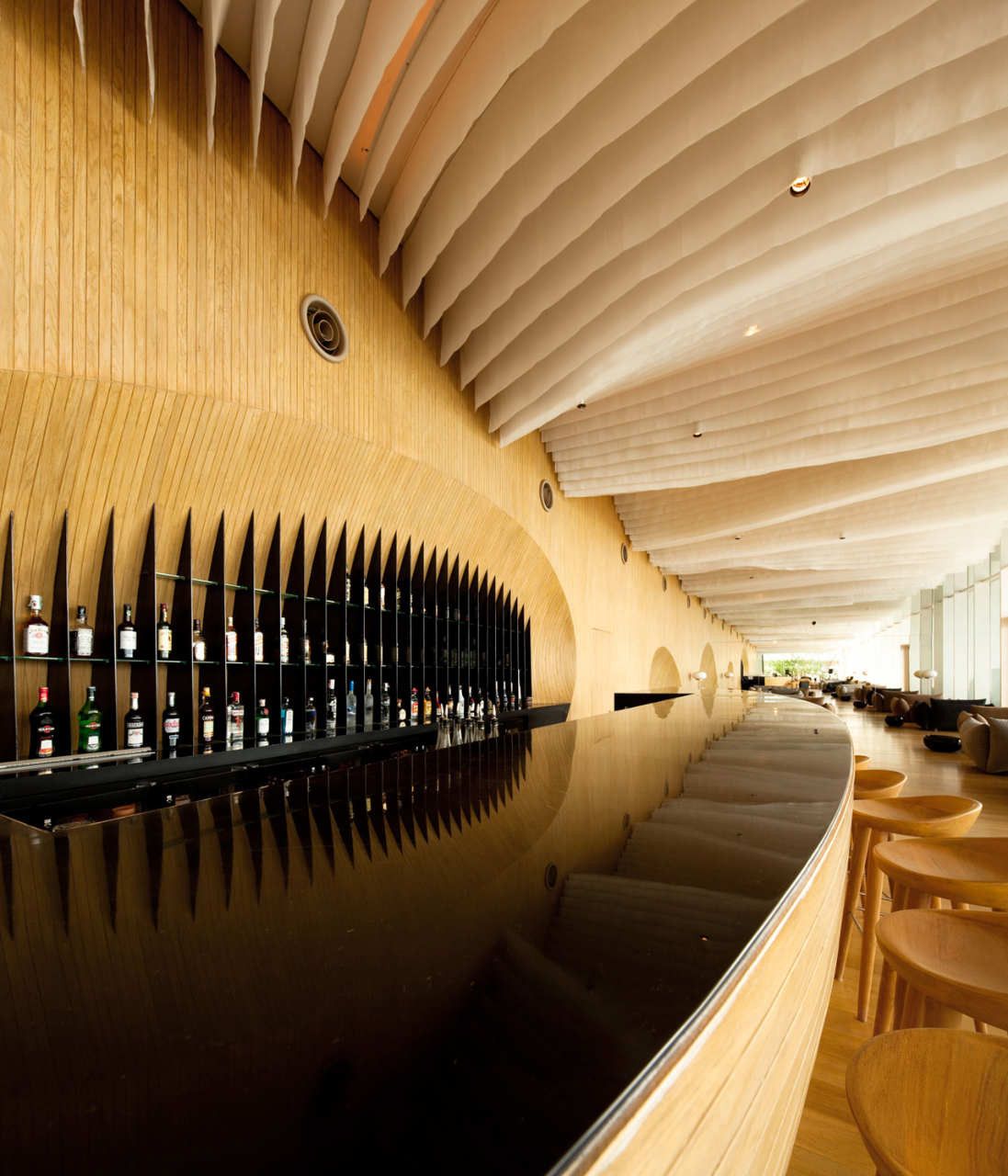 At the end of the lobby space, the bar area is arranged linearly along the building edge parallel to the sea with a maximum opening to the ocean view. A backdrop of the bar area lies a wooden wall with alcoves where the daybeds partially tuck themselves into the wall. Oversized and soft furniture provides comfortable and relaxing seating for guests to sink into. A full-wall mirror at the end of the long space doubles the visual length of the bar area.