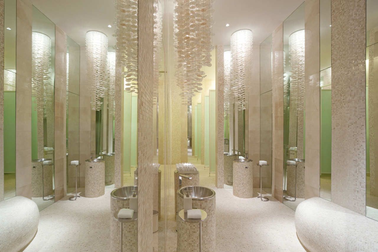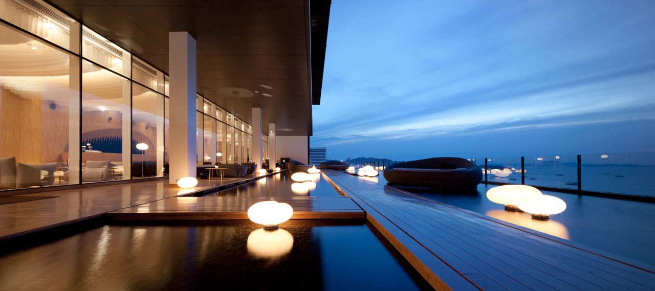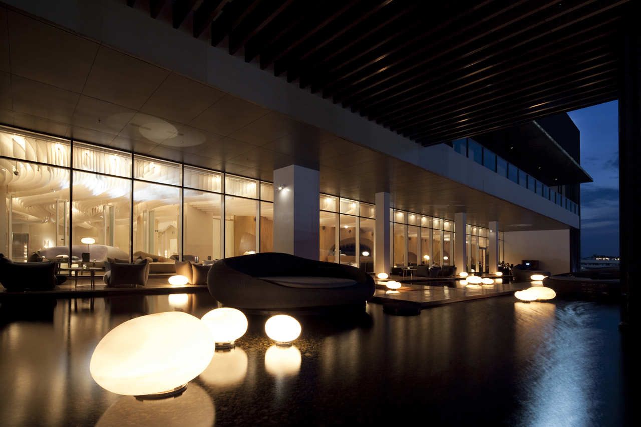 Further in front of the indoor bar area is an outdoor lounge space with a large reflecting pond catching the reflection of both the sky and the droplet daybeds and lamps scattered around. From this area, space is opened up to the panoramic ocean vista and gentle sea breeze.