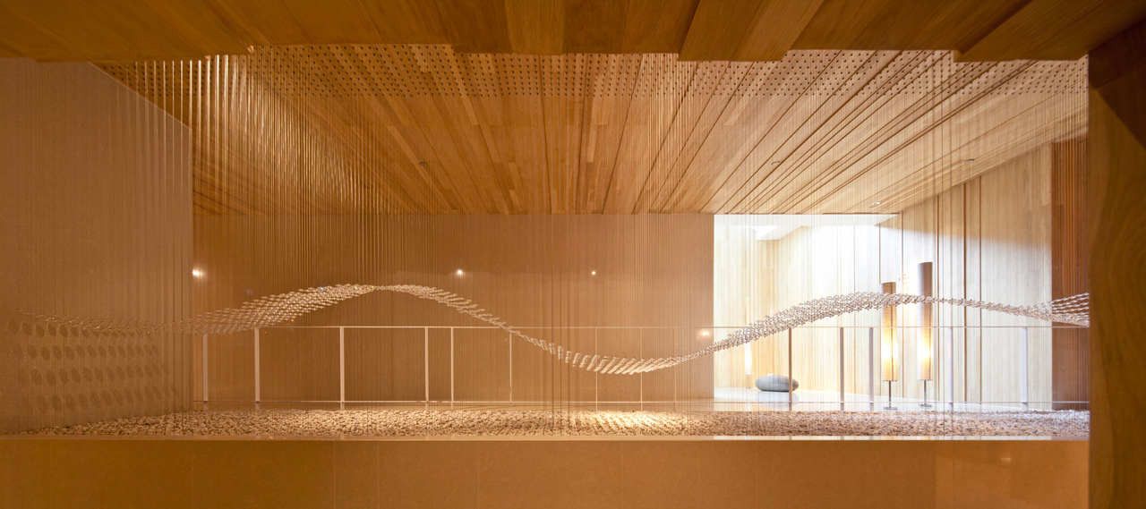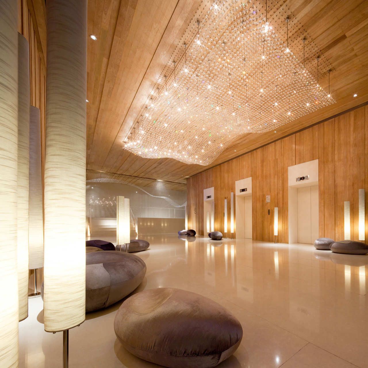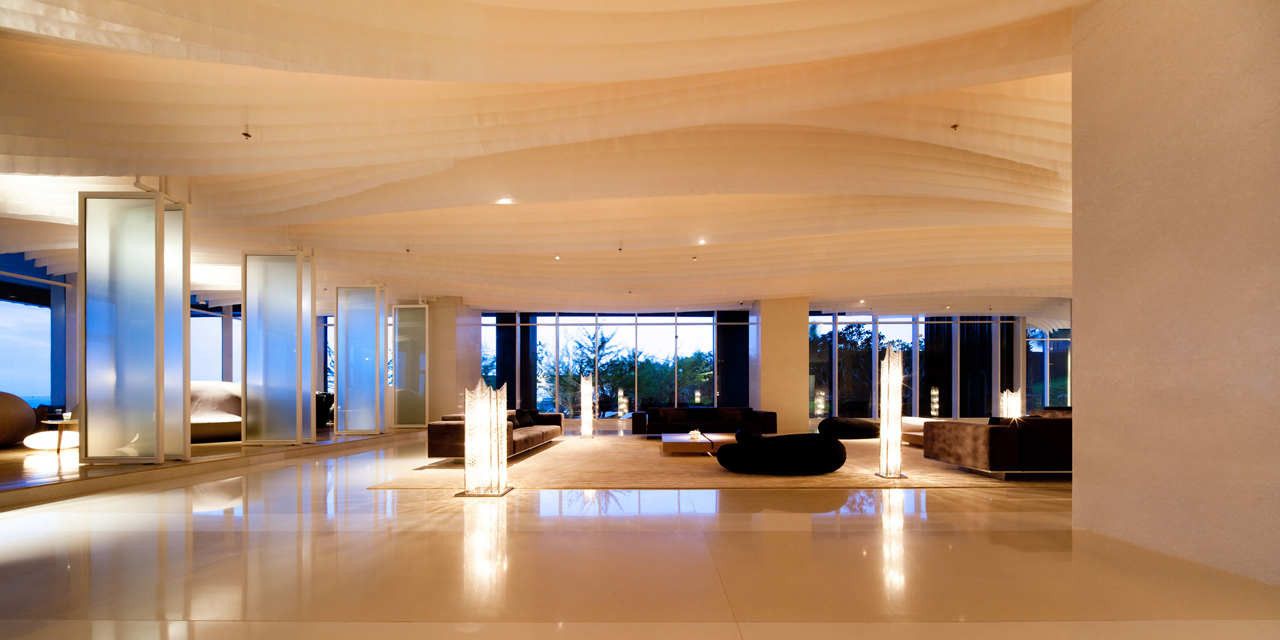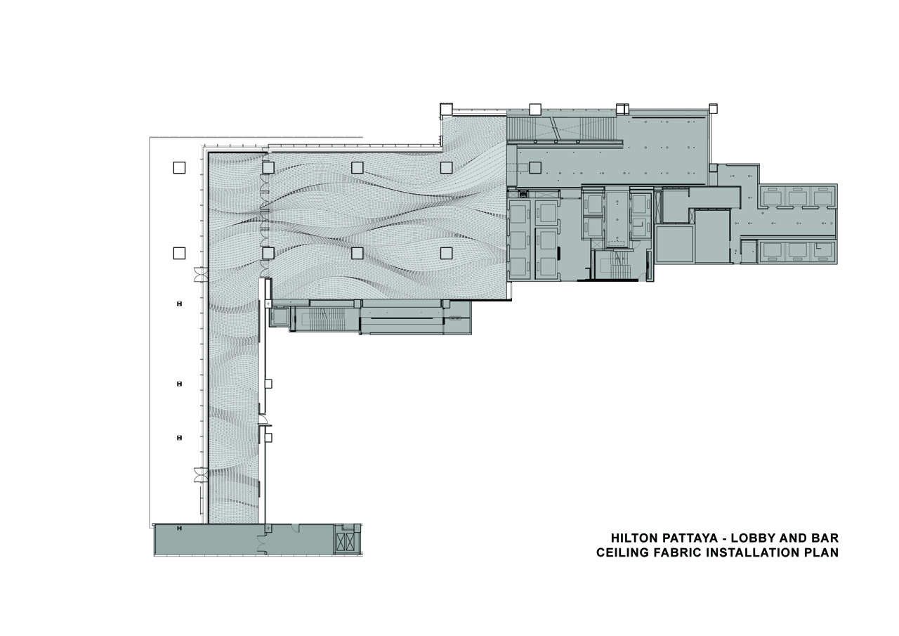 The space for the hotel lobby and bar occupies the 17th floor, high above the bustle of Pattaya beach below. Upon entering the space from one end, as elevator doors open, one would enter a spacious lobby area. The architectural intervention to the entire ceiling plane, with its dynamic wave lines, leads the movement of the visitors towards the seafront beyond. The fabric installation on the ceiling becomes a main feature in the space while simple elements on the ground provide a tranquil atmosphere.