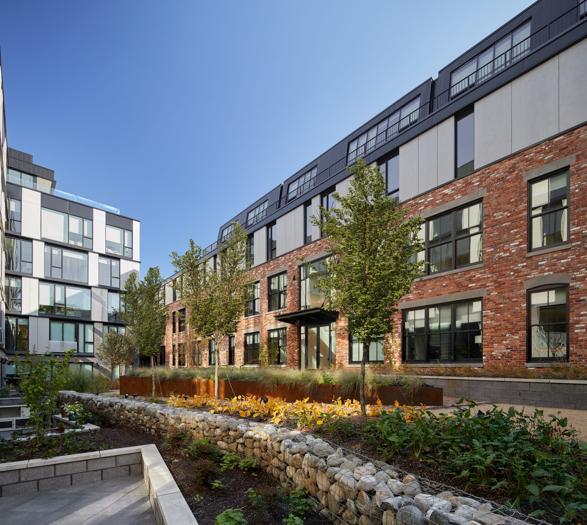New housing units on the roof of the historic structure recall the form of “light monitors” that present in the original garage to allow northern light to illumi-nate workspaces. Sightlines were carefully considered so that the new housing units on the roof are not visible from the street.