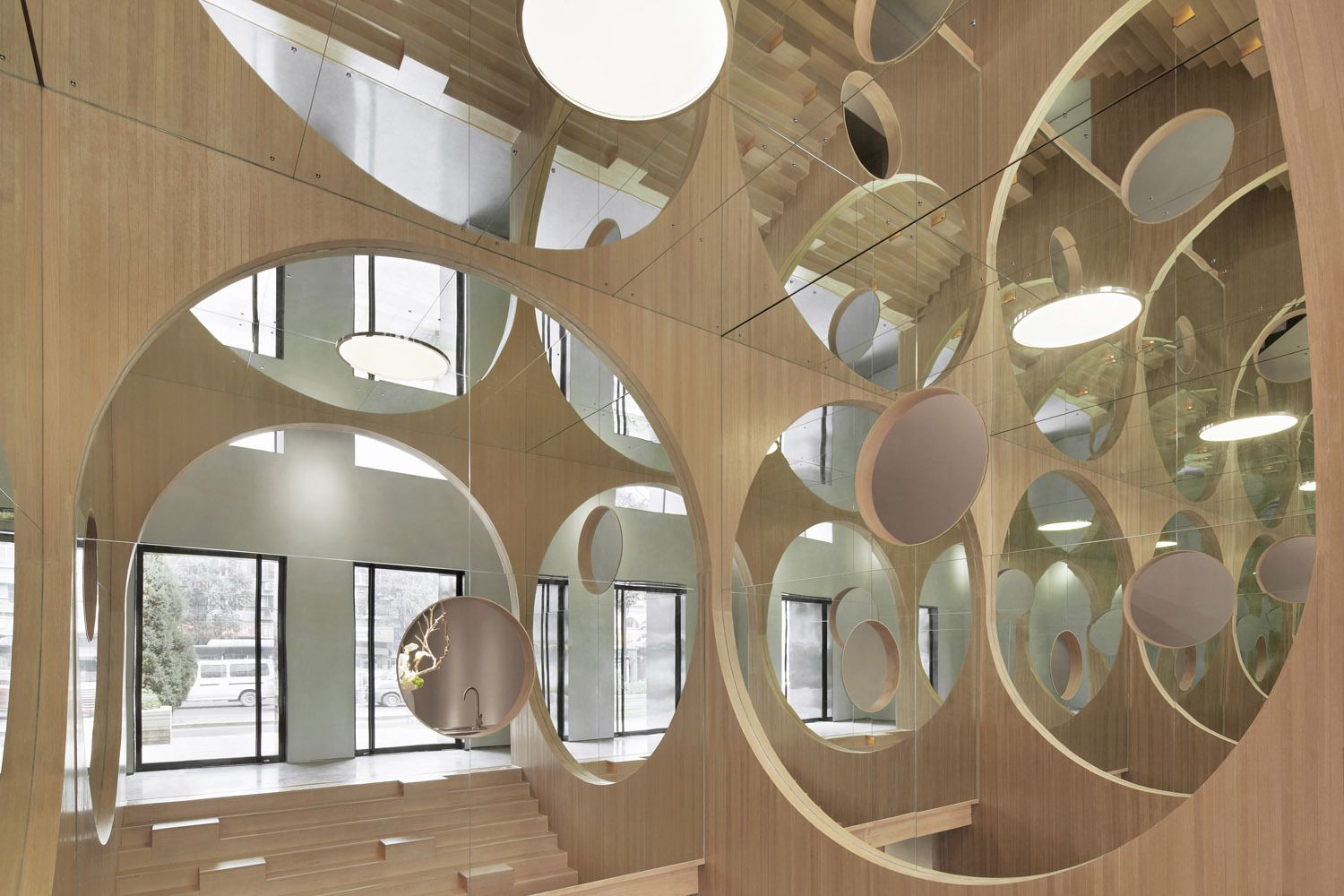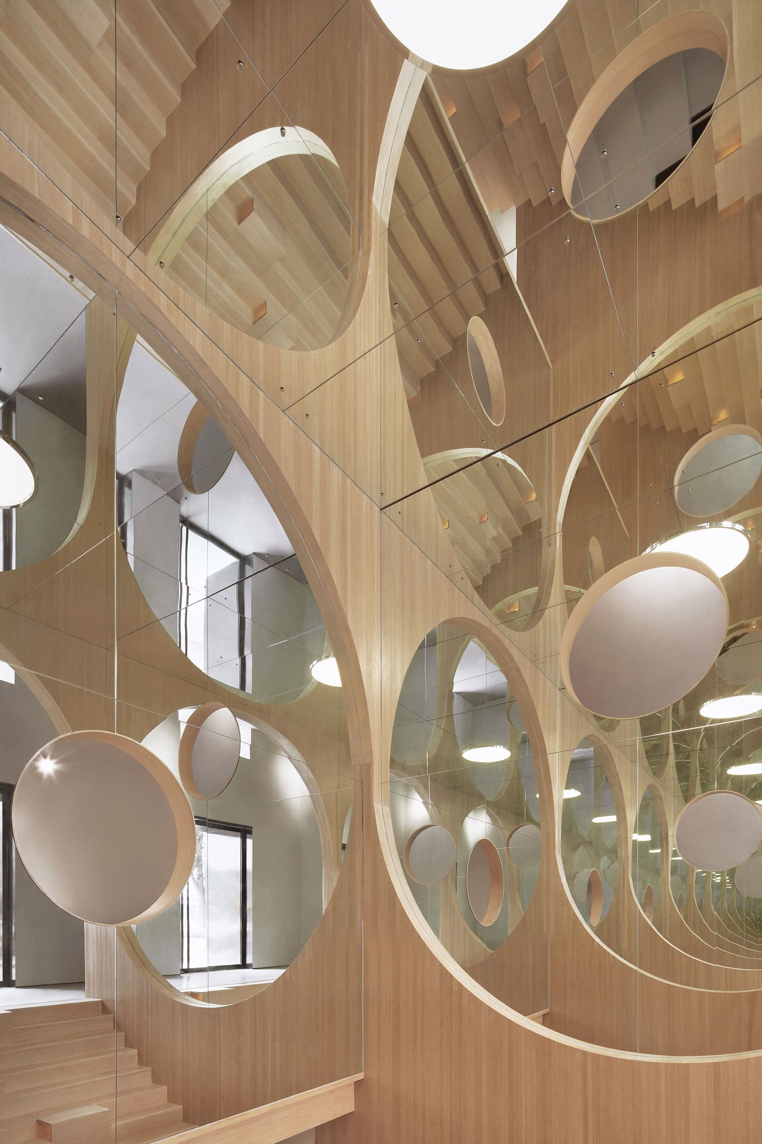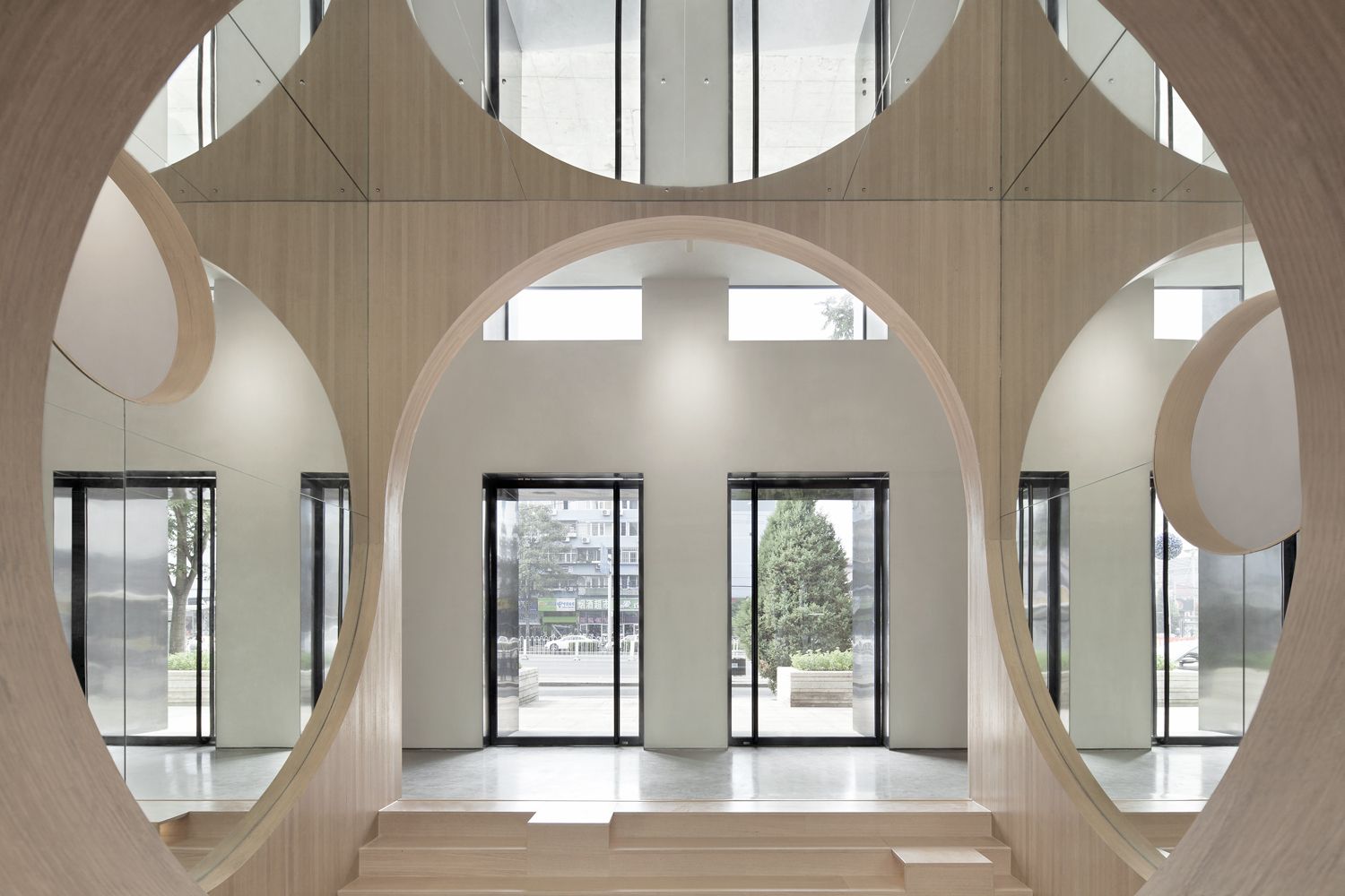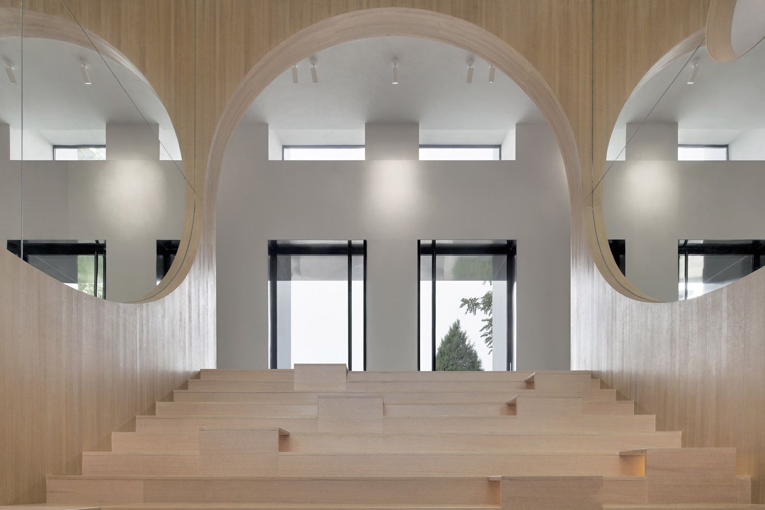 The topic of a centered and mirrored space continues to the interior. Penda inserted a lively box of arches, mirrors, and steps that can host lectures or team meetings, and is used as a grand entrance to guide visitors to the lower floor. Here, the space accommodates an exhibition and art-depo area.Walking around the box on the left side, guests will reach an art-selling lounge on the first floor, where paintings and art-pieces are traded and a small bar invites customers to an informal talk. On the right side of the box, a staircase leads employees to an office space on the second floor.The solid centre-cube offers a warm, wooden contrast to its gray concrete-plastered background.The wooden cube is seen from every space in the building and has round cutouts for visitors to peak into the