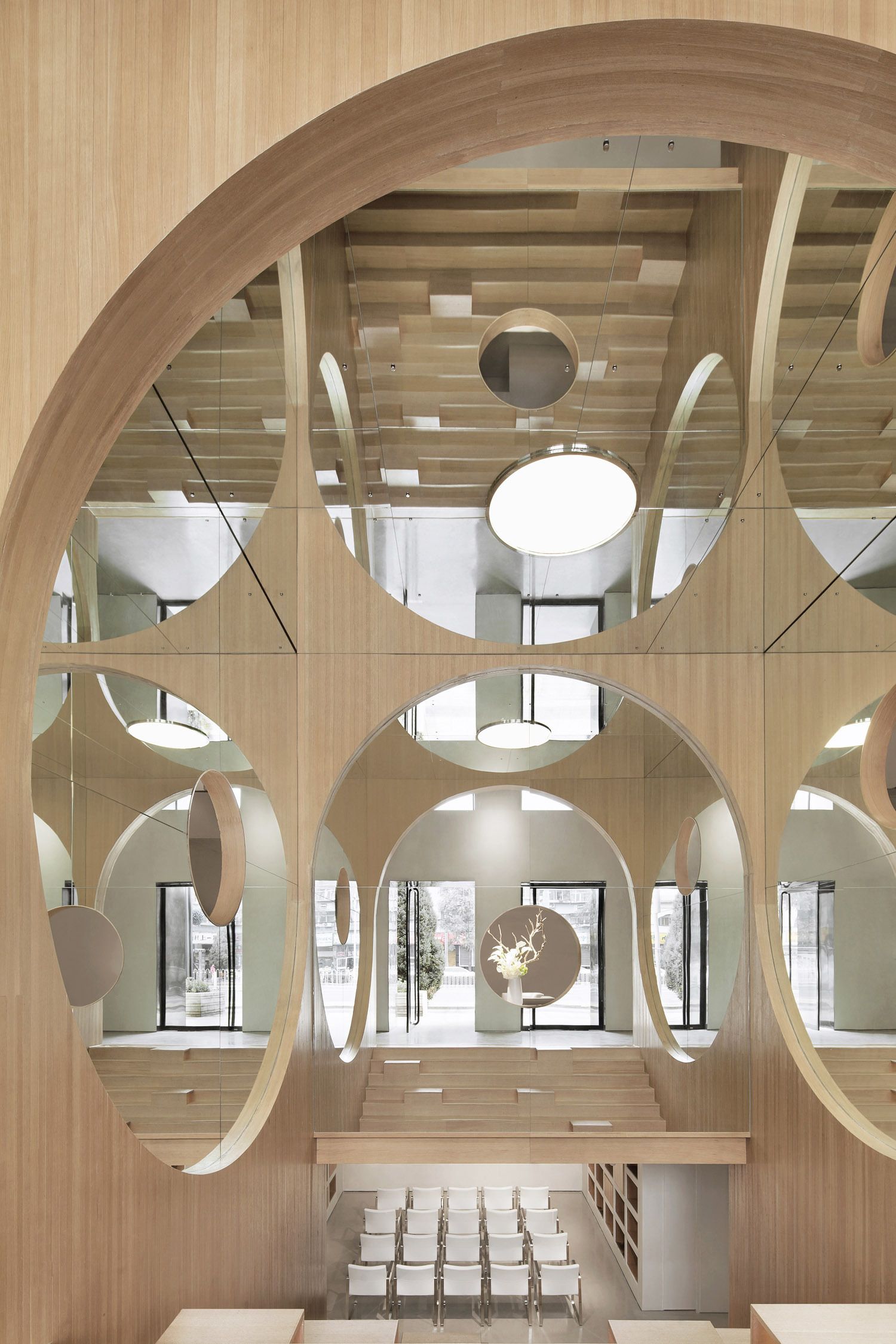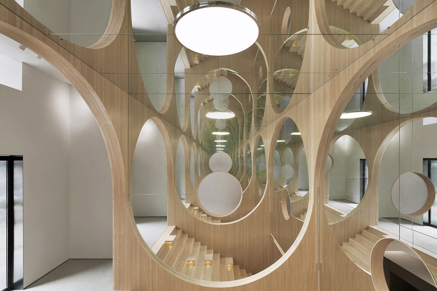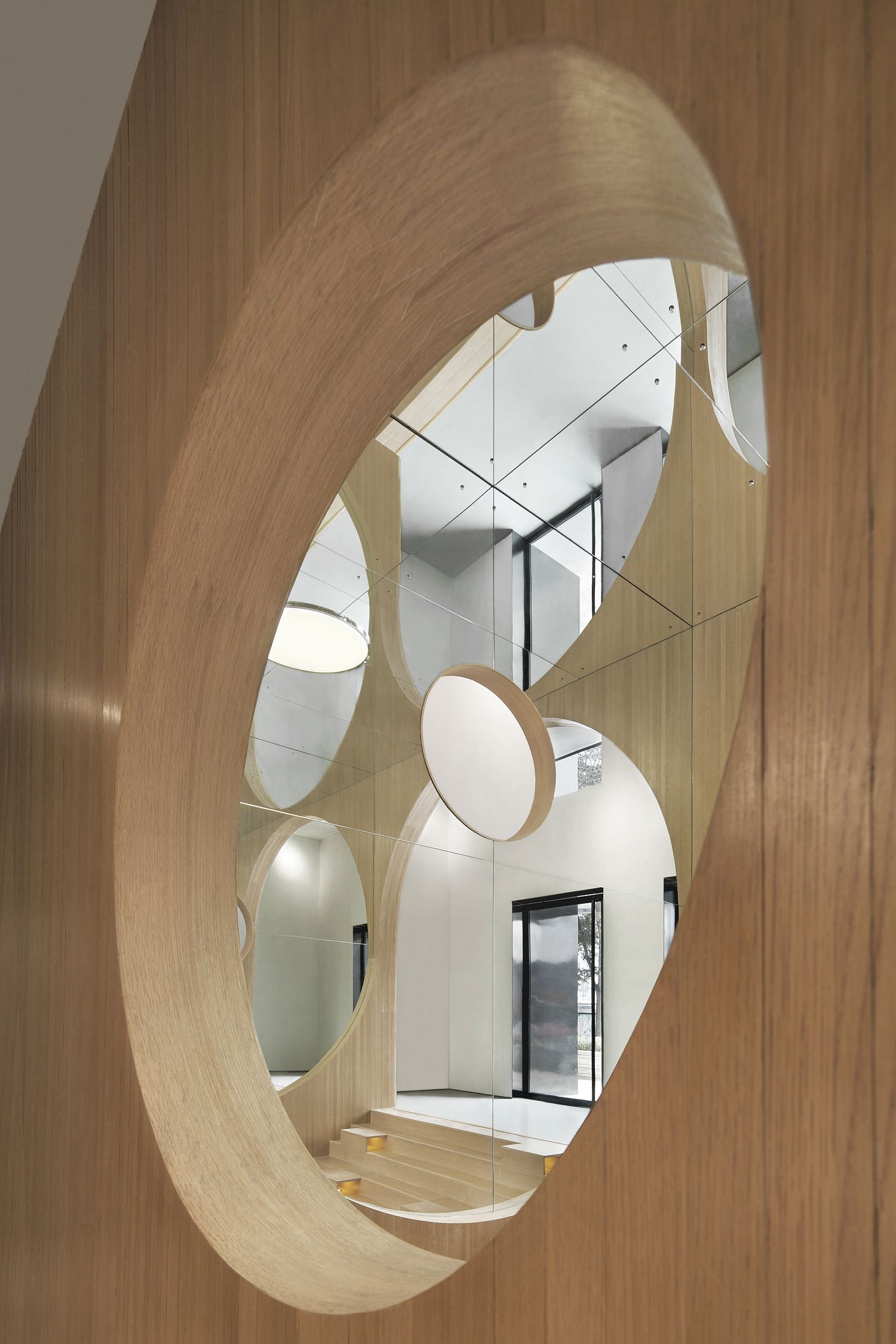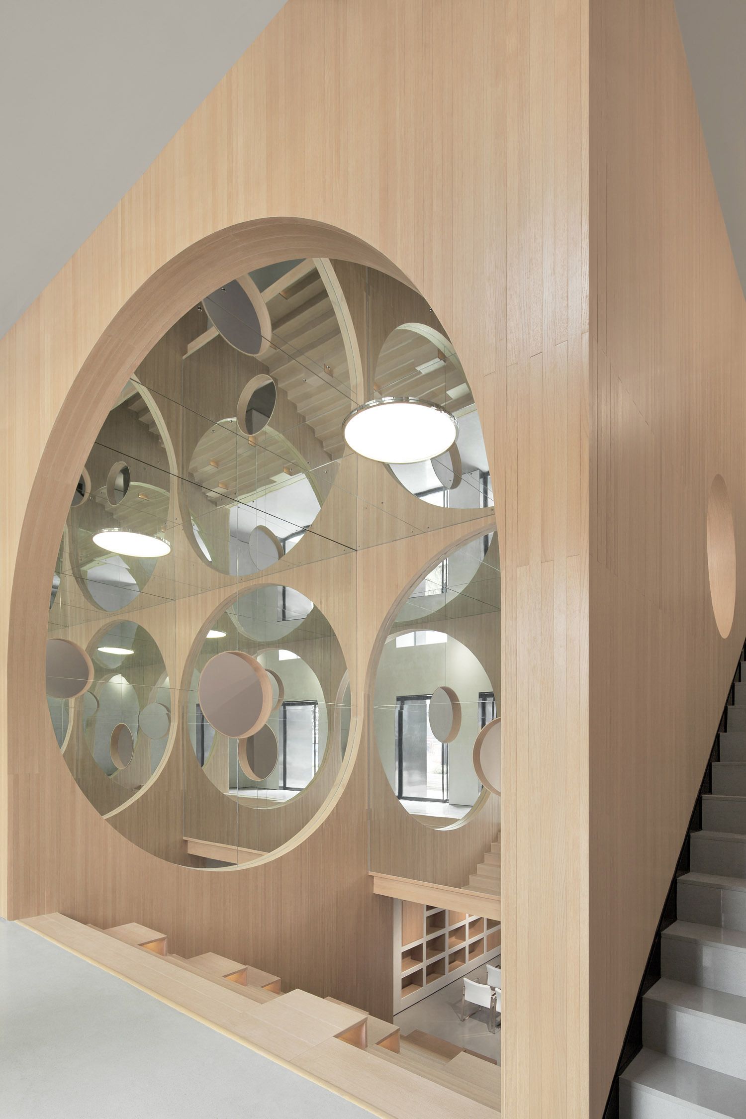 The topic of a centered and mirrored space continues to the interior. Penda inserted a lively box of arches, mirrors, and steps that can host lectures or team meetings, and is used as a grand entrance to guide visitors to the lower floor. Here, the space accommodates an exhibition and art-depo area.Walking around the box on the left side, guests will reach an art-selling lounge on the first floor, where paintings and art-pieces are traded and a small bar invites customers to an informal talk. On the right side of the box, a staircase leads employees to an office space on the second floor.The solid centre-cube offers a warm, wooden contrast to its gray concrete-plastered background.The wooden cube is seen from every space in the building and has round cutouts for visitors to peak into the