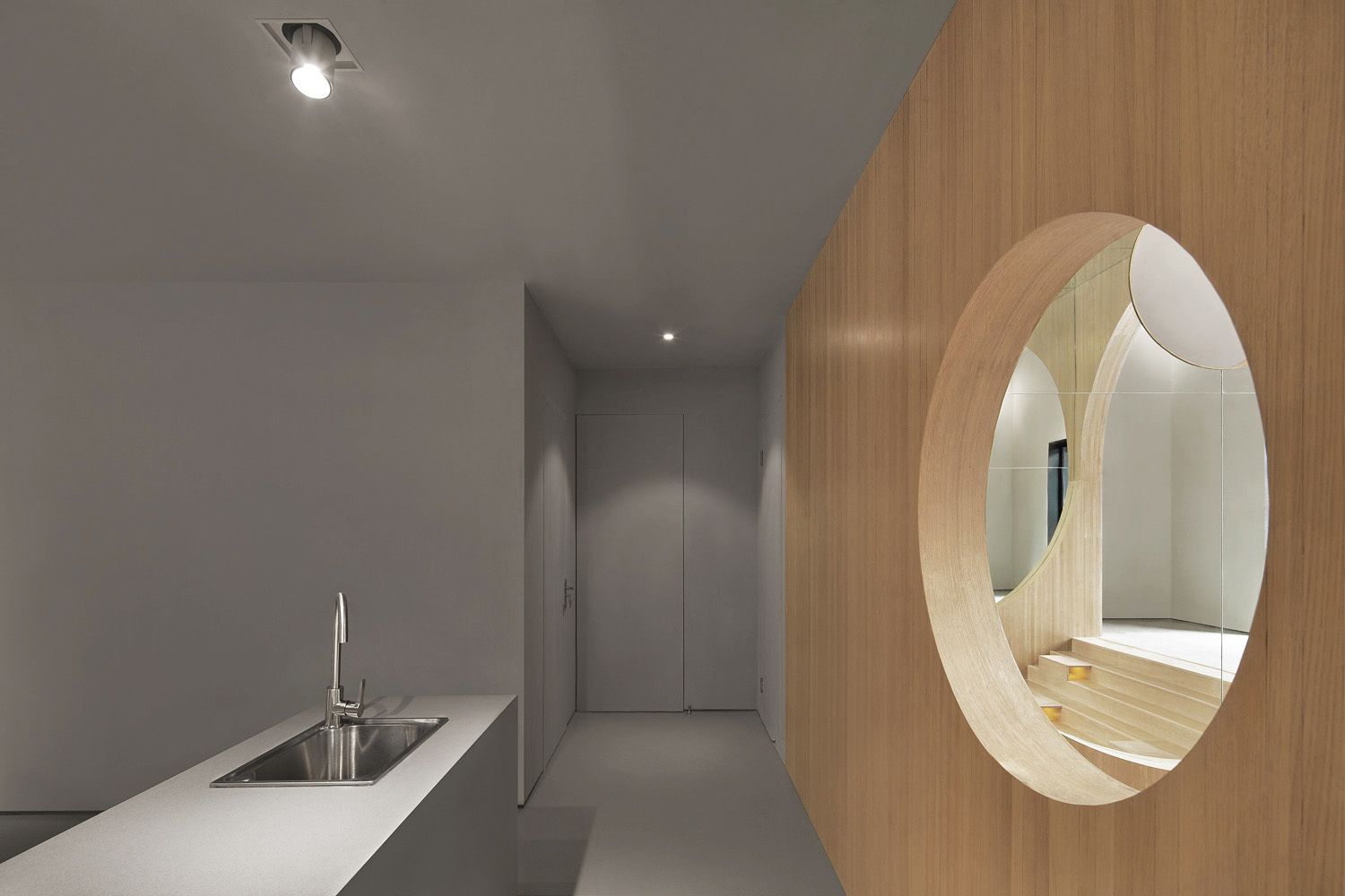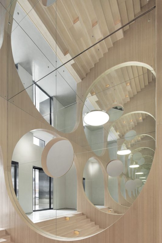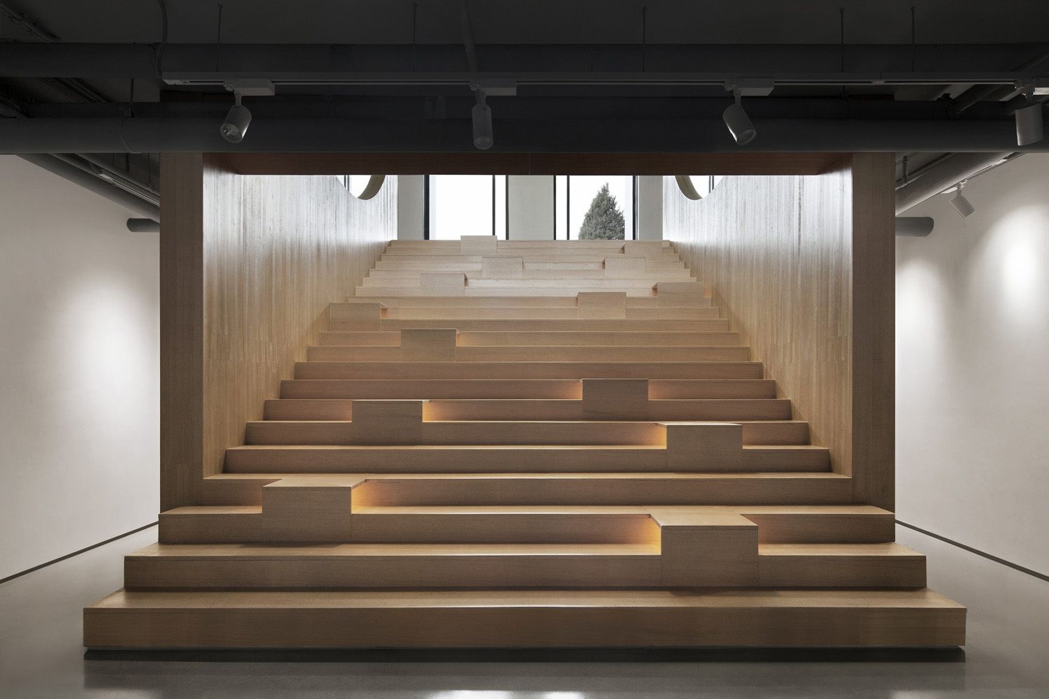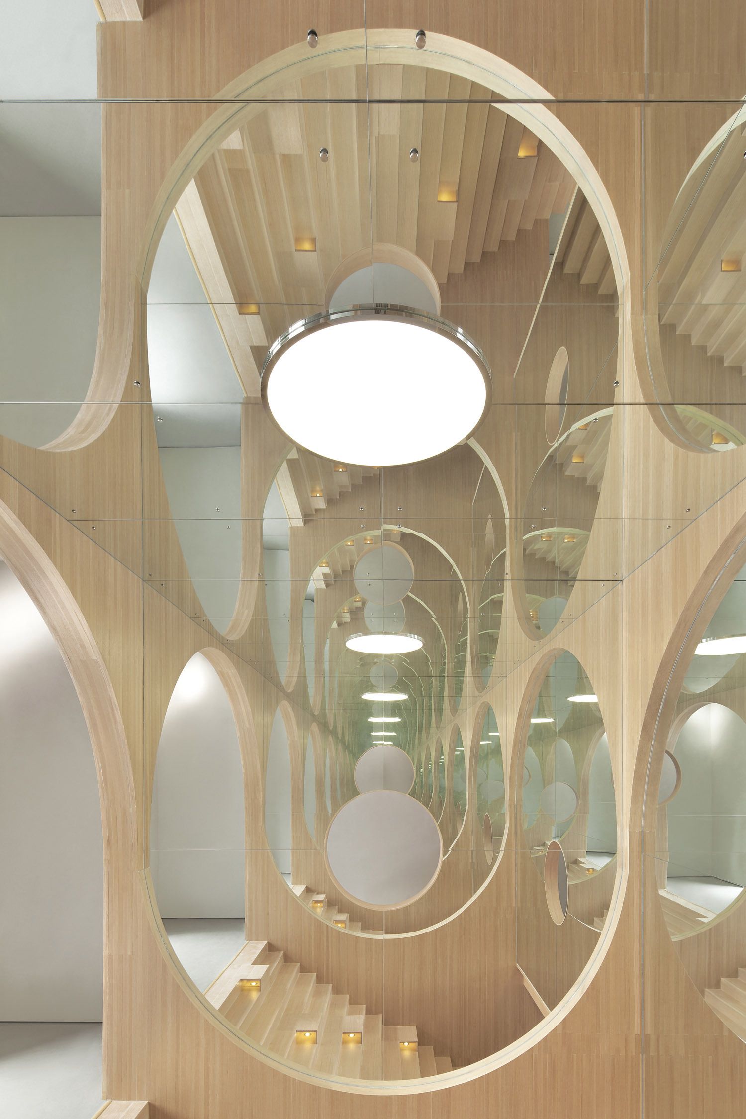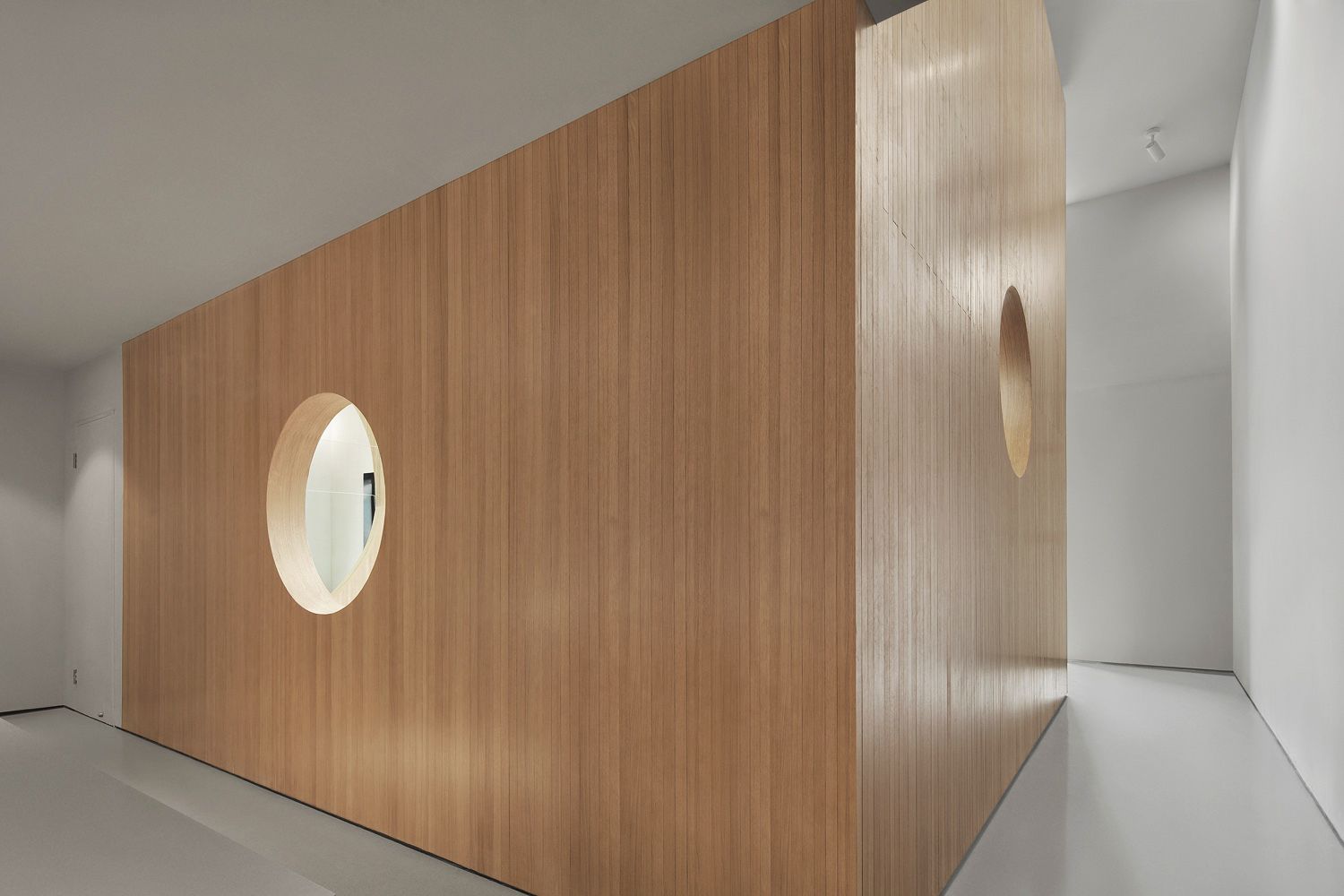 The topic of a centered and mirrored space continues to the interior. Penda inserted a lively box of arches, mirrors, and steps that can host lectures or team meetings, and is used as a grand entrance to guide visitors to the lower floor. Here, the space accommodates an exhibition and art-depo area.Walking around the box on the left side, guests will reach an art-selling lounge on the first floor, where paintings and art-pieces are traded and a small bar invites customers to an informal talk. On the right side of the box, a staircase leads employees to an office space on the second floor.The solid centre-cube offers a warm, wooden contrast to its gray concrete-plastered background.The wooden cube is seen from every space in the building and has round cutouts for visitors to peak into the