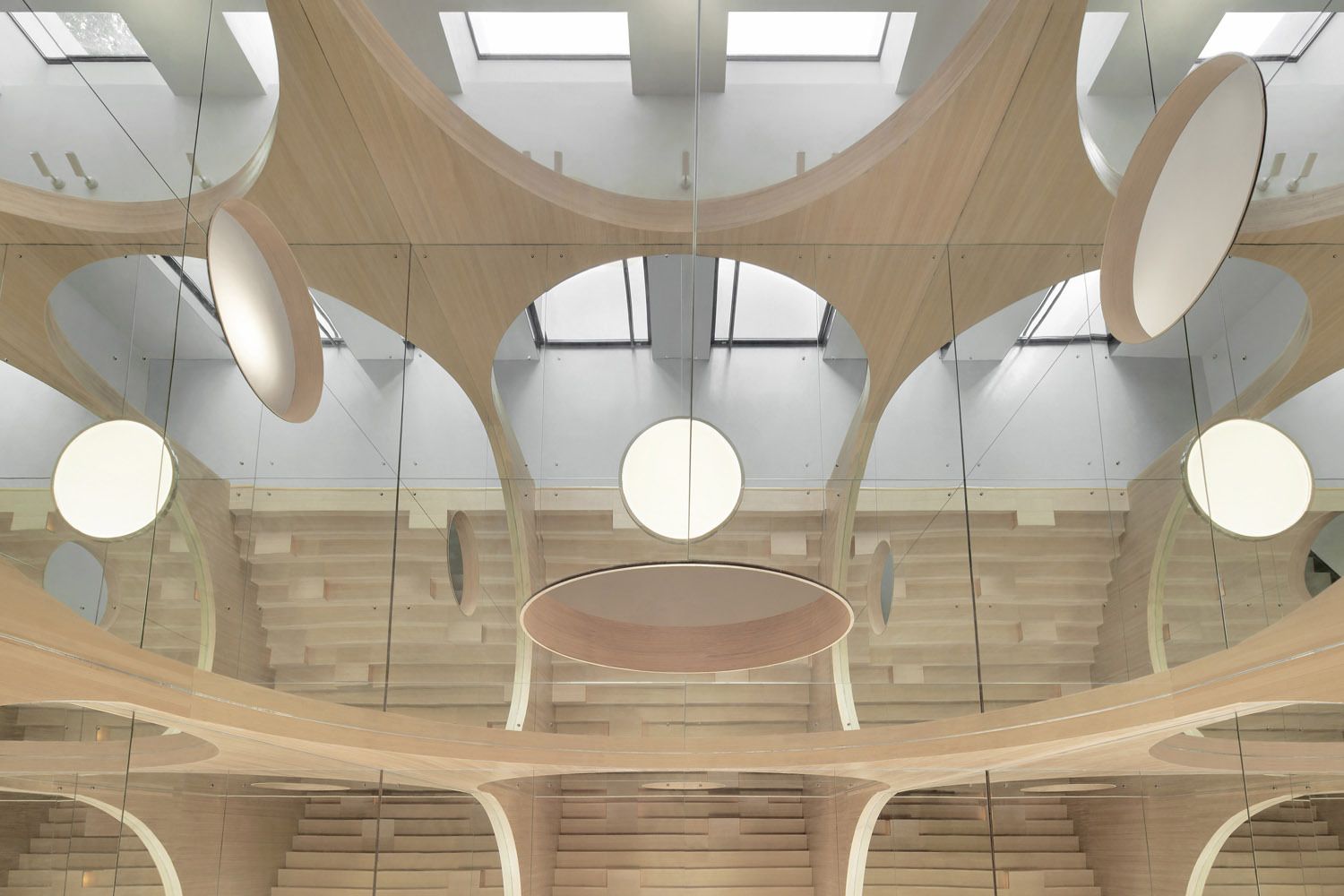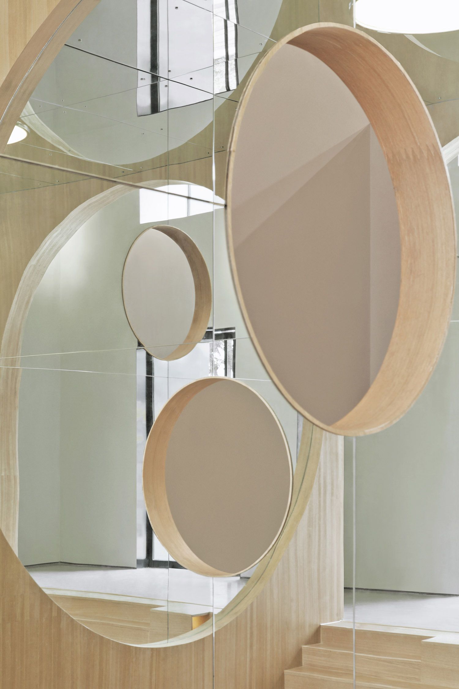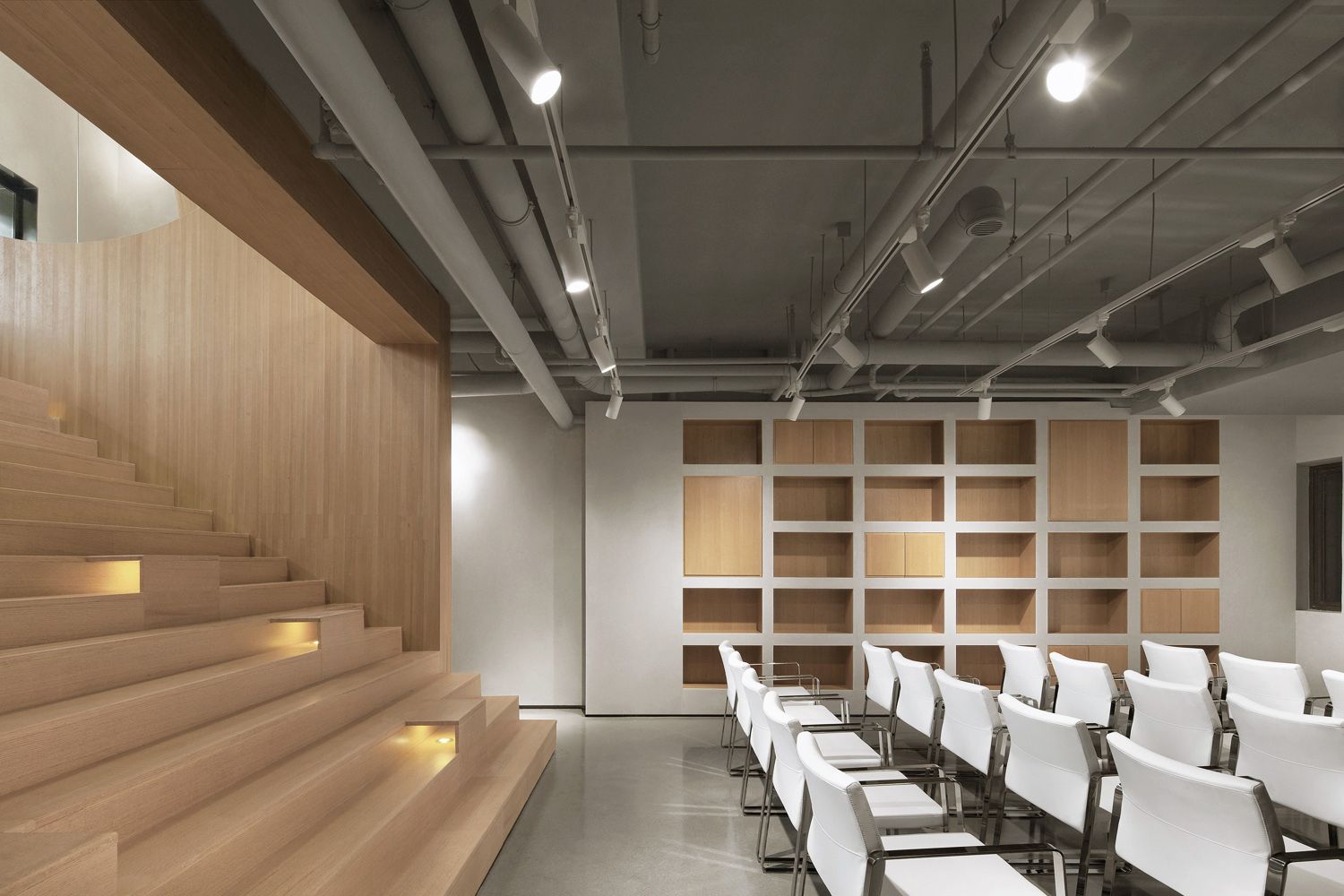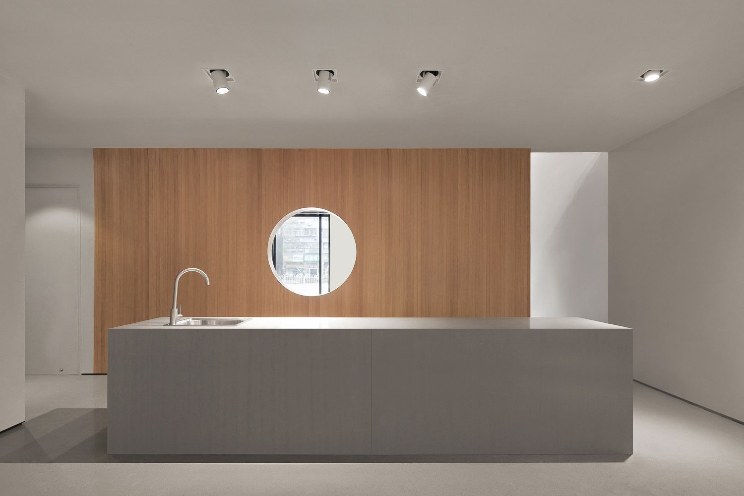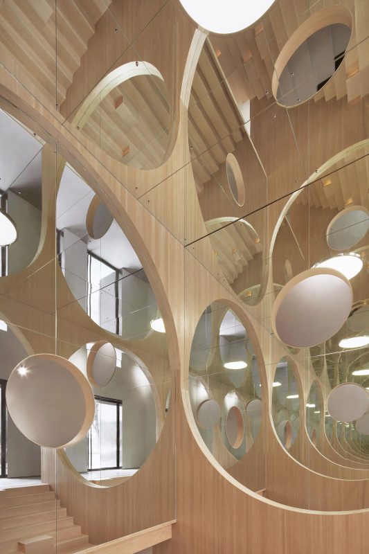 The topic of a centered and mirrored space continues to the interior. Penda inserted a lively box of arches, mirrors, and steps that can host lectures or team meetings, and is used as a grand entrance to guide visitors to the lower floor. Here, the space accommodates an exhibition and art-depo area.Walking around the box on the left side, guests will reach an art-selling lounge on the first floor, where paintings and art-pieces are traded and a small bar invites customers to an informal talk. On the right side of the box, a staircase leads employees to an office space on the second floor.The solid centre-cube offers a warm, wooden contrast to its gray concrete-plastered background.The wooden cube is seen from every space in the building and has round cutouts for visitors to peak into the