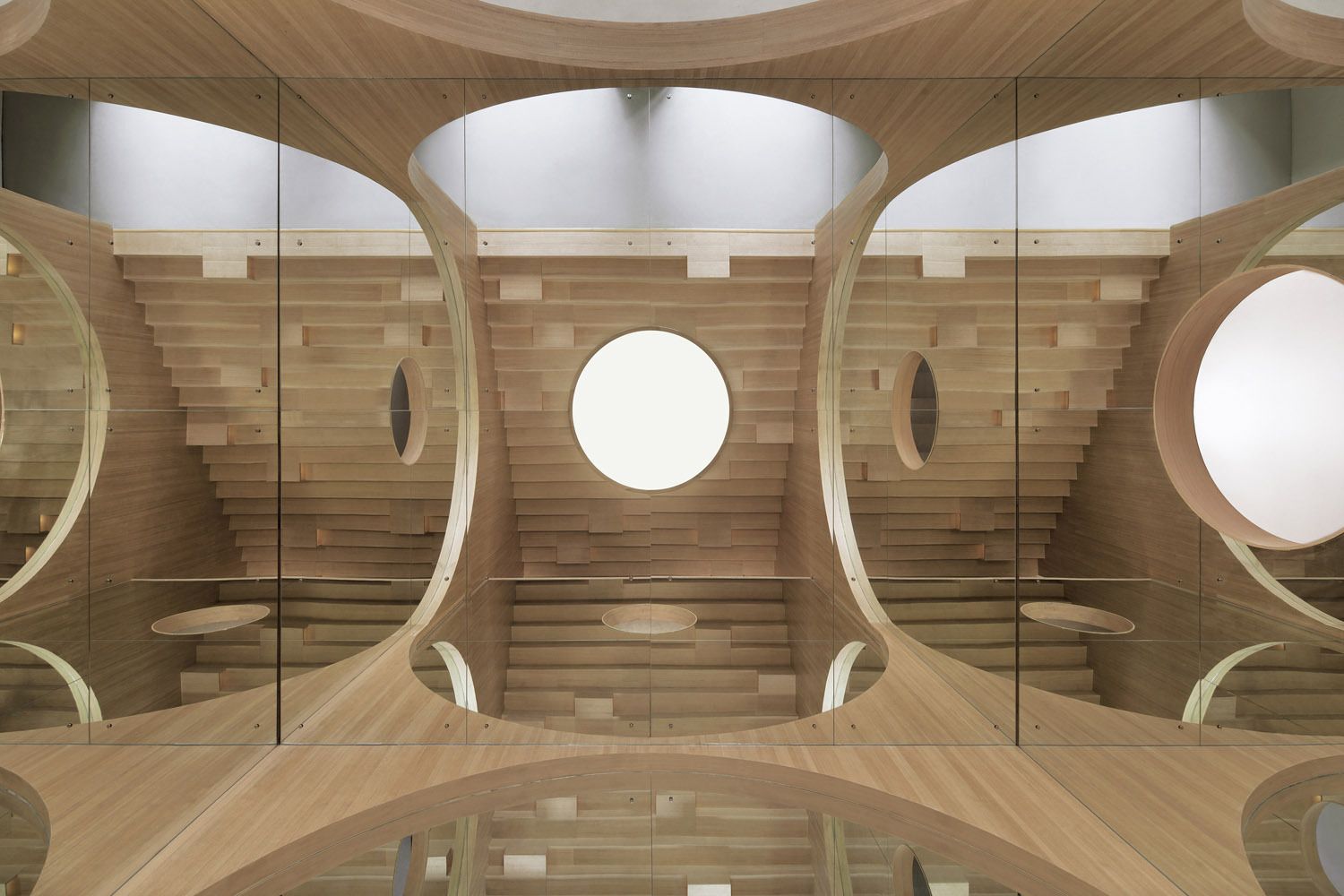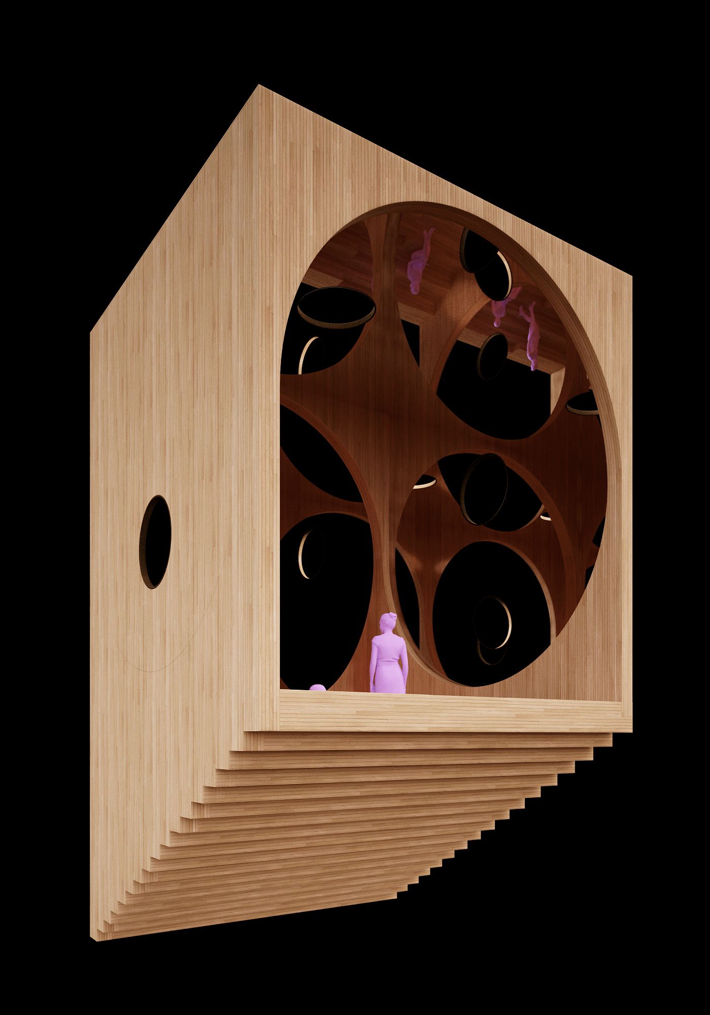 main lecture space.Within the box, visitors immerse into a landscape of wooden arches and circles that are mirrored on each side and on the ceiling. Inspired by artworks of Dali and Escher, the reflective landscape creates a skewed and distorted reality and connects visitor to art in a direct and interactive way. Rather than looking at anartwork, people can experience the artwork physically to widen their imagination.