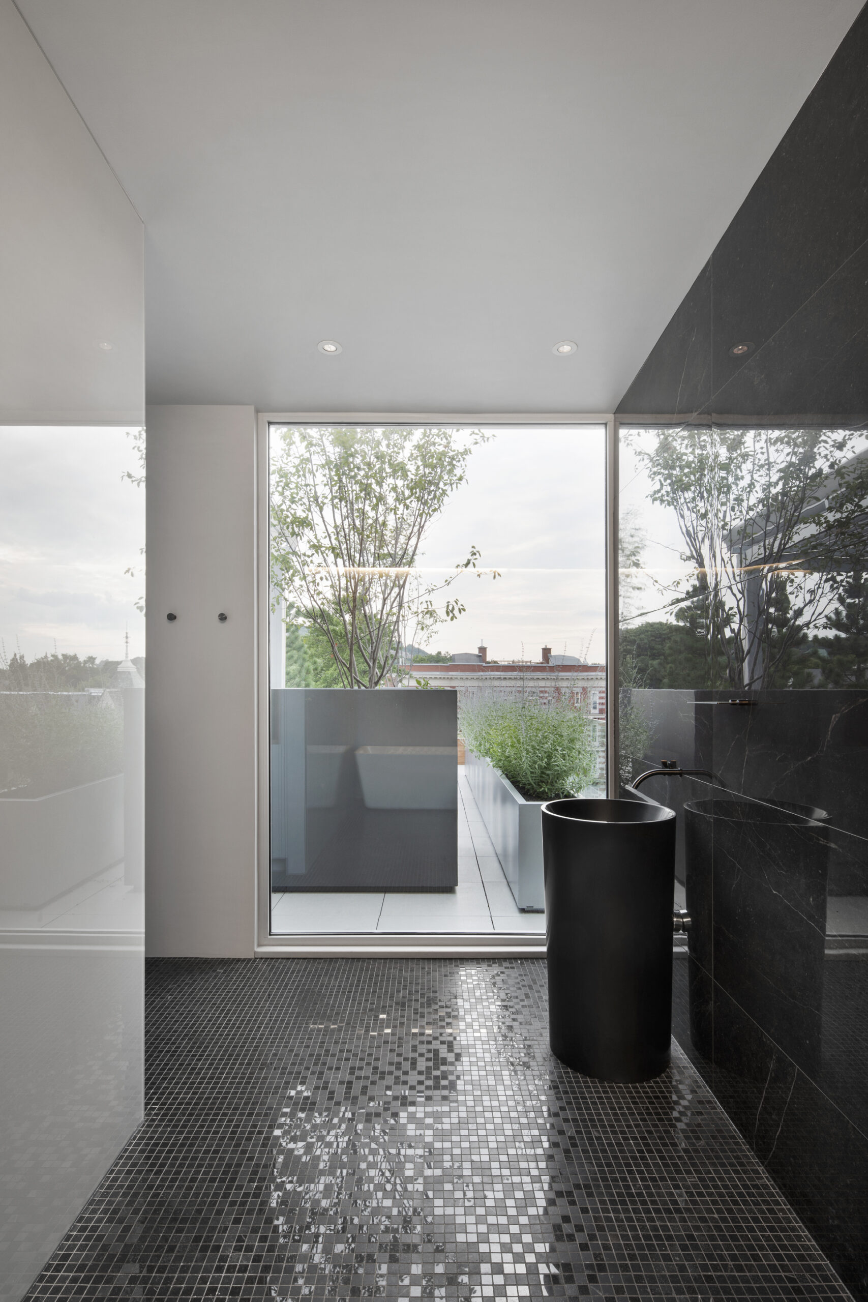 Integral to the design is a central courtyard that funnels natural light into the center of the structure and provides efficient access and ventilation for all of the residential units. The upper units occupy two floors, with the front giving onto a large private roof top terrace overlooking Montreal’s Mount Royal.