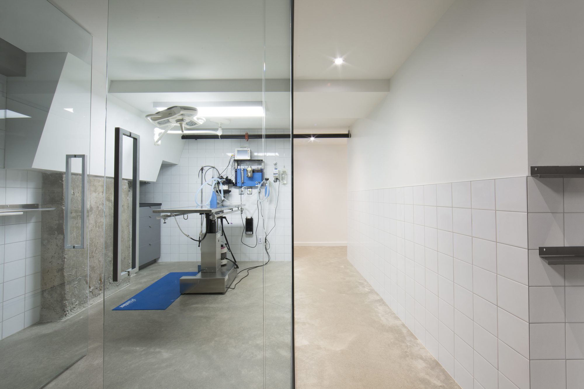 Technical spaces are efficiently organized around a central circulation spine, allowing for a spacious reception where animals and owners alike can circulate freely. Friendly custom furniture in Corian and orchestrated glimpses through glazed partitions seek to ease anxiety and subvert traditional doctor/client/patient formality.