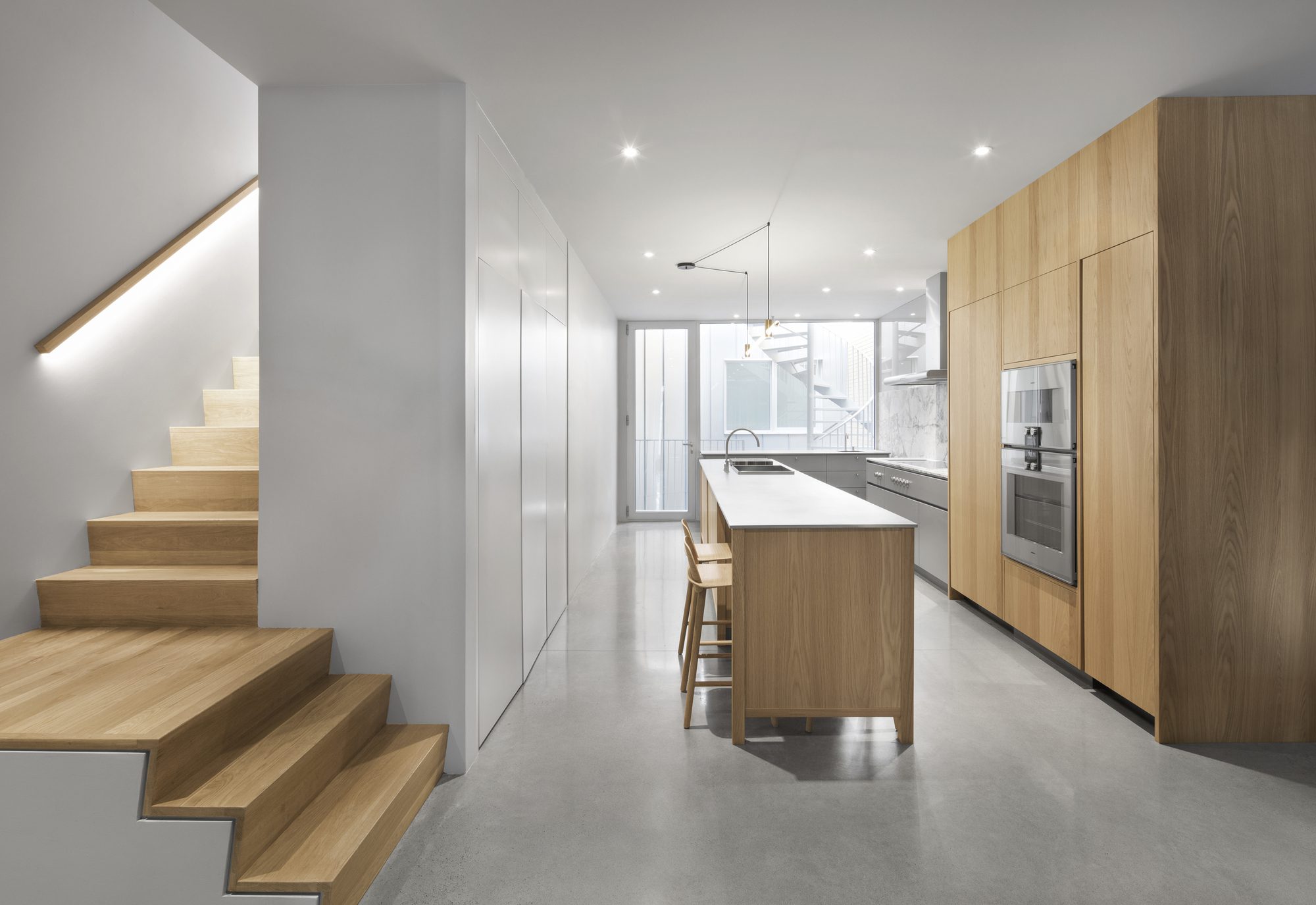 On the exterior, the building is restrained and monochromatic. The façade is clad in a single material, a grid of local limestone quarried 50 km away. A tripartite stacking plays on the city’s layered façades, delineating the residential units through tiered setbacks over a generous glass storefront. Subtle aluminum details surround windows and doors, and finely perforated guardrails fade into the monochromatic background. Fully glazed balconies are punched into the façade giving tenants’ added privacy while streamlining the building’s form.