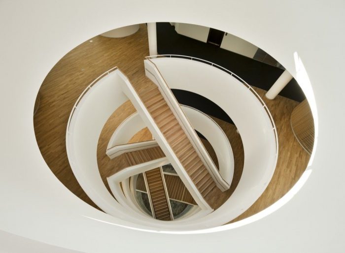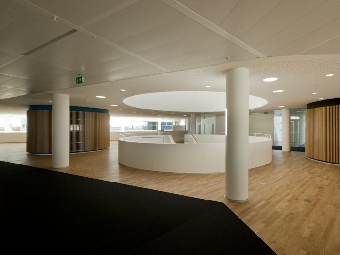 Inside, the building appears light and open with a flexible structure encouraging informal meetings and knowledge sharing. The dynamic atmosphere is intensified by the complex and innovative exterior expression.