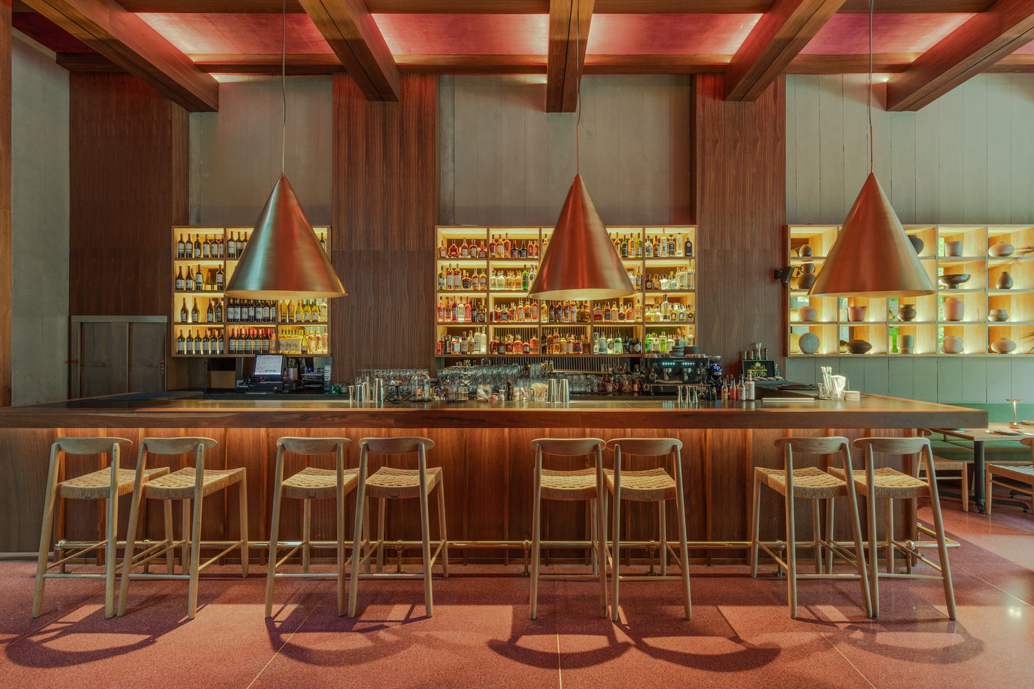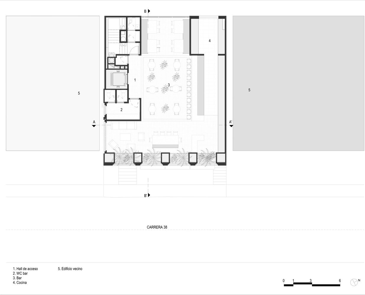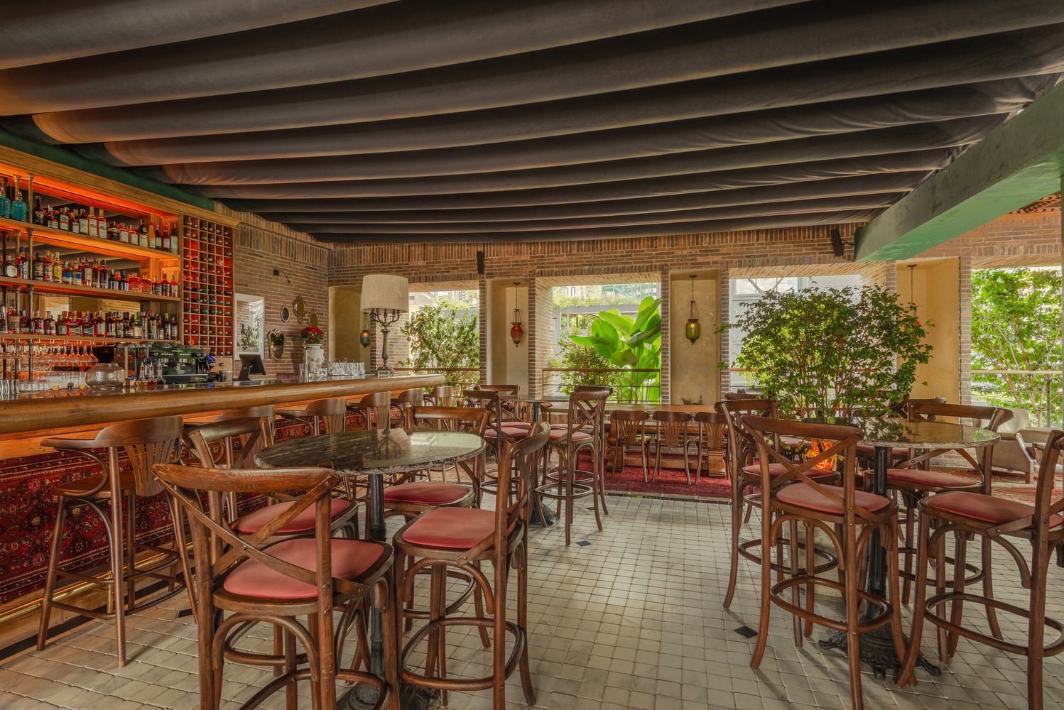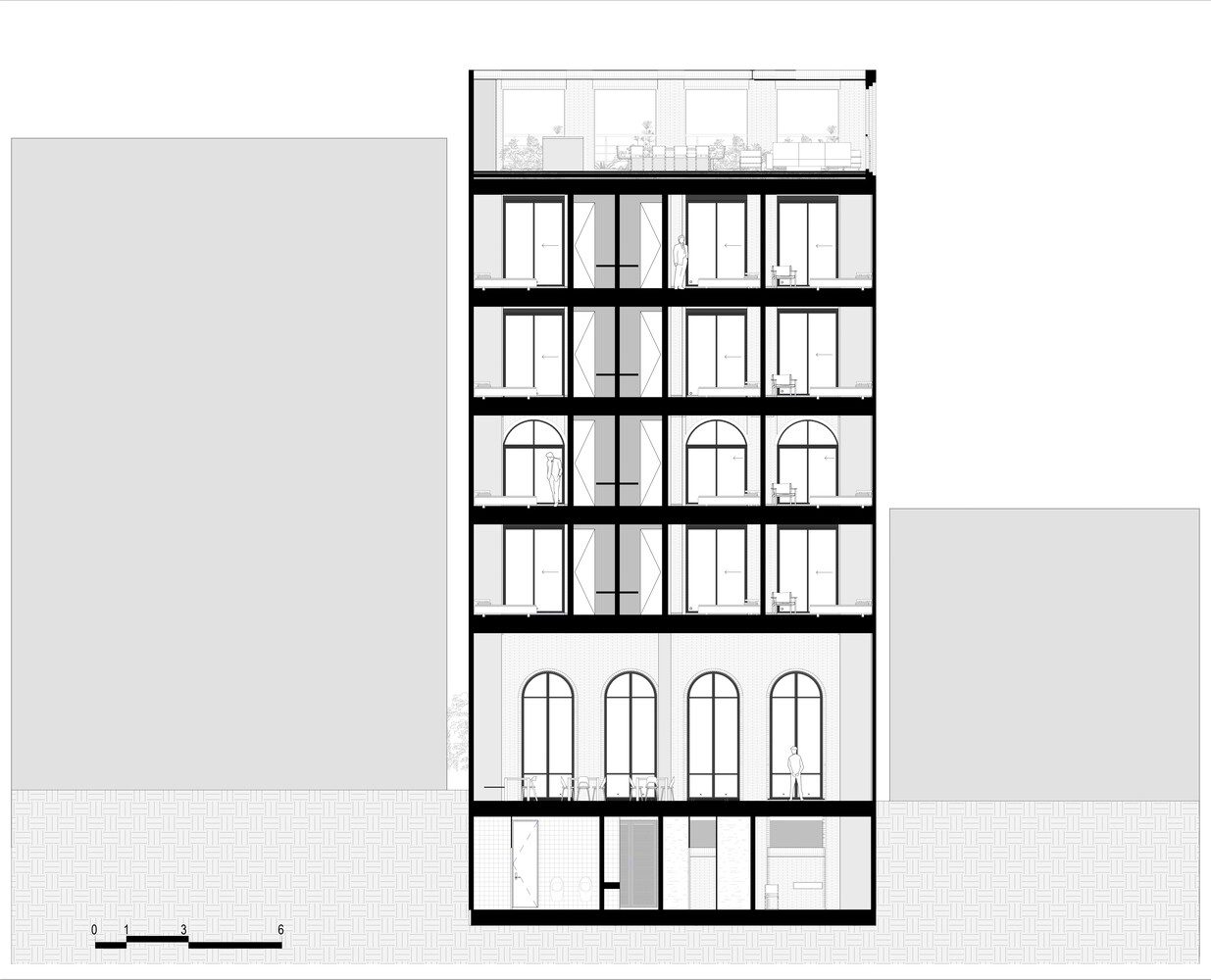 The hotel has seven levels, distributed as follows: a basement level that serves all technical needs, a first level with a restaurant and lobby, four levels of rooms, and a rooftop terrace with a bar. The bar, inspired by a vintage style, has the option of being open or closed thanks to a retractable fabric pergola, allowing the space to change over time and host different activities. The building is located between two party walls, so for the natural ventilation and lighting of the spaces, we could only rely on the eastern and western facades.