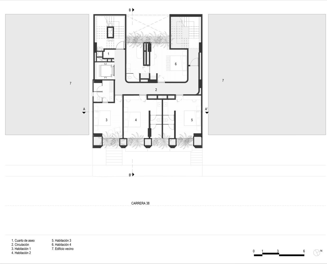 We started from the premise of placing the hotel’s service areas, such as shafts, elevators, and stairs, towards the party walls to maximize the facades and ensure that each room has a direct connection to the exterior. The first and last levels of the project are spaces we are giving to the city, with a restaurant and a bar open to the public, allowing not only hotel guests but also visitors to enjoy them. The large facade frames different views; each level has variations in its windows, incorporating arches and porticos that enrich the interior space. From inside, every window offers a view of a garden, and beyond that, the city and the mountains.