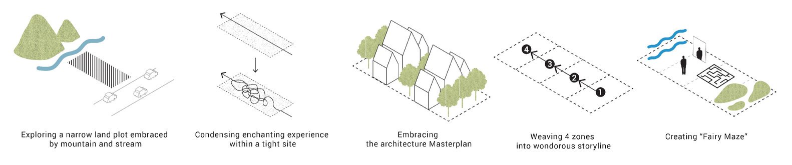 Hotel Labaris is divided into 4 zones. Each zone narrates a chapter of a fairytale through a unique conceptual feature of the project, a maze. A maze in each zone has a different design that illustrates a concept of each fairytale chapter and also weaves all chapters together into a whole storyline. The winding mazes also elongate visitors’ experiences in spaces that are actually limited. An axis goes from the project entrance and cuts through the 4 zones forward to the far back of the project, separating the whole area into 2 symmetrical sides.