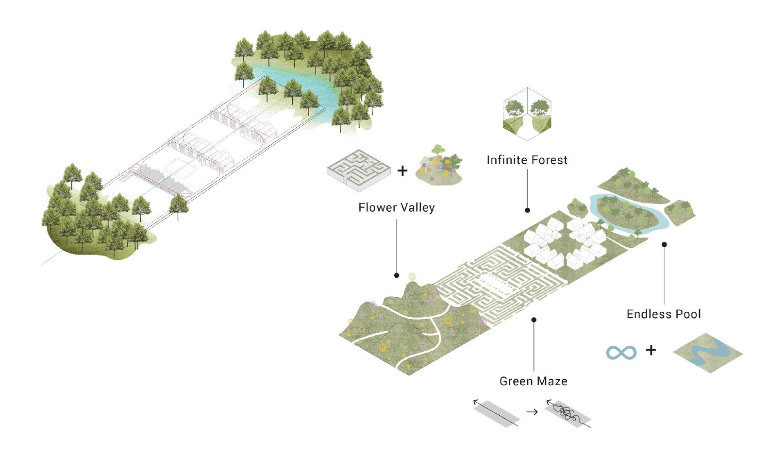 Flower Valley – A road cuts through natural scenery and leads to the project that has no border structure and seamlessly connects with surrounding nature. The project’s frontage area, The Flower Valley zone, consists of a flowery mound maze with winding walkways go in-between. The maze is a natural border separating the frontage zone that is open to the public and the inner zones reserved for resort guests. The 2-3 meters high mounds also visually shield the project area from outsiders. A café is hidden under a mound like a fairy underground house. In front of the café, lies a lawn catering for events or activities, such as concerts or wedding parties. At a corner of the zone, a playground is hidden among the mound maze, surrounded by a seating area for parents to relax while watching over their kids.