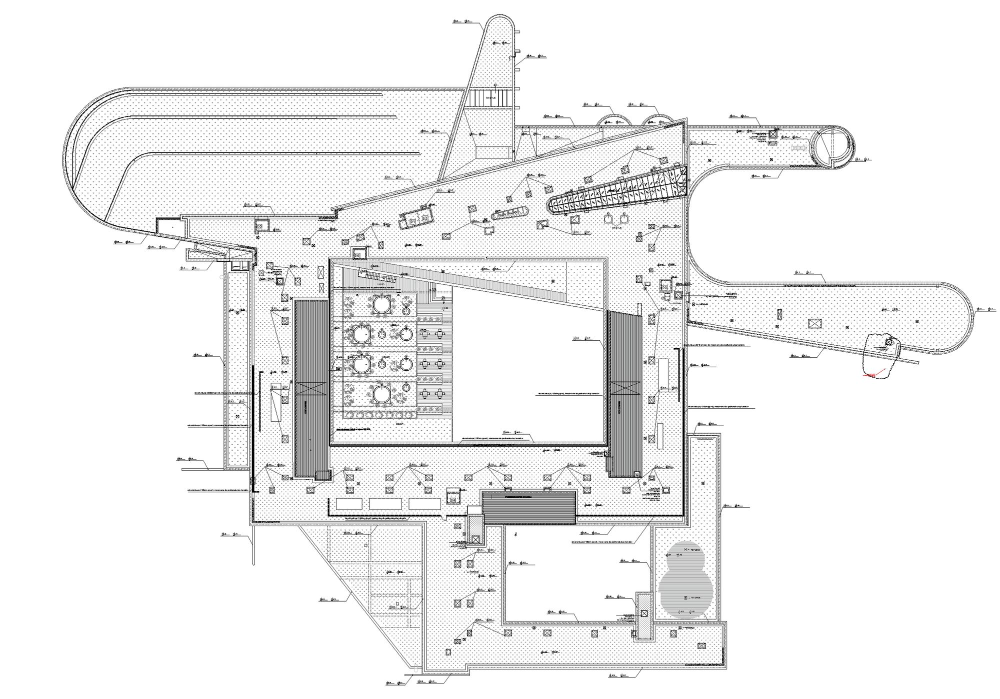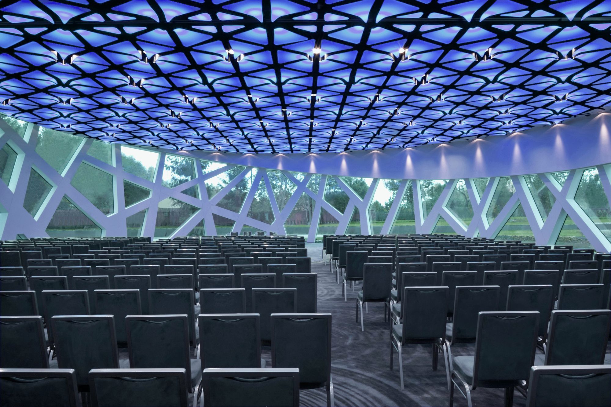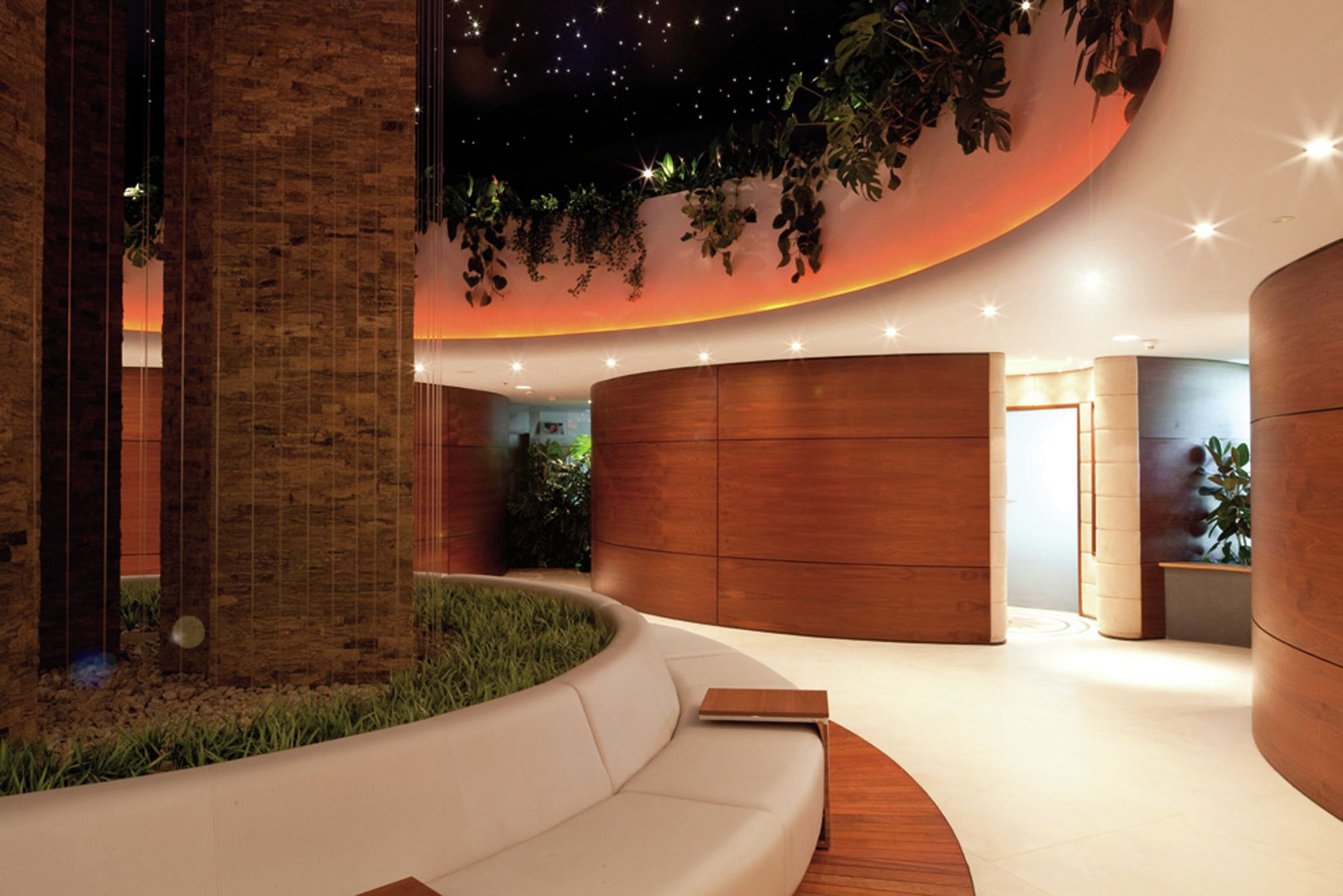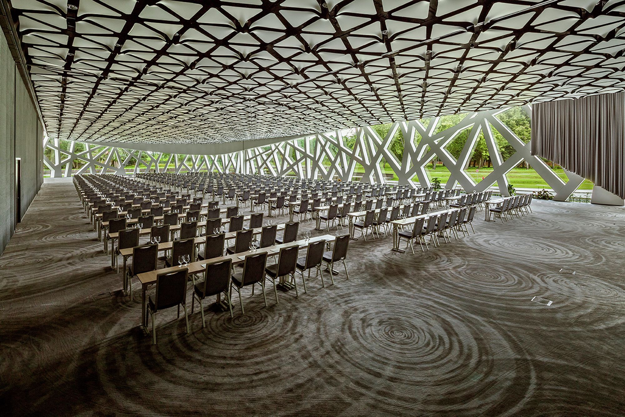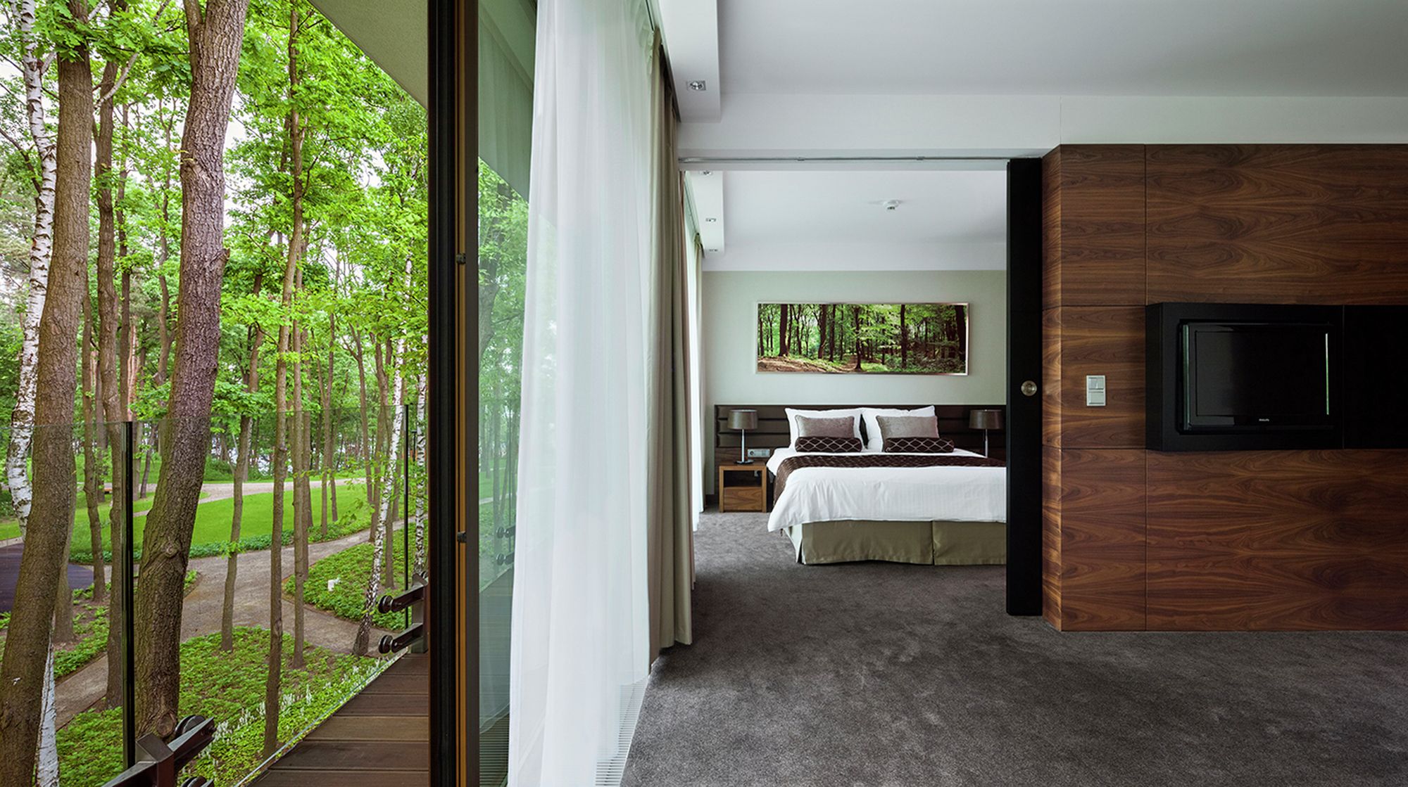 The priority while building the hotel was to keep a perfect harmony with an environment and to interfere as little as possible. Surrounding trees were the main inspiration for design concept of the hotel. Their beauty, age and energy had an impact for the way of thinking about the project. Picture of lime tree’s crown became an impulse for creating organic wall which extends from cafeteria, corridors, apartments, swimming pool and Spa.