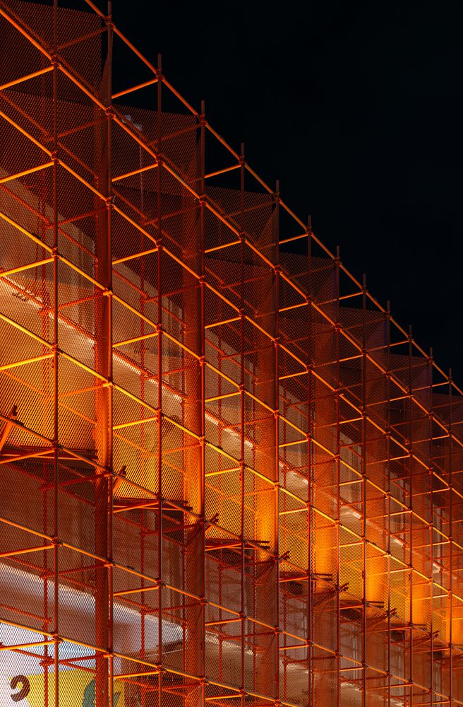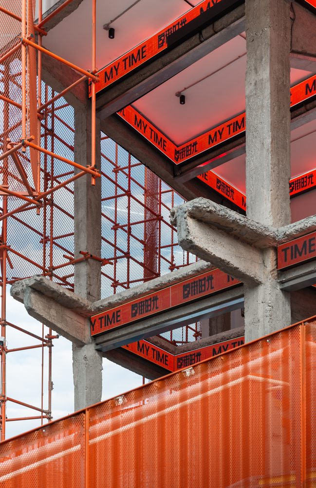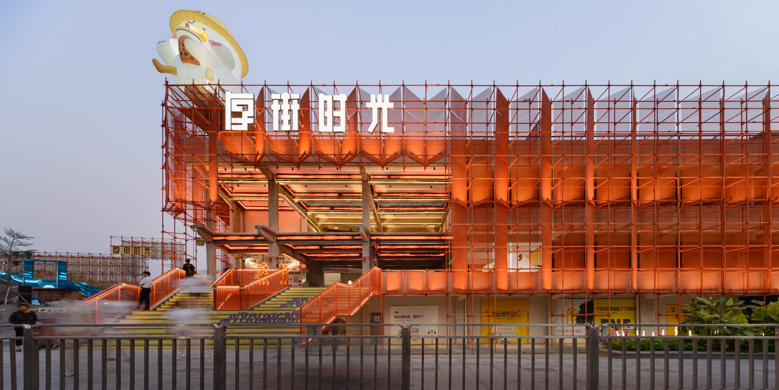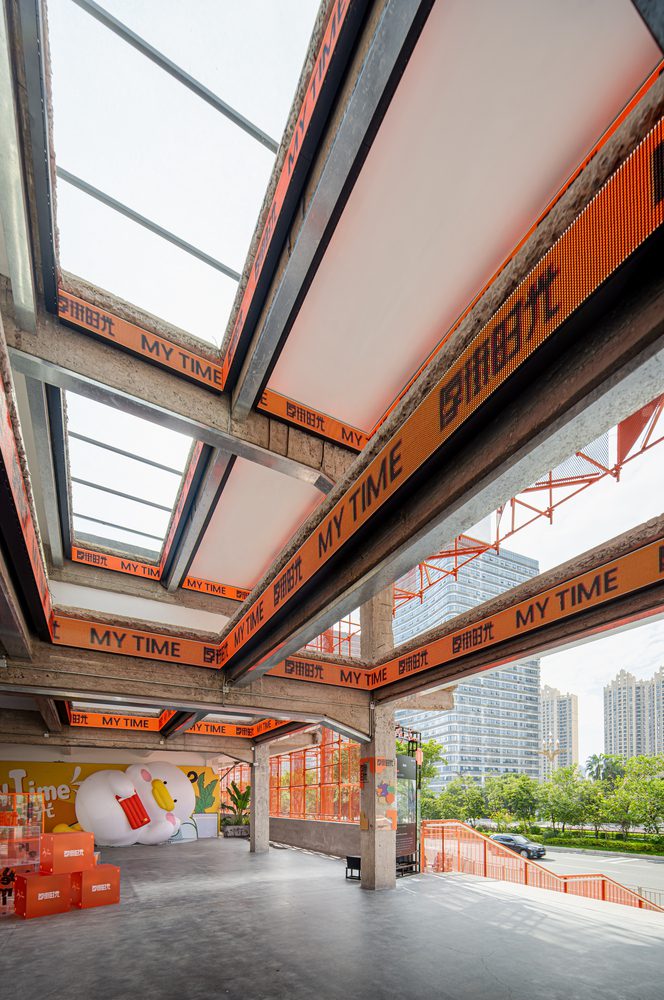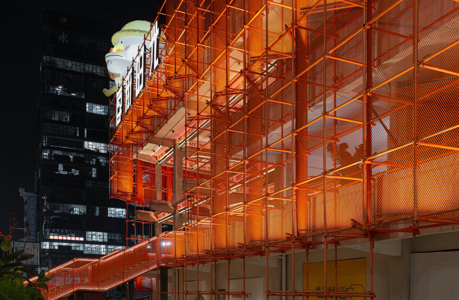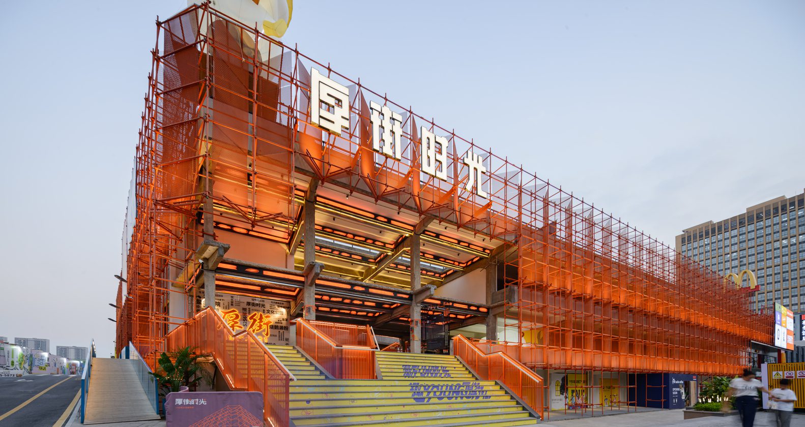 Building upon this spatial foundation, we then employ an “addition” strategy by incorporating scaffolding as a featuring element of facade installation which is commonly seen in construction sites. This not only introduces a sense of high innovation to the space but also shapes the project’s unique overall image, creating memorable points and enhancing recognition. More importantly, the lightweight nature of these materials and the flexible construction method align perfectly with Houjie’s continuous development process of adapting to changing times. Even in the face of the rapid iteration of the current commercial market, this adaptable and changeable design can respond to subsequent project operational changes swiftly and efficiently.