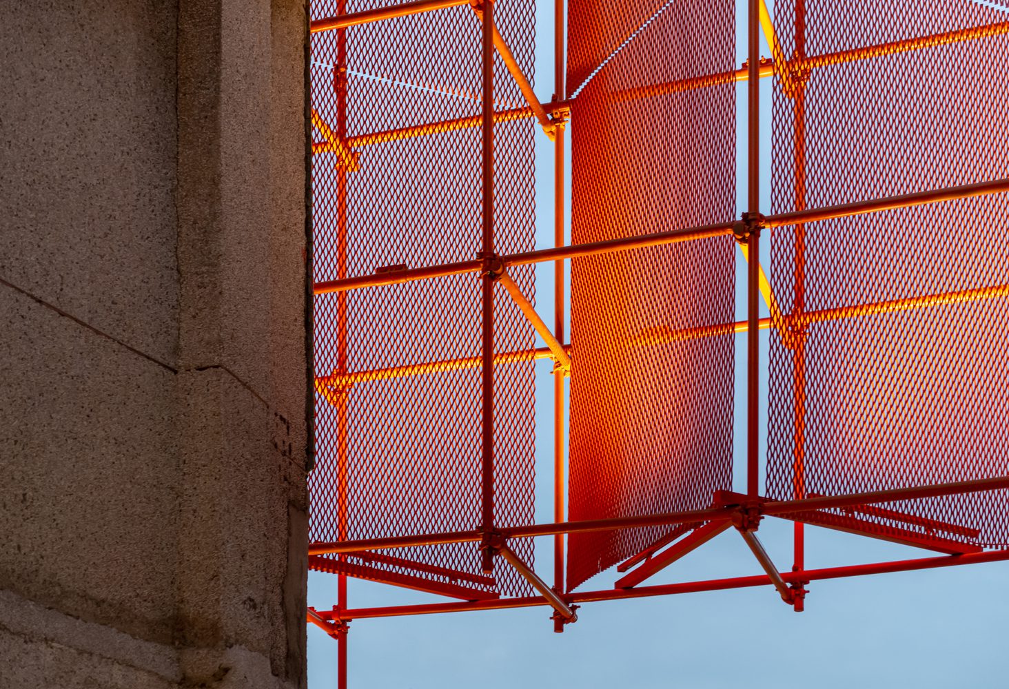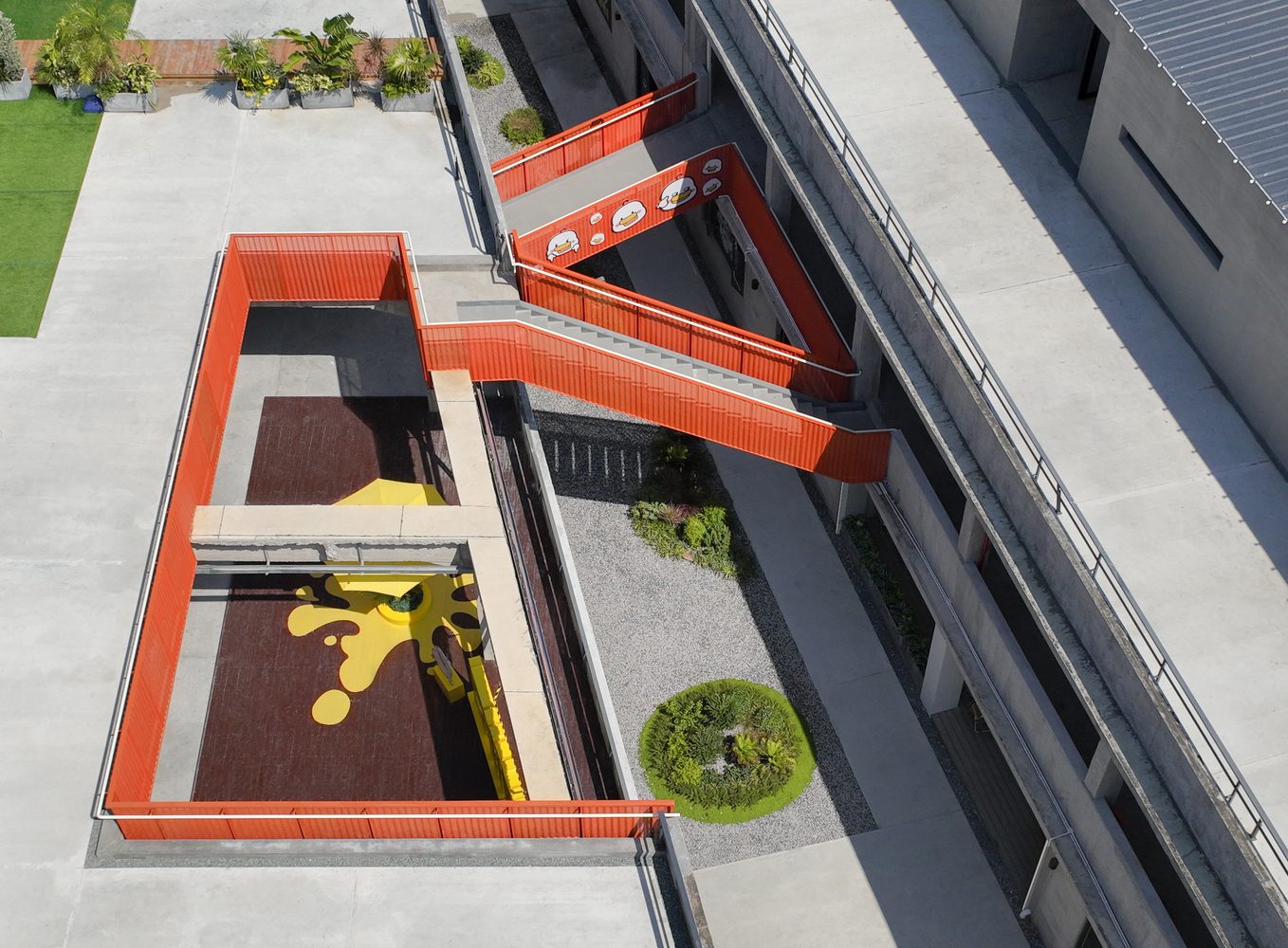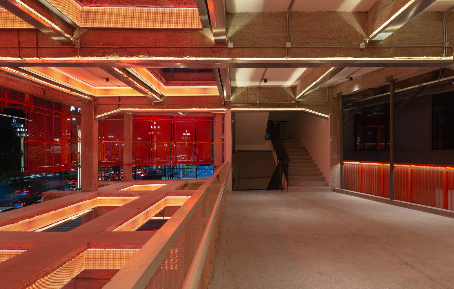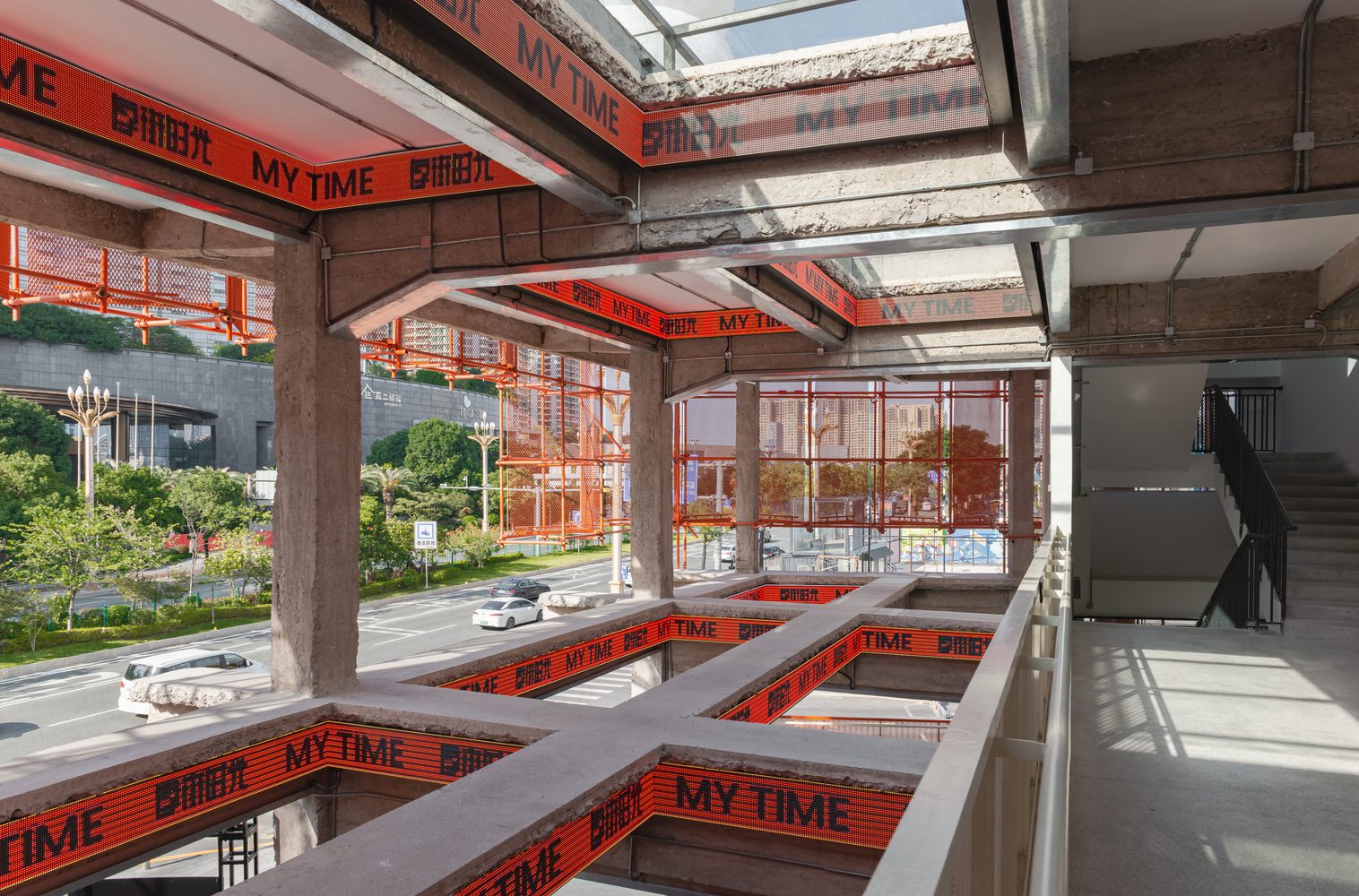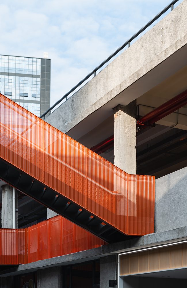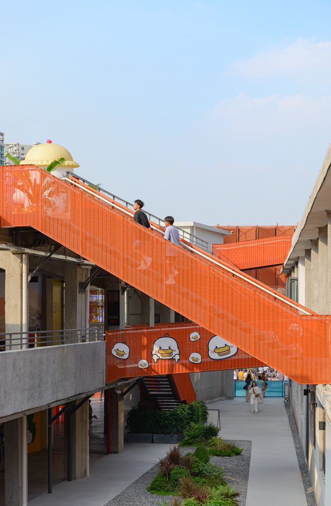 Building upon this spatial foundation, we then employ an “addition” strategy by incorporating scaffolding as a featuring element of facade installation which is commonly seen in construction sites. This not only introduces a sense of high innovation to the space but also shapes the project’s unique overall image, creating memorable points and enhancing recognition. More importantly, the lightweight nature of these materials and the flexible construction method align perfectly with Houjie’s continuous development process of adapting to changing times. Even in the face of the rapid iteration of the current commercial market, this adaptable and changeable design can respond to subsequent project operational changes swiftly and efficiently.