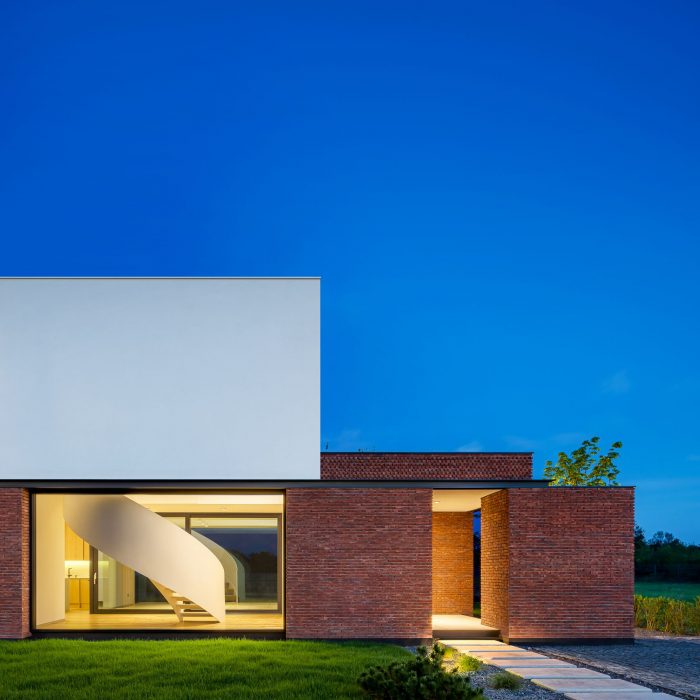 The staircase, the sculptural element of the house, takes us to the night spaces that we envisioned as a nest, that sits protected on the brick wall, completing the symbolism of the house.