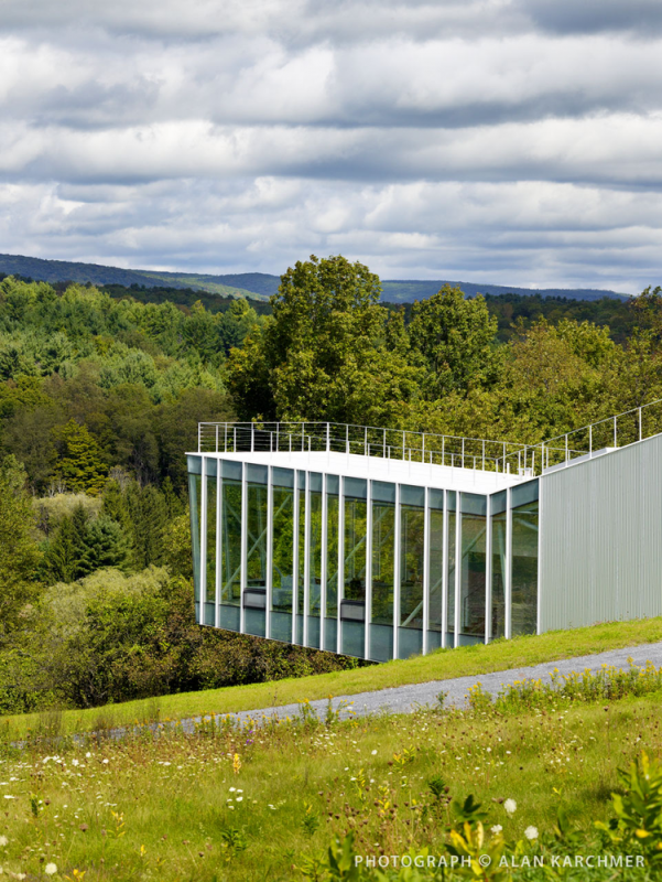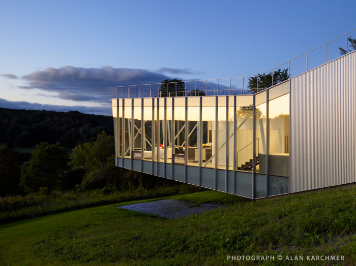 The Tanglewood 2 residence, designed by Schwartz/Silver Architects is conceived of as a secondary residence for the architect’s violinist wife. It was inspired by the observation of a Grand Canyon sunrise from the edge of a precipice which jutted out over the canyon. It is a 45 foot cantilever that extends out over a sharp slope. Behind and below the cantilever is space for three bedrooms and a living room.