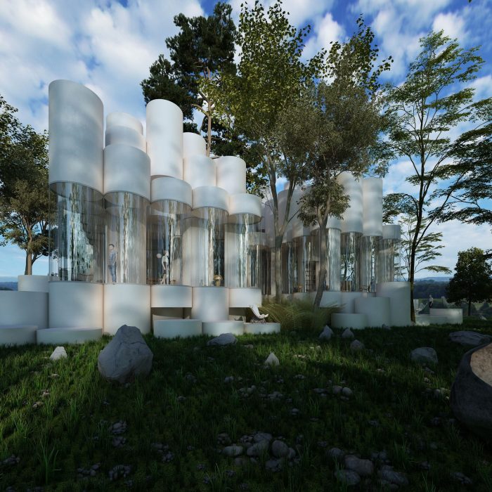 The cylinder house is designed to fit between the trees of a wooded lot near Lyon, France. For this house, the plan is based on a juxtaposition of a simple element, a cylinder. This cylinder can be opened, semi-open, closed, whatever its disposition it participates in the delimitation of space.