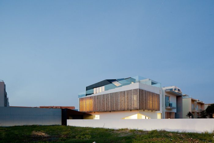 House in Miramar designed by e|348 Arquitectura, It is a building consisting of two distinct adjacent and interrelated volumes, the housing itself – consisting of two stories plus a penthouse – and a garage.
