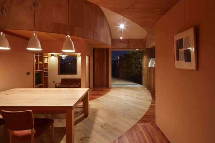 House in Mukainada. Clients desired a house suitable for an elderly couple where gardening could be enjoyed. They also wanted a large space to be able to run a variety store and host a gallery or workshop in future.Therefore, we proposed a house with a planted walkway outside of the house. Outside of the house, we created wide rounded-shape earthen floor (doma) connected to the house. By planting flower and trees in and around the earthen floor (doma), the walkway appears.