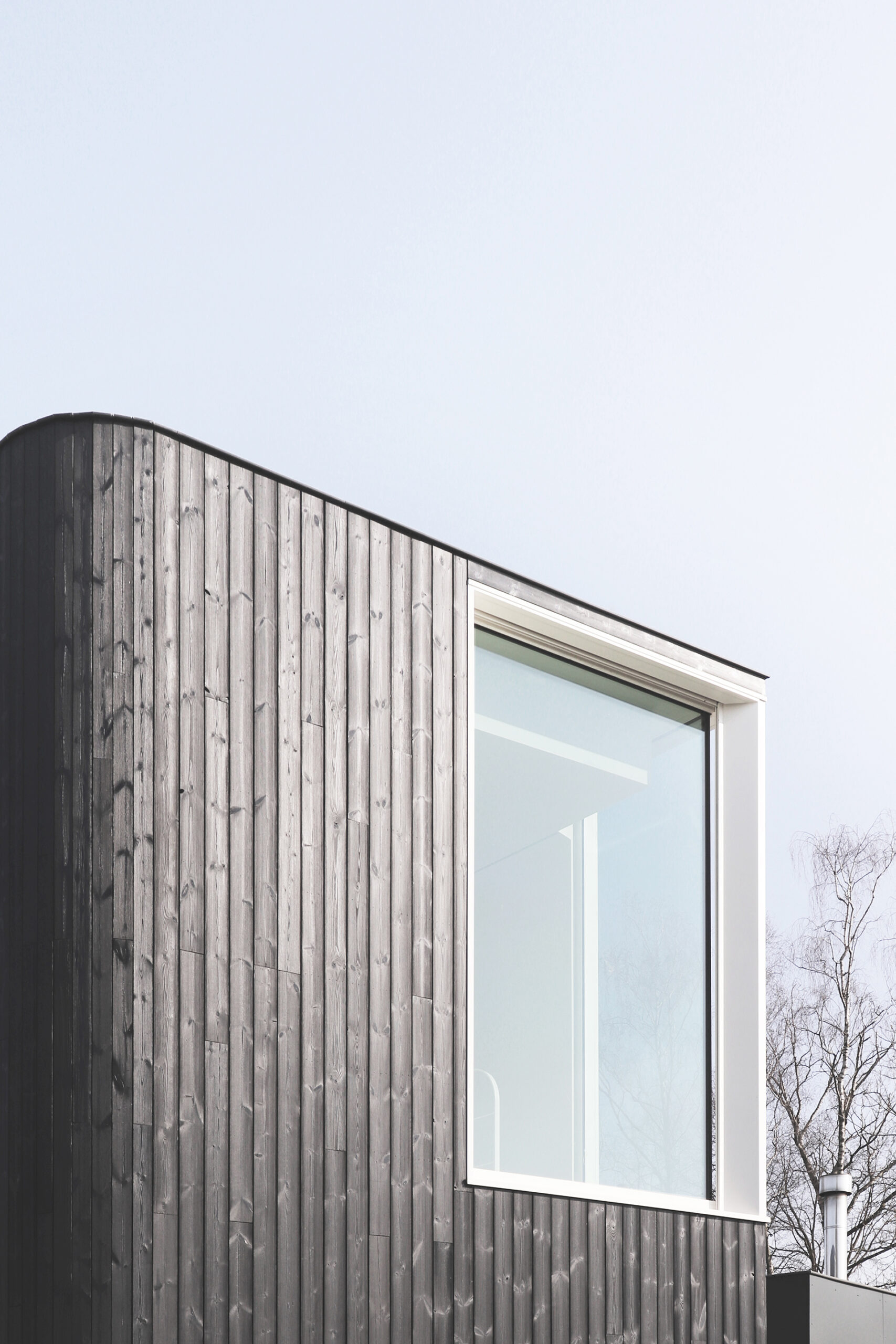 On the rear facade, it blends tone on tone with the existing context. The wood texture breaks with the horizontality of the half-brick bond. In contrast to the front facade, here the visual separation is achieved vertically. The new section was given the appearance of a slender lookout tower in response to the low expanse of the bungalow. Old and new coexist comfortably.