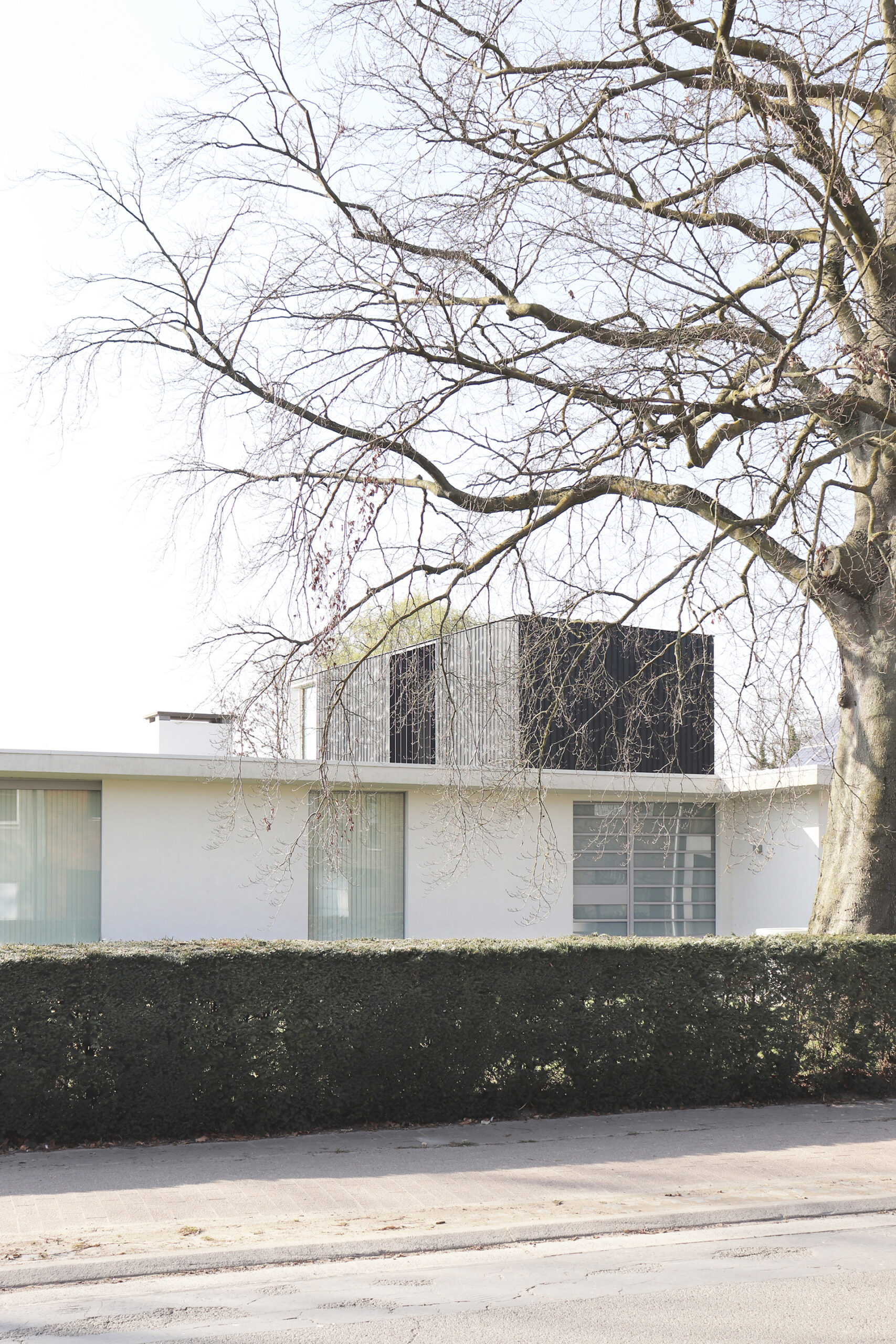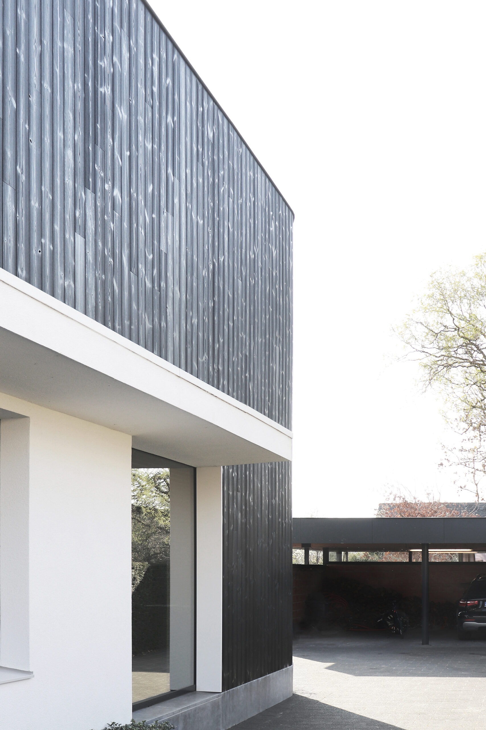 House MV concerns a bungalow from the 1950s located on a spacious plot with a green character. In the 00s, the house was extended at the rear facade with a ground floor volume in dark gray brick. The main volume also received a new cladding in white plaster with gray aluminum window frames. The characteristic canopy around the gently sloping roof was retained as a visible reminder of the original post-war villa that was concealed in the stucco. A house with two faces was formed: a white abstraction of the past on the front facade stands in stark contrast with the dark stone no-nonsense architecture on the rear facade.