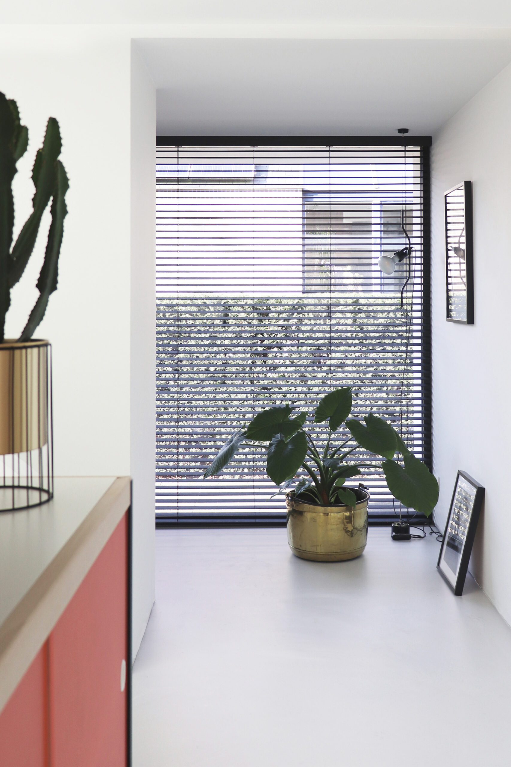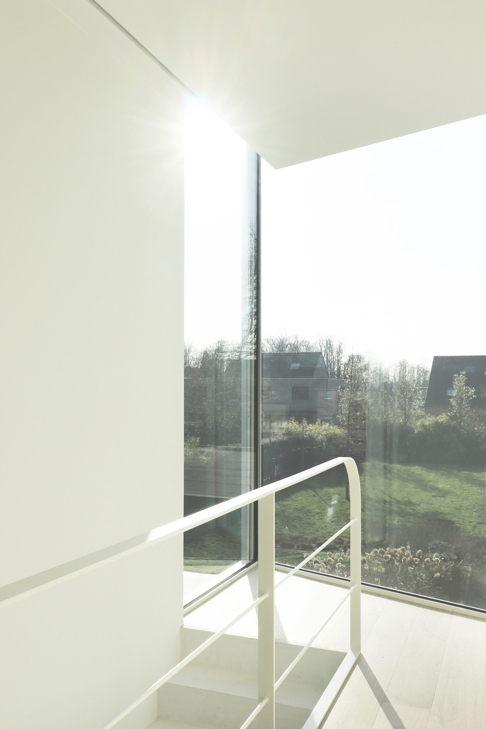 A view of the green surroundings was an indispensable feature of the bedroom. On the sidewall, aluminum louvers provide the necessary shade and privacy from the street side. A glazed steel interior door creates a deep view through the night hall to the backyard. This corner window allows natural light to penetrate deep into the home through the stairwell. It also provides a continuous visual connection with the environment through circulation.