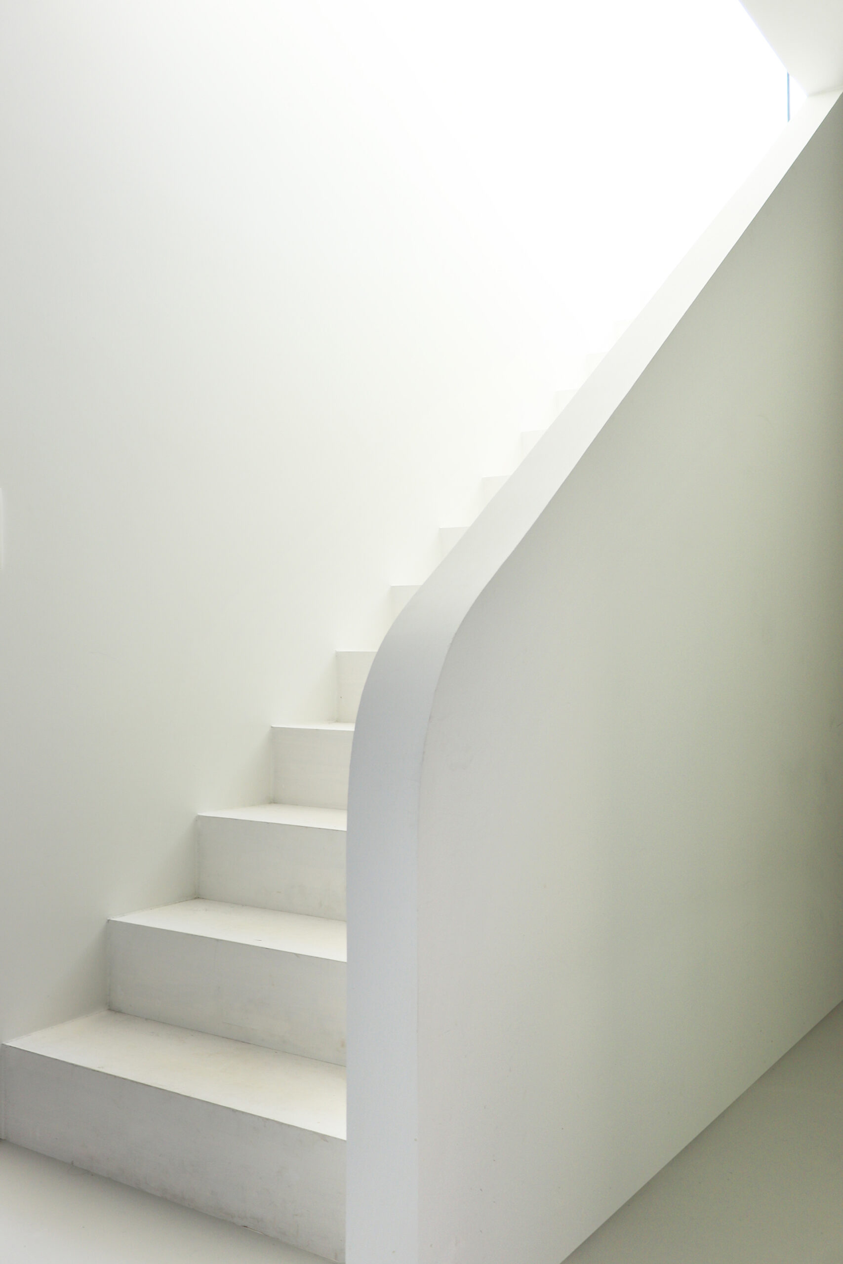 The bathroom forms an intimate cocoon. Here the walls embrace the shower area. A skylight provides abundant daylight while maintaining privacy. On the ground floor, only the staircase and a wall of cupboards serve as space-separating elements. The staircase volume conceals a toilet area, while the wall of cupboards doubles as a wardrobe closet at the back door and as a linen cupboard in the laundry room.