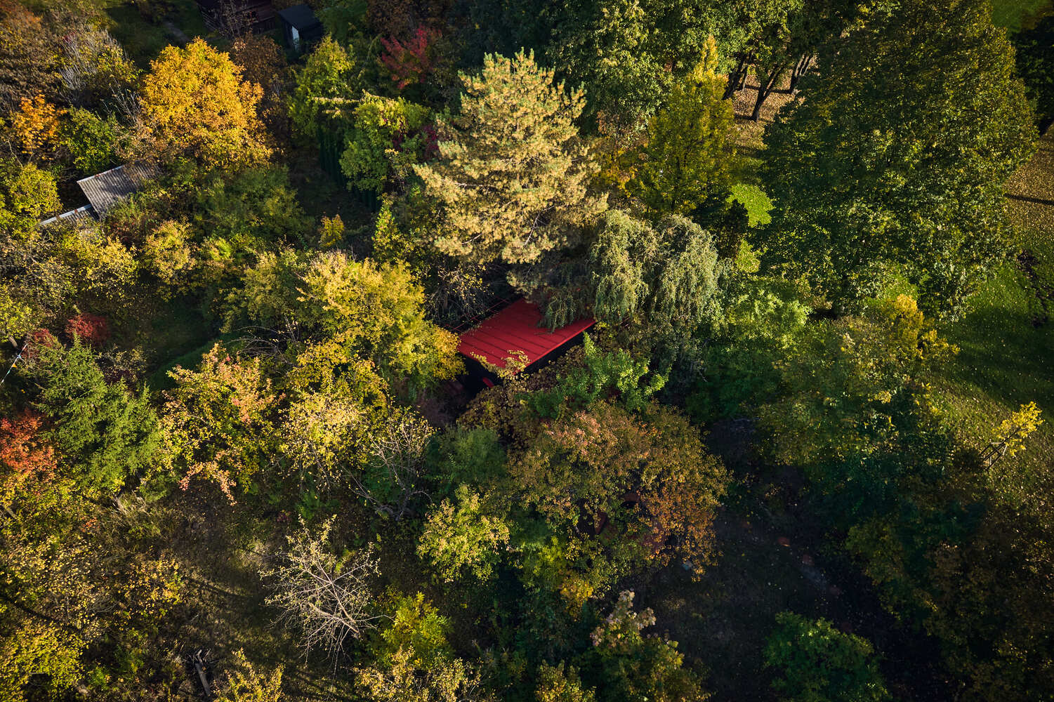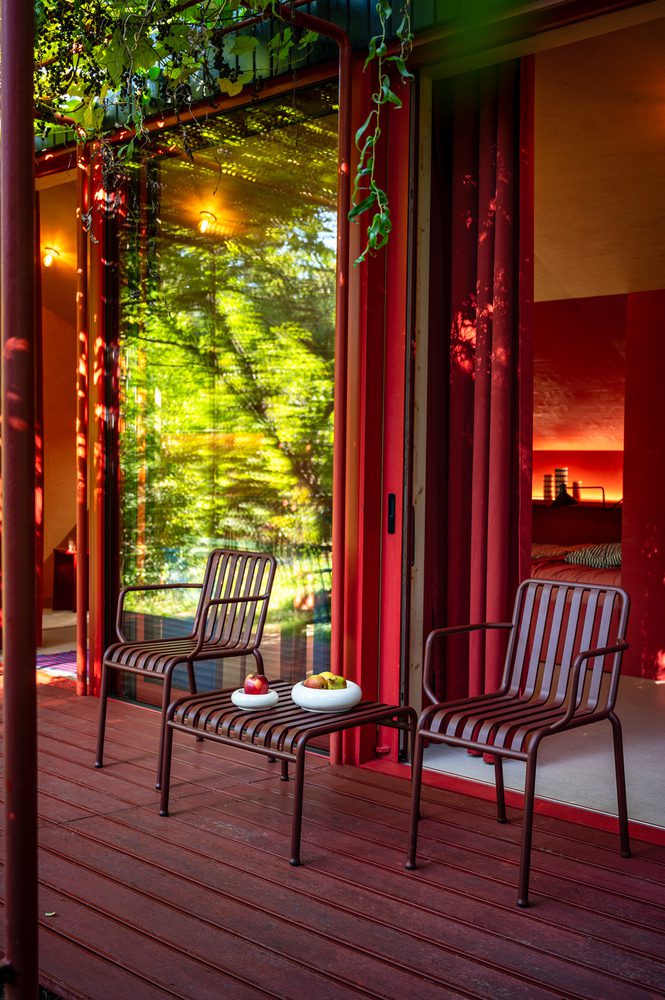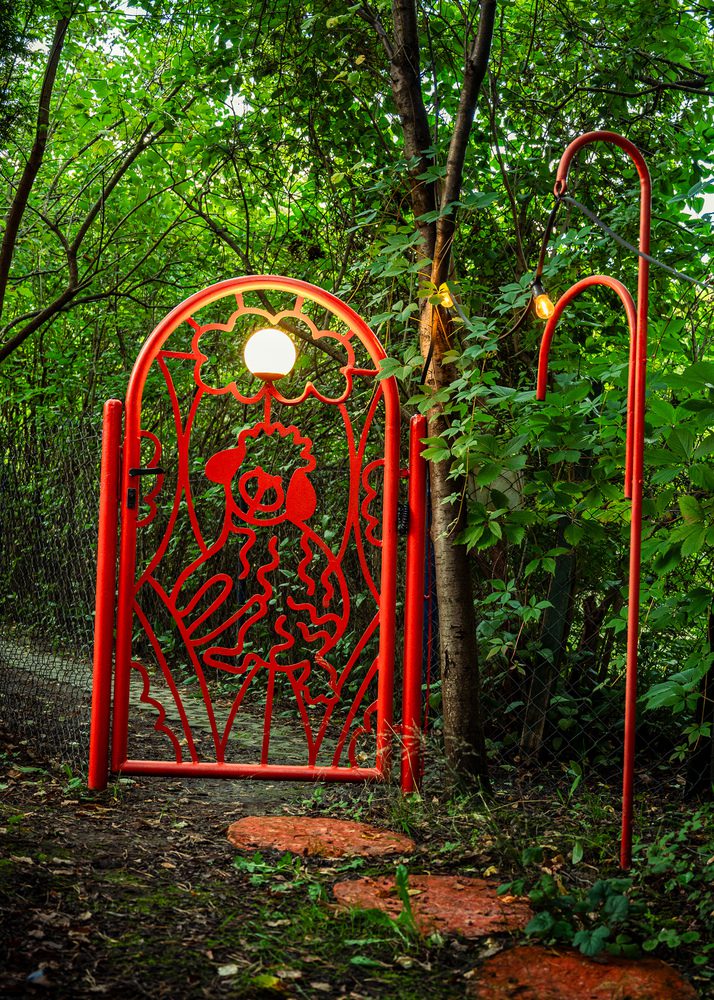 House of Color Downtown Oasis, Trends and individuality – Magda and Grzegorz chose the garden based on personal reasons, but they also tapped into a broader trend. Just a few years ago, allotment gardens (ROD) in Poland were not in high regard, which was accompanied by increasing pressure from developers to build on Warsaw’s green spaces. Not far from here, in Berlin, the frenzy for allotments has been going on for a decade. After all, it’s the simplest way to have your own garden, green space, silence, and grow your own flowers, vegetables, or fruits. And all of this is close to home, not somewhere at the edges of civilization – emphasizes Karol Pasternak from NOKE Architects, one of the project’s authors. In recent years, allotment gardens in Poland have been doing quite well. They flourish and bear fruit, and produce a specific and noteworthy culture. It’s become customary that the gates to individual gardens are also their pride and distinctive feature. With original forms, they reflect the personalities of individual owners, and the members of the gardening community – explains Piotr Maciaszek from NOKE Architects, the second designer. It’s no different in this garden. The original red gate with a round lamp was created according to Magda’s drawing, with an image of their beloved dog, Lusia, in the central part. The gate is all the more significant because it’s the only element of the layout visible from the alley. The house, deliberately hidden, gradually emerges from the greenery only after entering the garden.