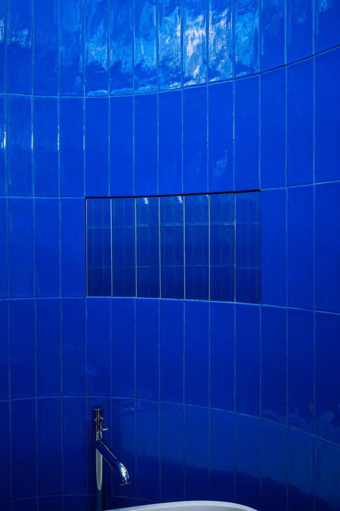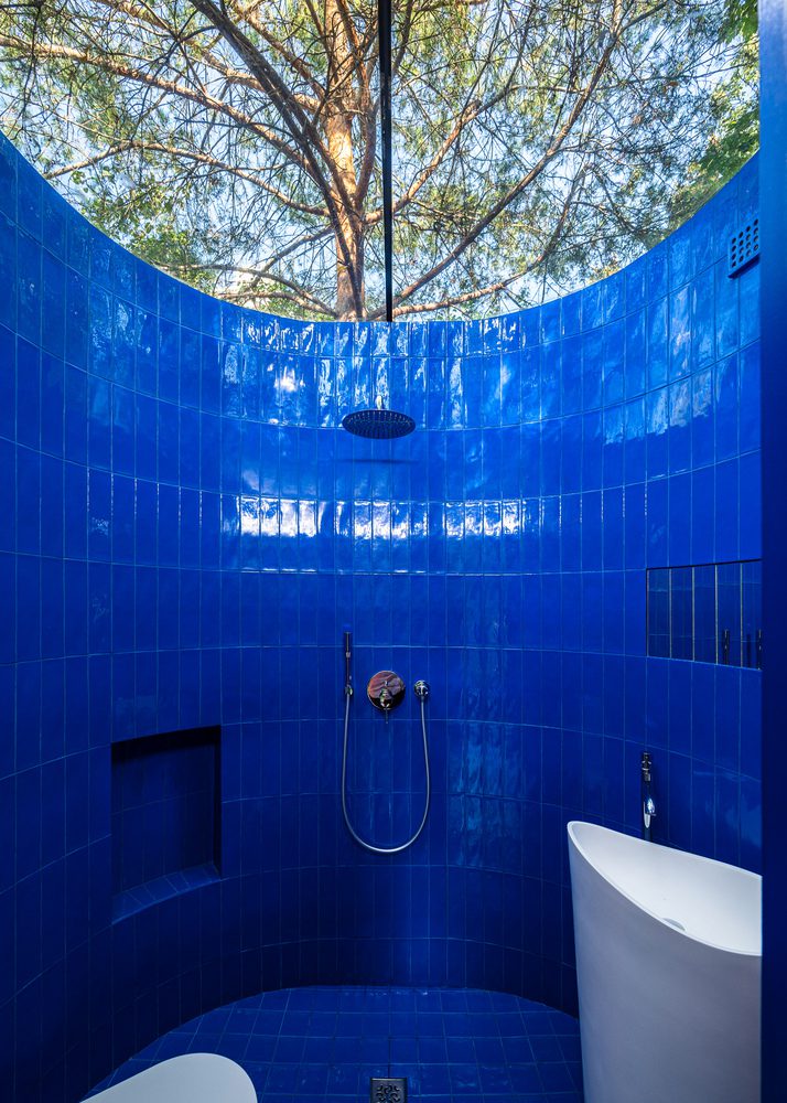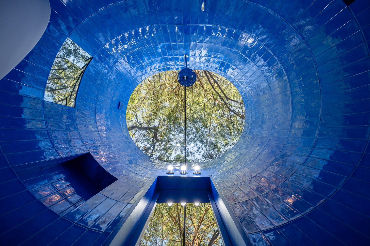 Next to the kitchen, attention is drawn to a semicircular window. In every project, we try to wink at the viewer – winks Karol Pasternak. Here, all you need to do is open the shutter to gain an additional view of the garden. It’s both functional and artistic. Art integrated into the wall. An even bigger surprise awaits in the bathroom. The red chimney, protruding from the green mass of the house, turns out to be an oval capsule with a shower, sink, and toilet. After dark, this extraordinary room is illuminated by small spherical lamps, and their light reflects off the glossy cobalt tiles and mirror panels. Late at night, it’s great to turn off the lamps and bath, enjoying the view of the Warsaw sky through the glass roof.
