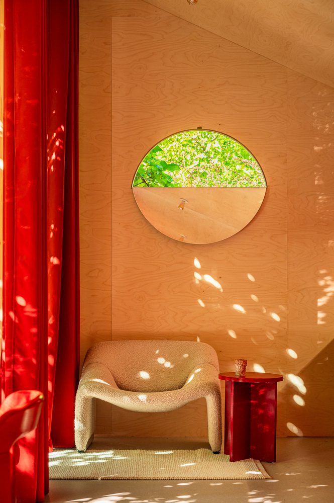 Color, naturally – The lush, free greenery contrasts with the cherry-raspberry hues of the gate, path, trellises, or table – and above all, the colors of the interiors. Here you’ll find a living space with a kitchen and workspace for Magda and Grzegorz, a sleeping nook, and a bathroom. Compact spaces blend with the garden through large-format glazing which can be opened up on sunny days. Then both work and leisure move to the terrace. The walls and ceilings of the cottage are covered with plywood stained with natural, eco-friendly oils. The wall parallel to the glass has a raspberry shade. The same color in many variations appears on window frames, curtains, kitchen fittings, and many pieces of furniture and accessories. They are balanced by delicate tones of wood, transitioning into gentle beige fabrics or muted gray flooring. They harmonize with the organic forms of the furnishings.