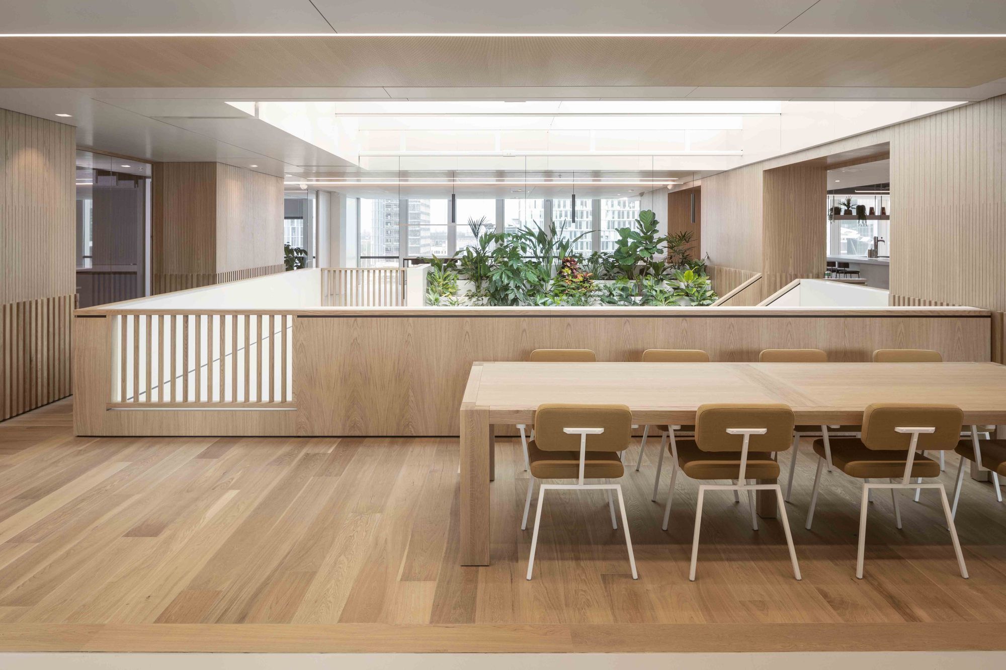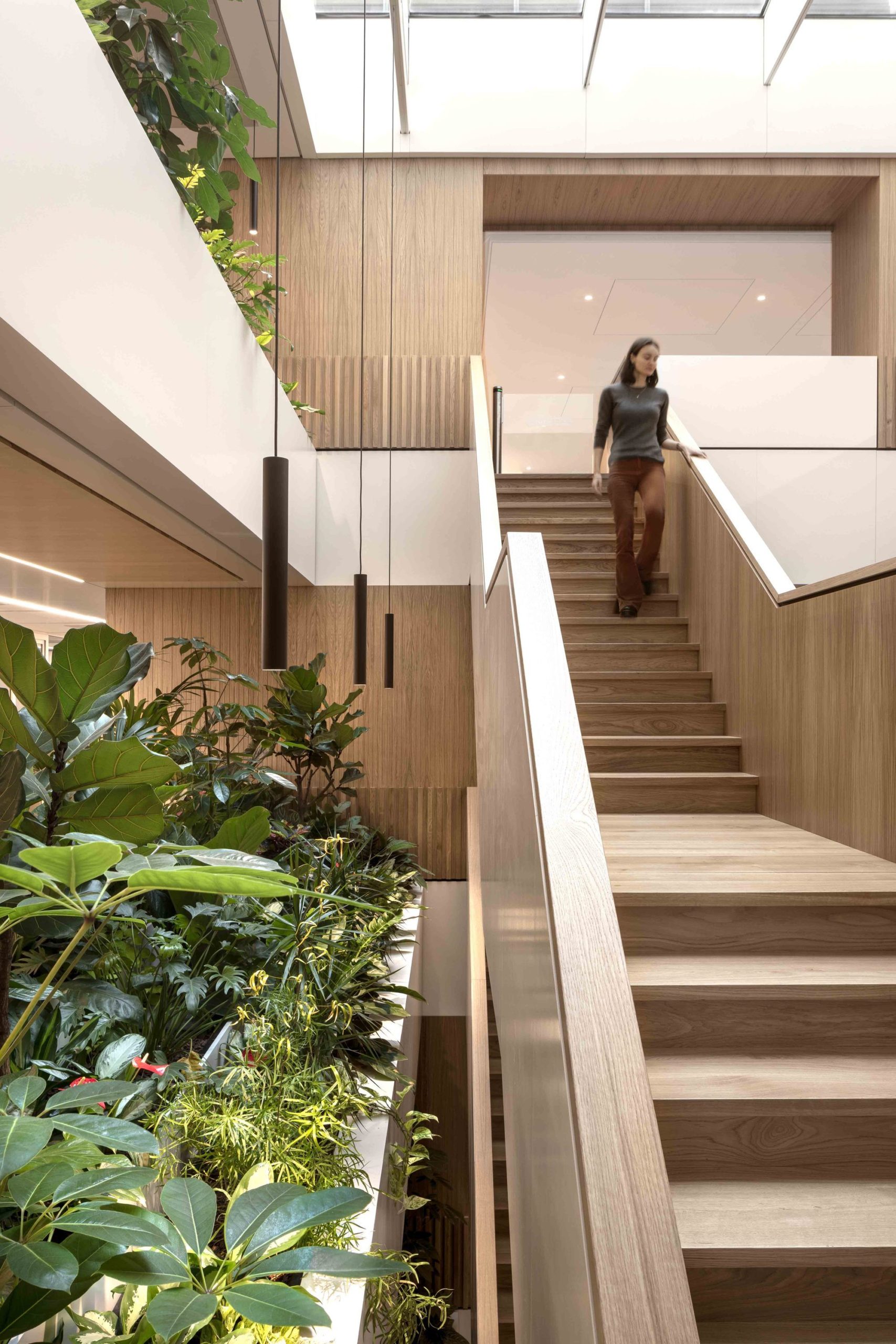 With ‘House of Dentons’ a work environment has been created to offer security and comfort while at the same to function as a stage for talent to excel on. There has been opted for a natural palette of materials, in which strong contrasts are alternated with transitions within the nuance of different kinds of woods.