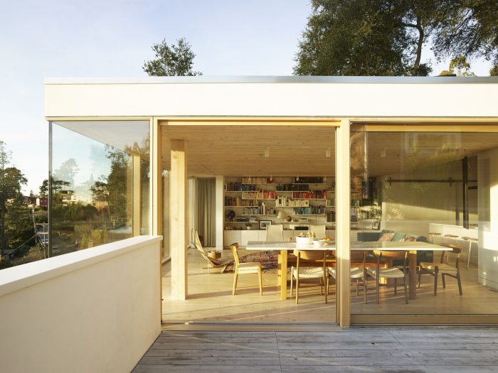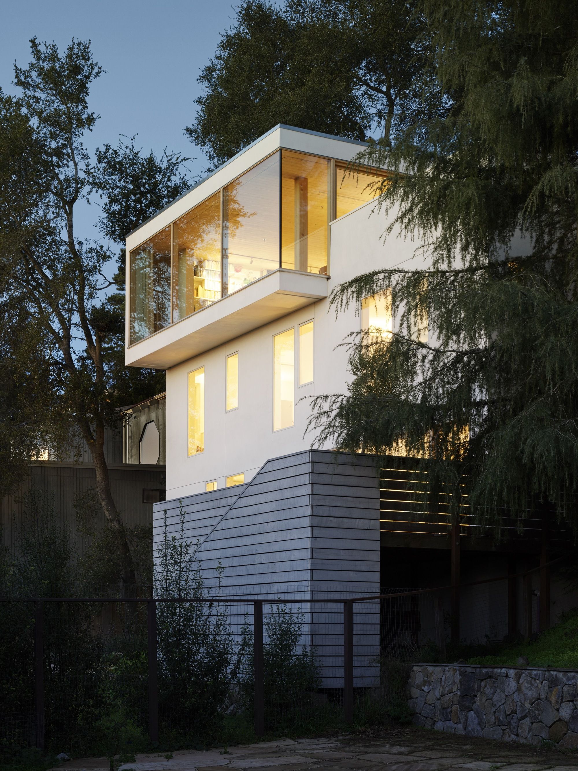 Located in the Berkeley Hills, on a steep incline facing panoramic views of the San Francisco Bay, the design of this three-level house is guided by seismic constraints, topography, micro-climate, sun path, and the property’s protected oak trees. To address the risks of earthquakes and landslides, the house is built on grade beams resting on concrete piles embedded in bedrock, avoiding the complexity and expense of excavation and retaining walls. The design includes the first use of residential seismic damper frames which slow the response of the structure in a seismic event and allow it to withstand the maximum predicted earthquake with minimal damage.